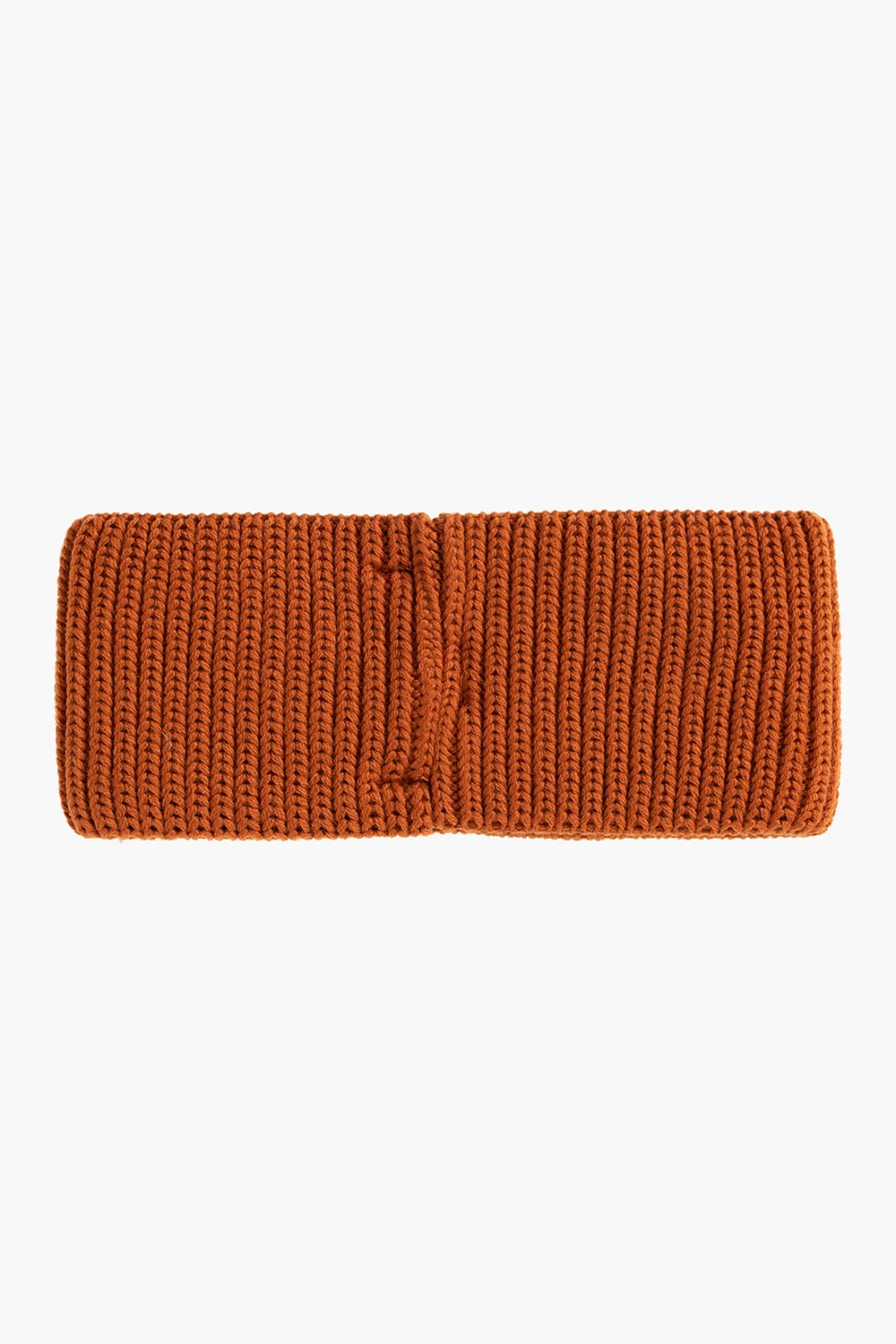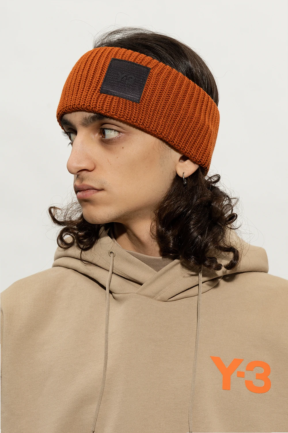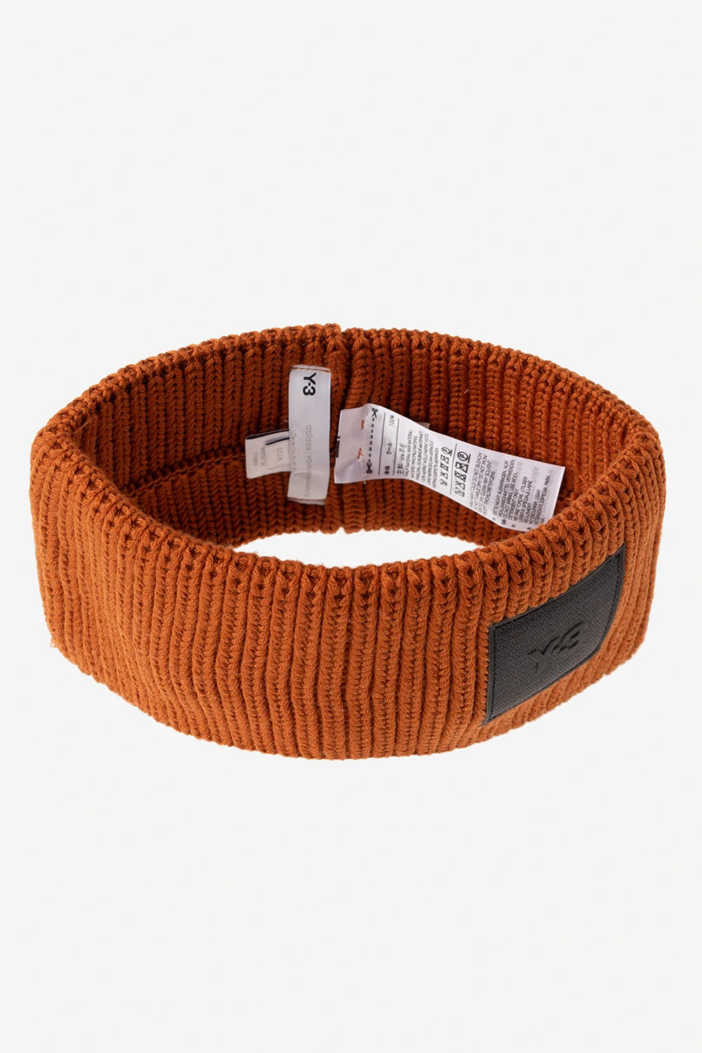 Brownish orange knitted headband with a black patch and raised logo from Y-3 Yohji Yamamoto. Made of merino wool.