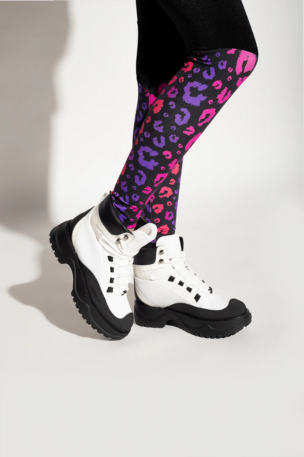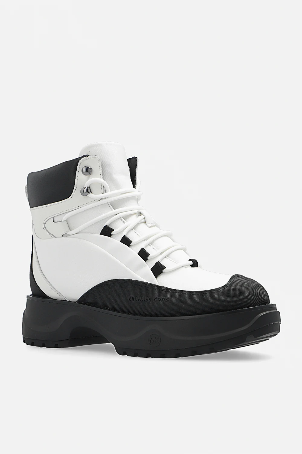 White and black ‘Dupree Hiker’ ankle boots from Michael Michael Kors. Crafted from fabric and trimmed with rubber, this lace-up model features tactile branding on the side and a black rubber sole at the base.