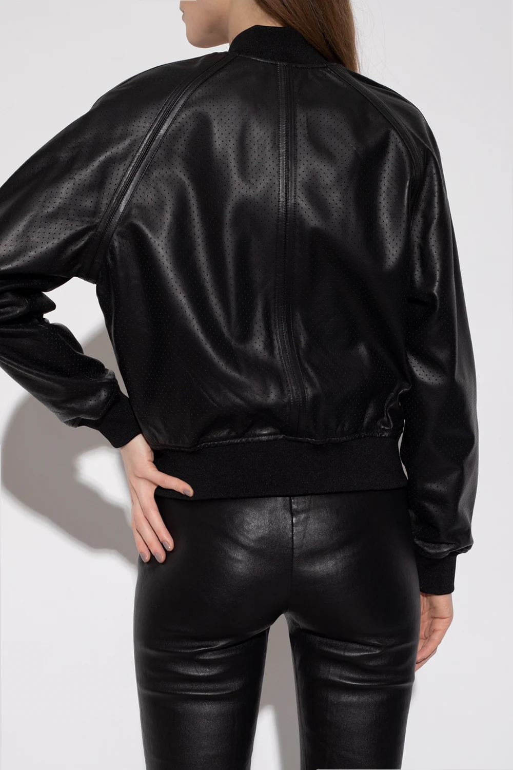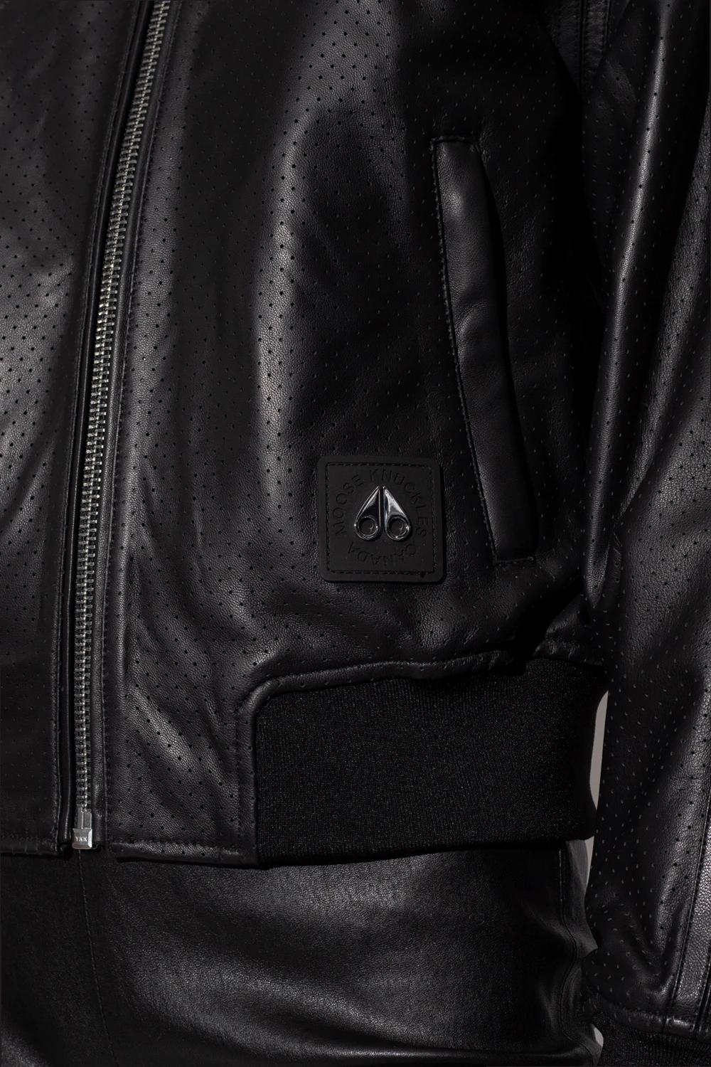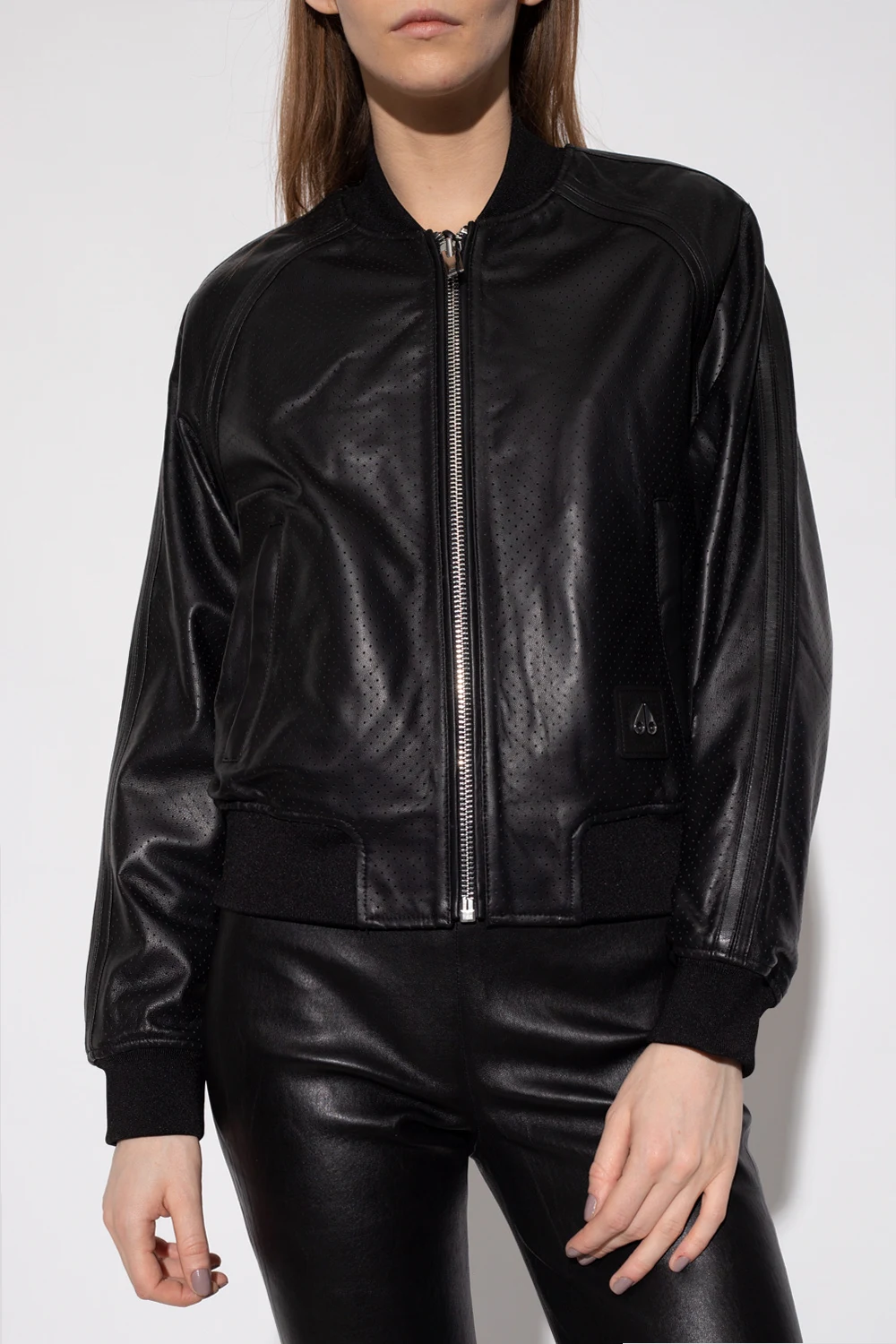 Black bomber jacket from Moose Knuckles. Crafted from perforated lamb leather, this style features a zip fastening, two zipped pockets accompanied by a logo application on the front and rib detailing on the collar, bottom hem and cuffs.
