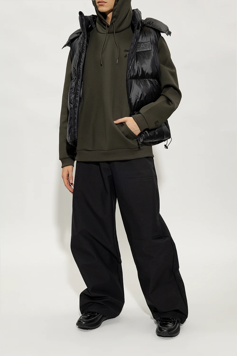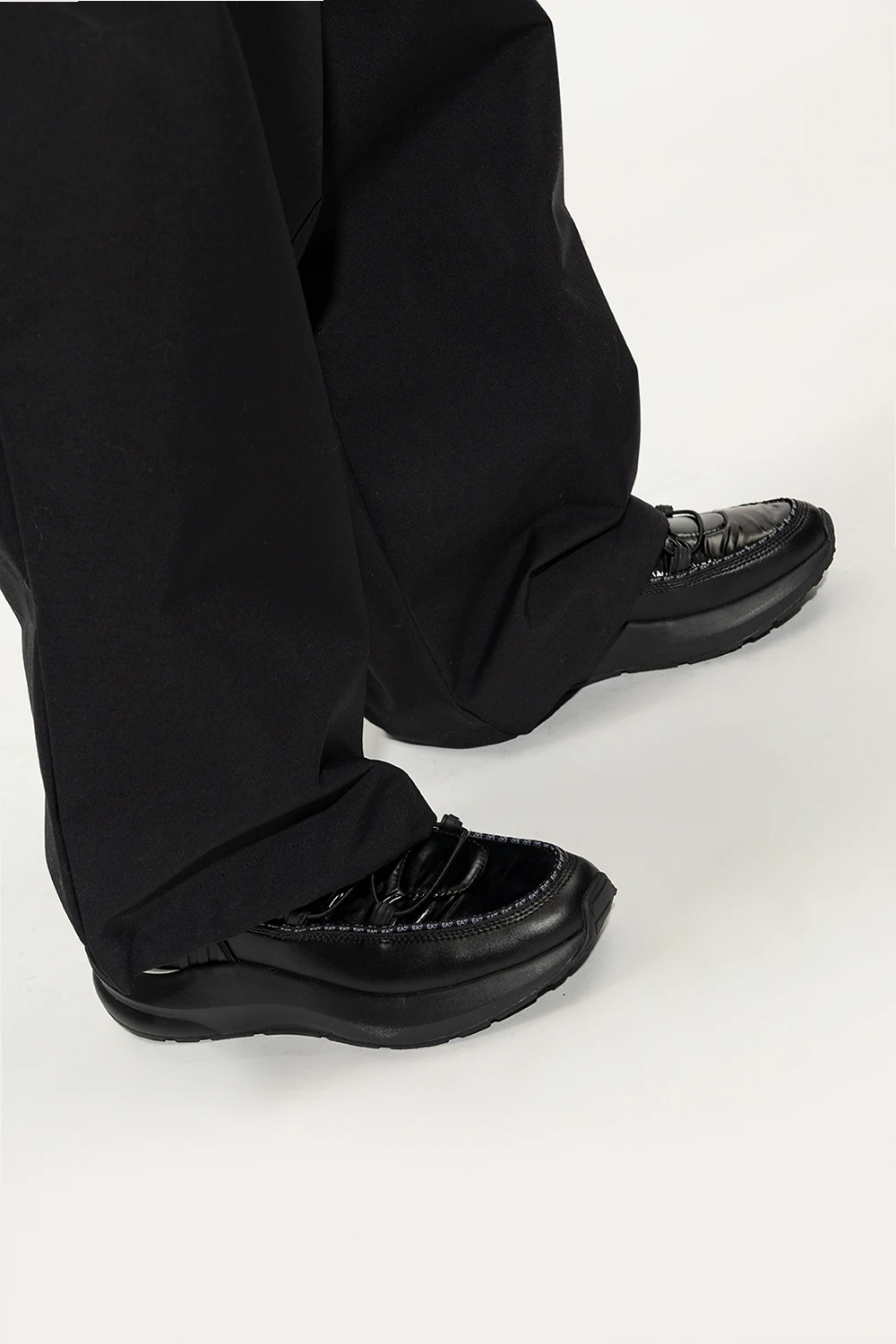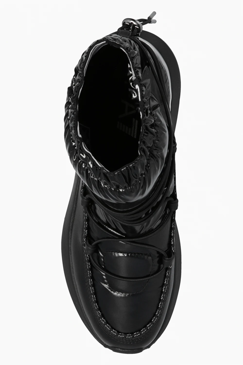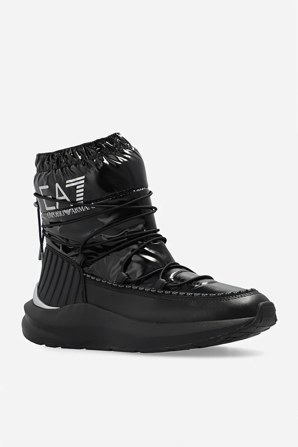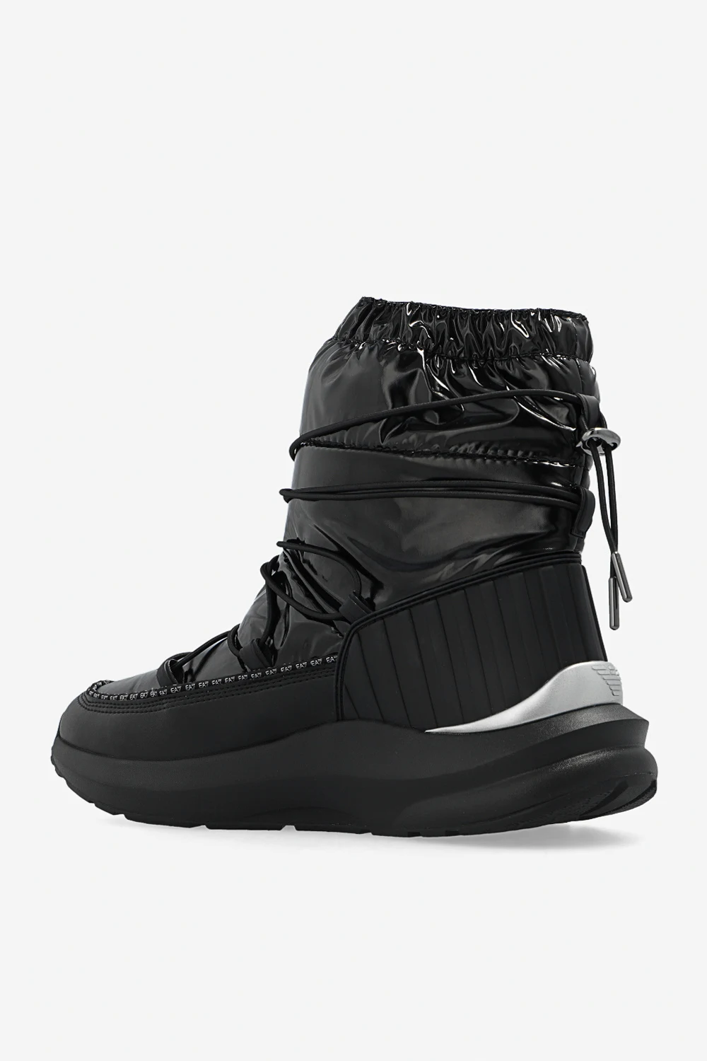 Black snow boots from EA7 Emporio Armani. Crafted from glossy material, this model features faux-leather trimming, back drawstrings, a silver-tone logo print and a black rubber sole.
