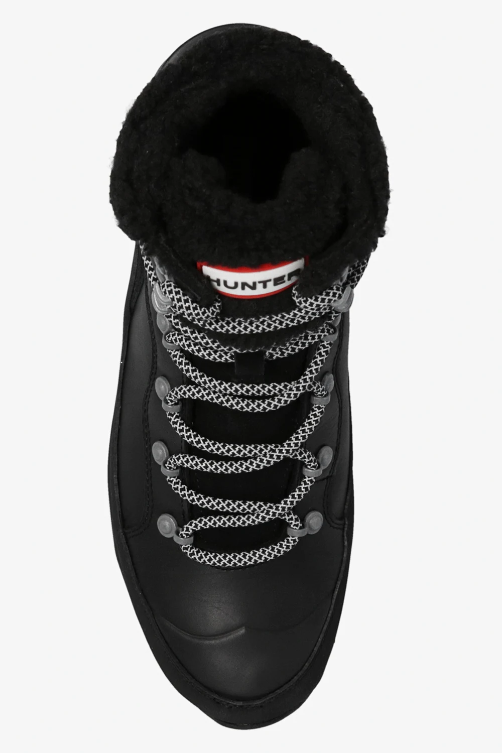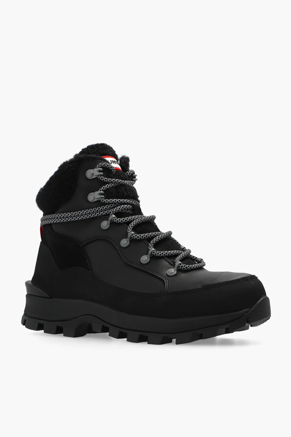 Black ‘Explorer Mid’ hiking boots from Hunter. Crafted from leather and recycled nylon, this lace-up model features a logo patch, reflective shoelaces, a recycled lining and a high-grip TPU rubber midsole and outsole, which has deep tread to ensure mud release with every step. Rated to withstand temperatures as low as -20°C (-4°F).