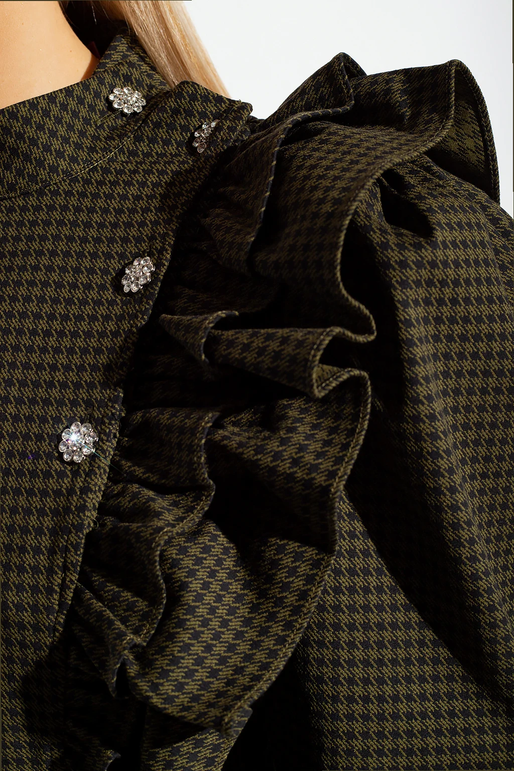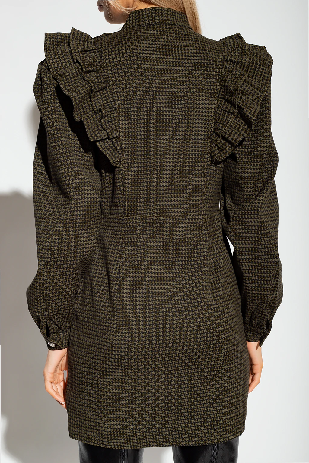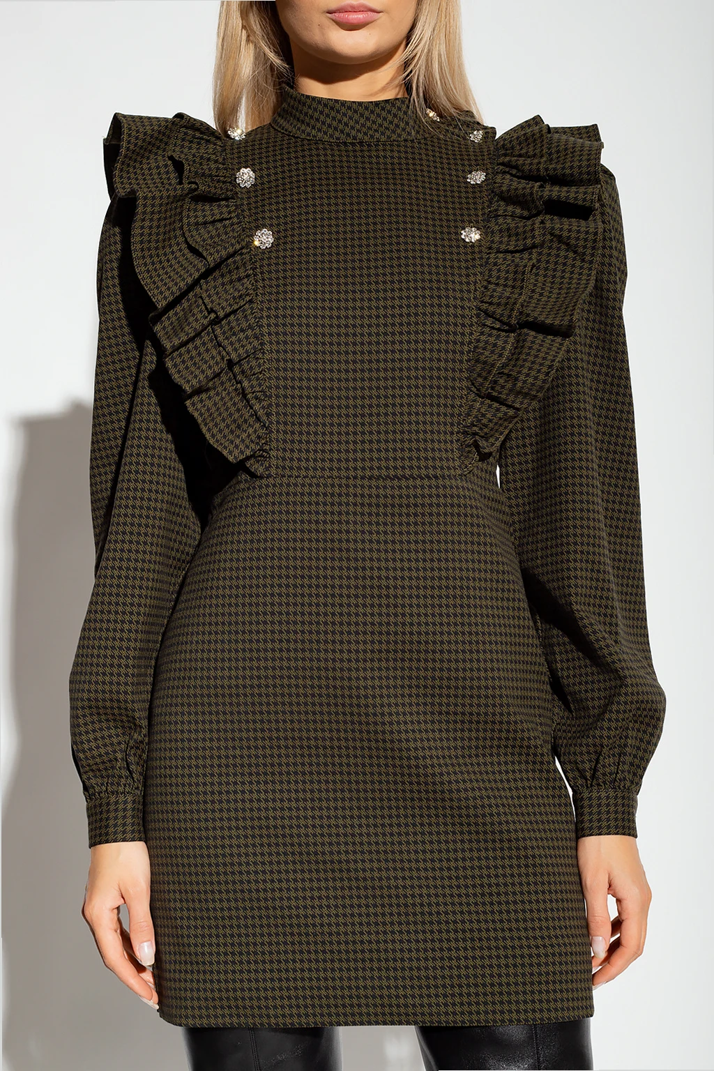 Green and black ‘Ketty’ mini dress from Custommade. Crafted in part from cotton, this style showcases a houndstooth pattern. It is complete with a hidden side zipper, a detachable front panel with flouncy details and a standing collar, the brand's signature bejewelled buttons, long blouson sleeves and a skirt with two slip pockets.