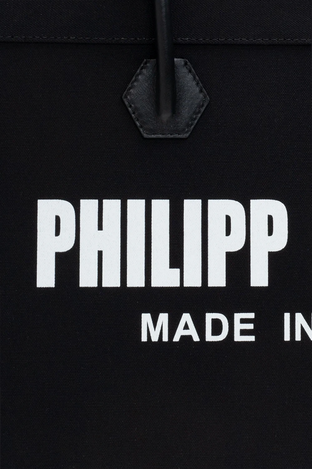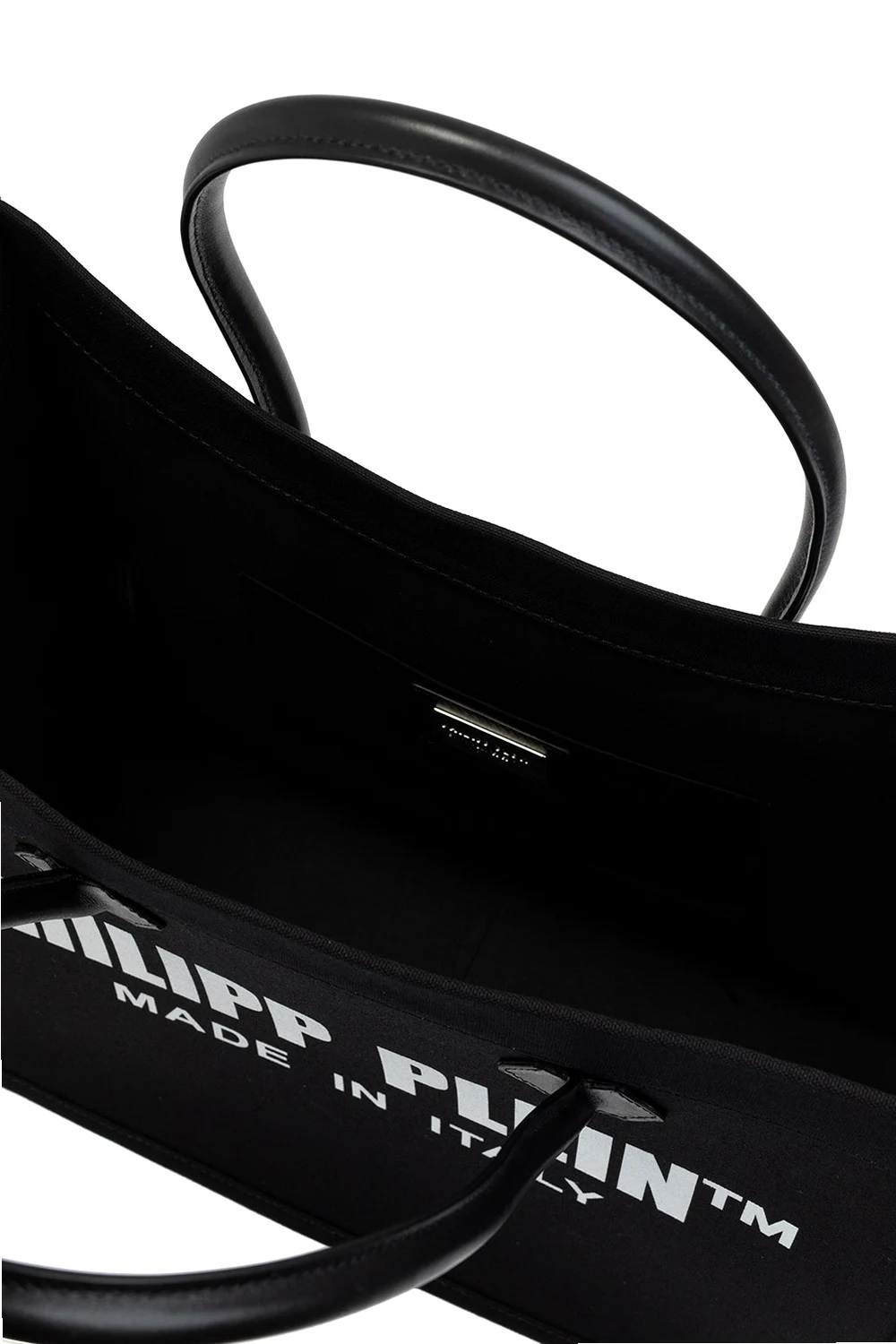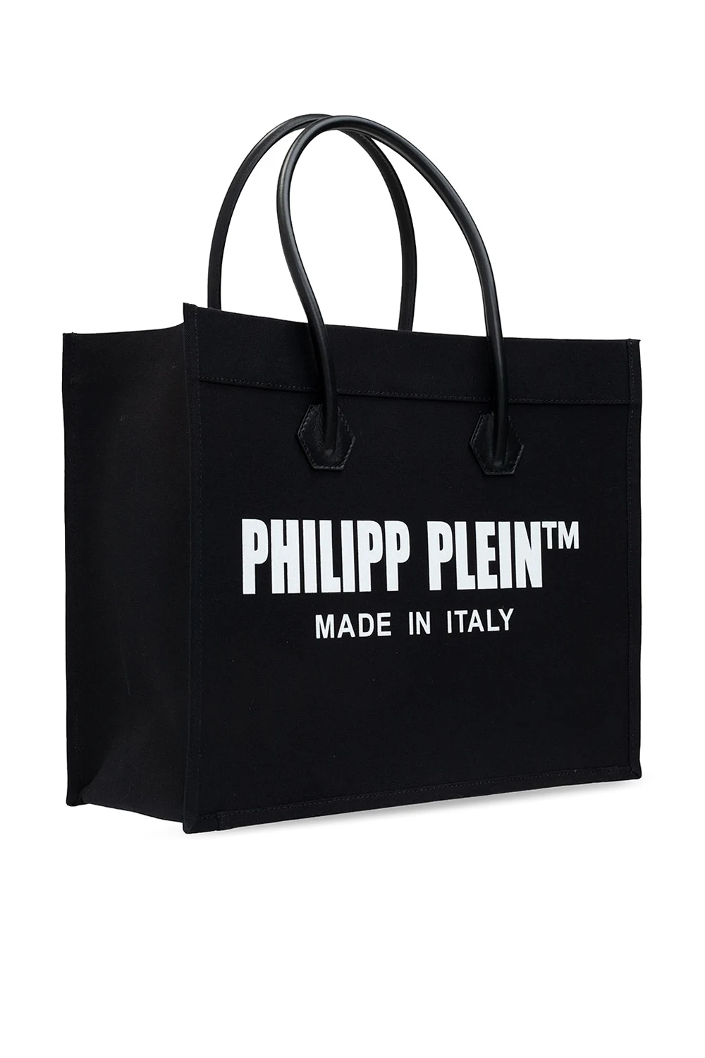 Black shopper bag from Philipp Plein. Crafted from canvas, this design comes with the designer's logo printed in white on the front. It is complete with two half-round leather handles and one internal compartment with two slip pockets.