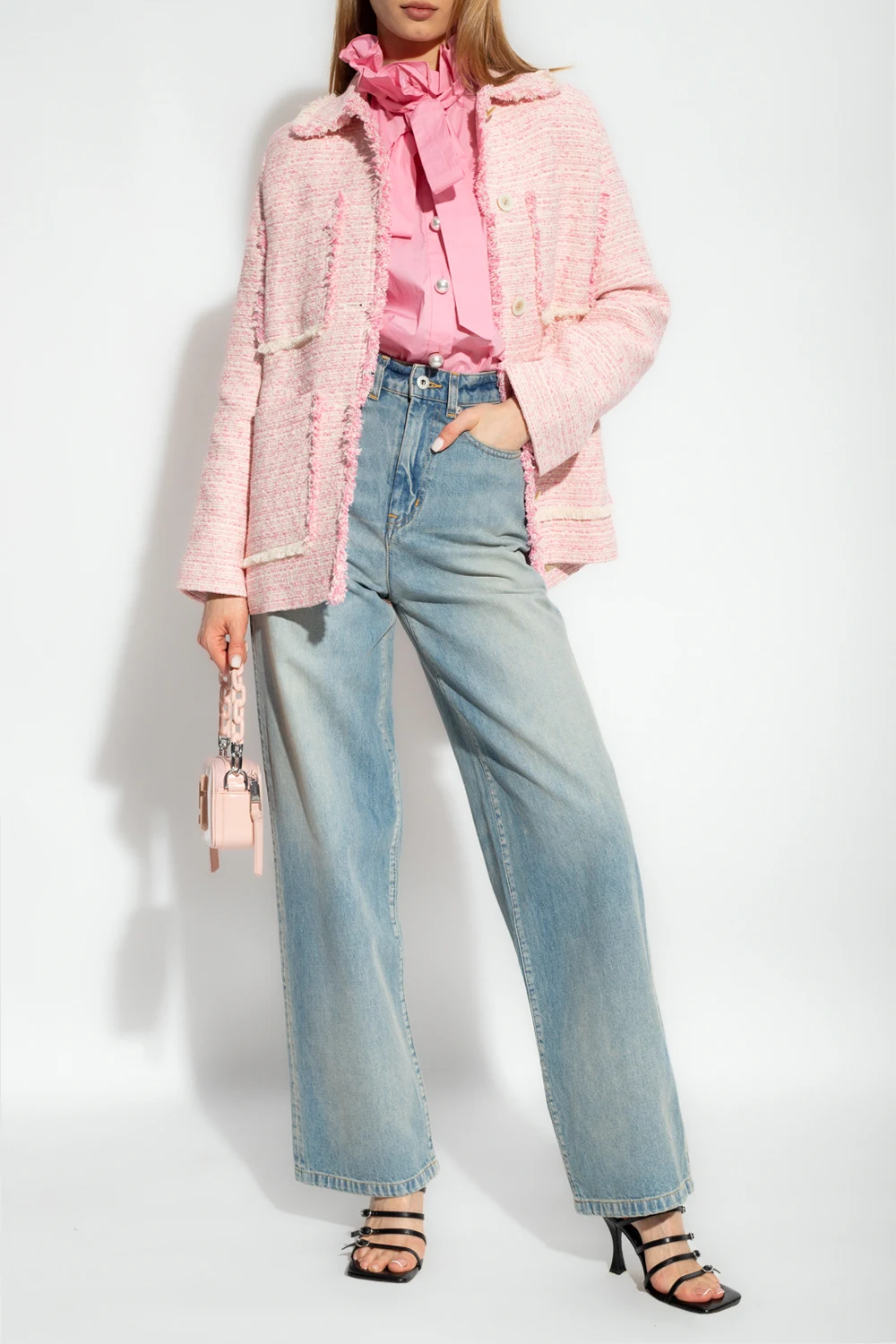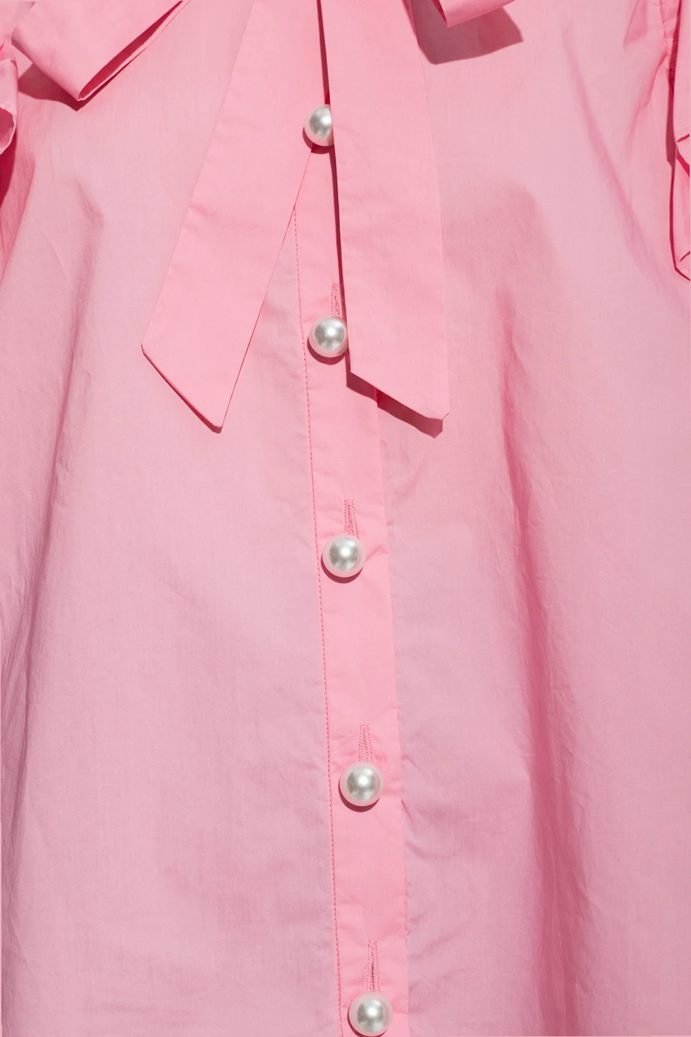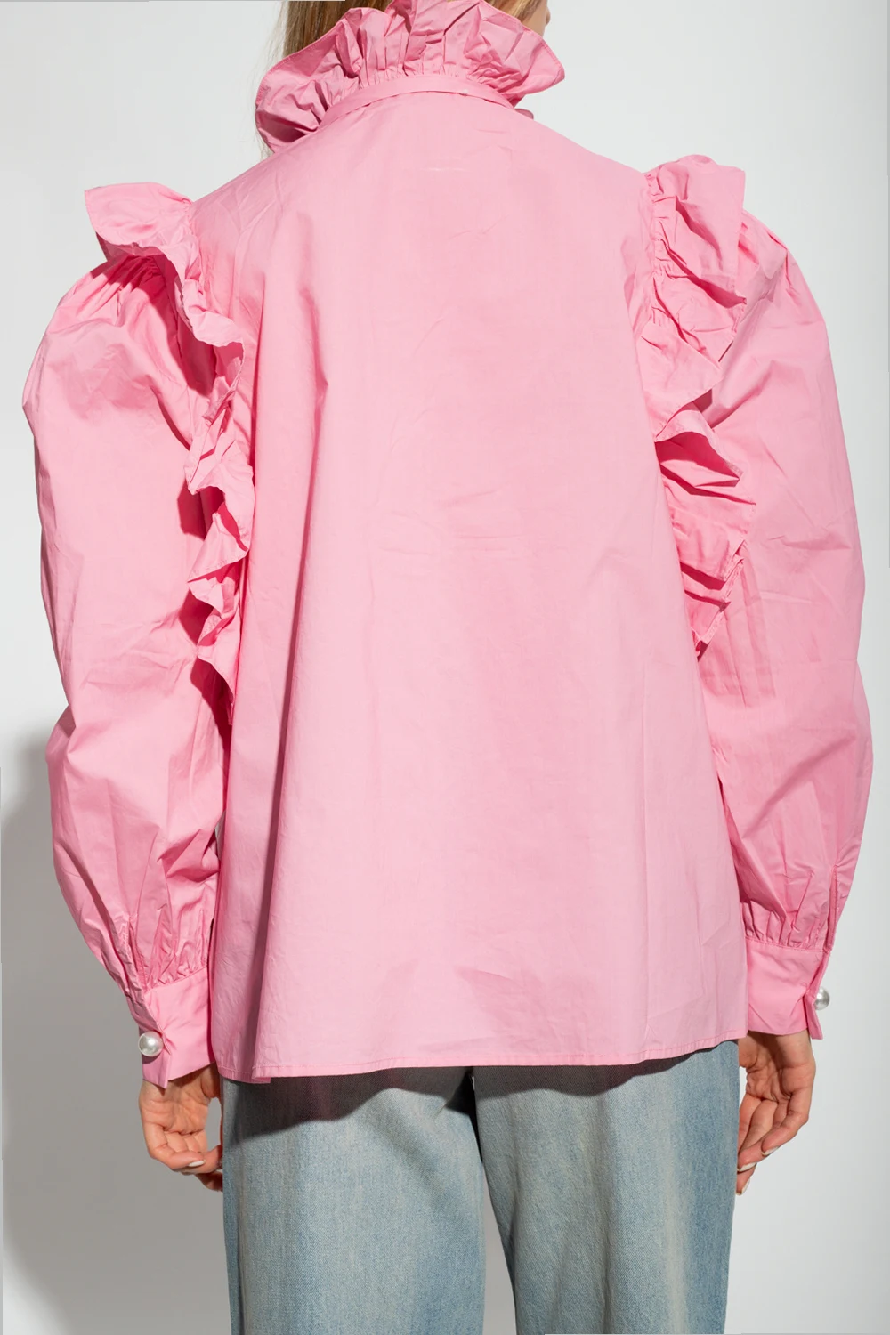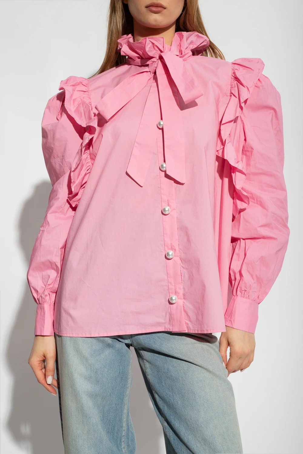 Pink ‘Denja’ shirt from Custommade. Crafted from organic cotton, this design features decorative button fastenings, long puff sleeves and ruffle trimming.