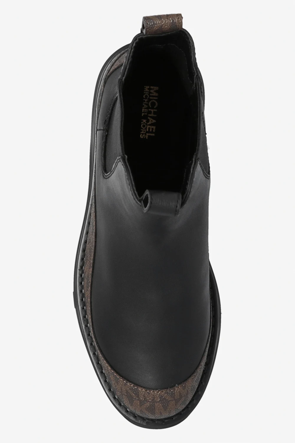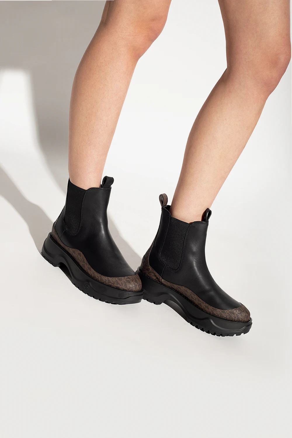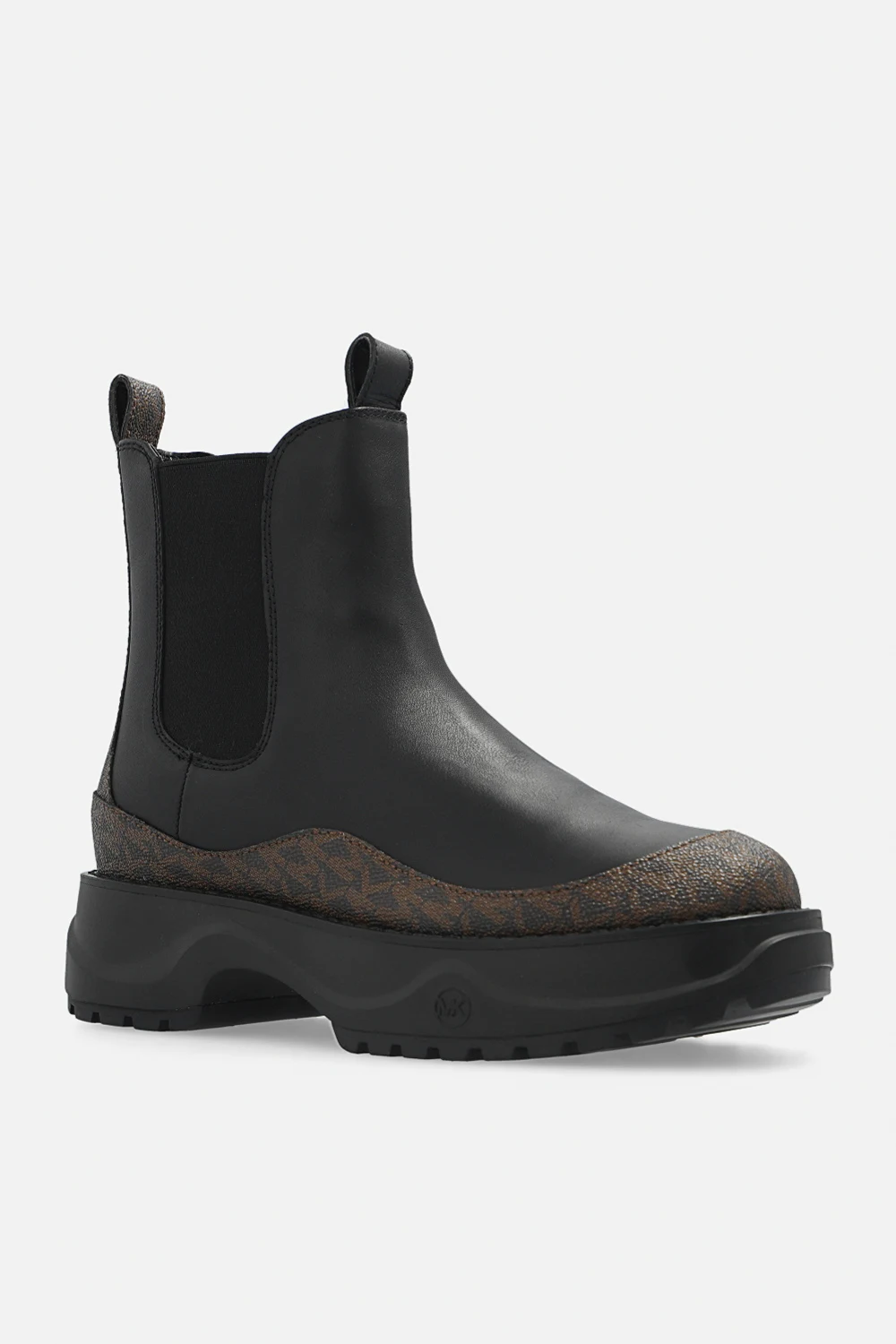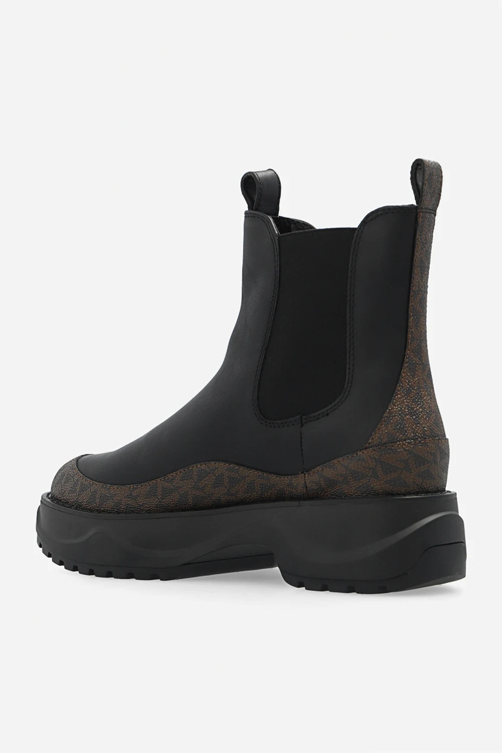 Black and brown ‘Dupree’ ankle boots from Michael Michael Kors. Crafted from leather, this model features a monogram pattern, elastic panels on the side and a black rubber sole at the base.