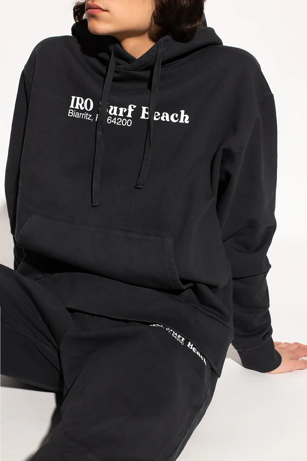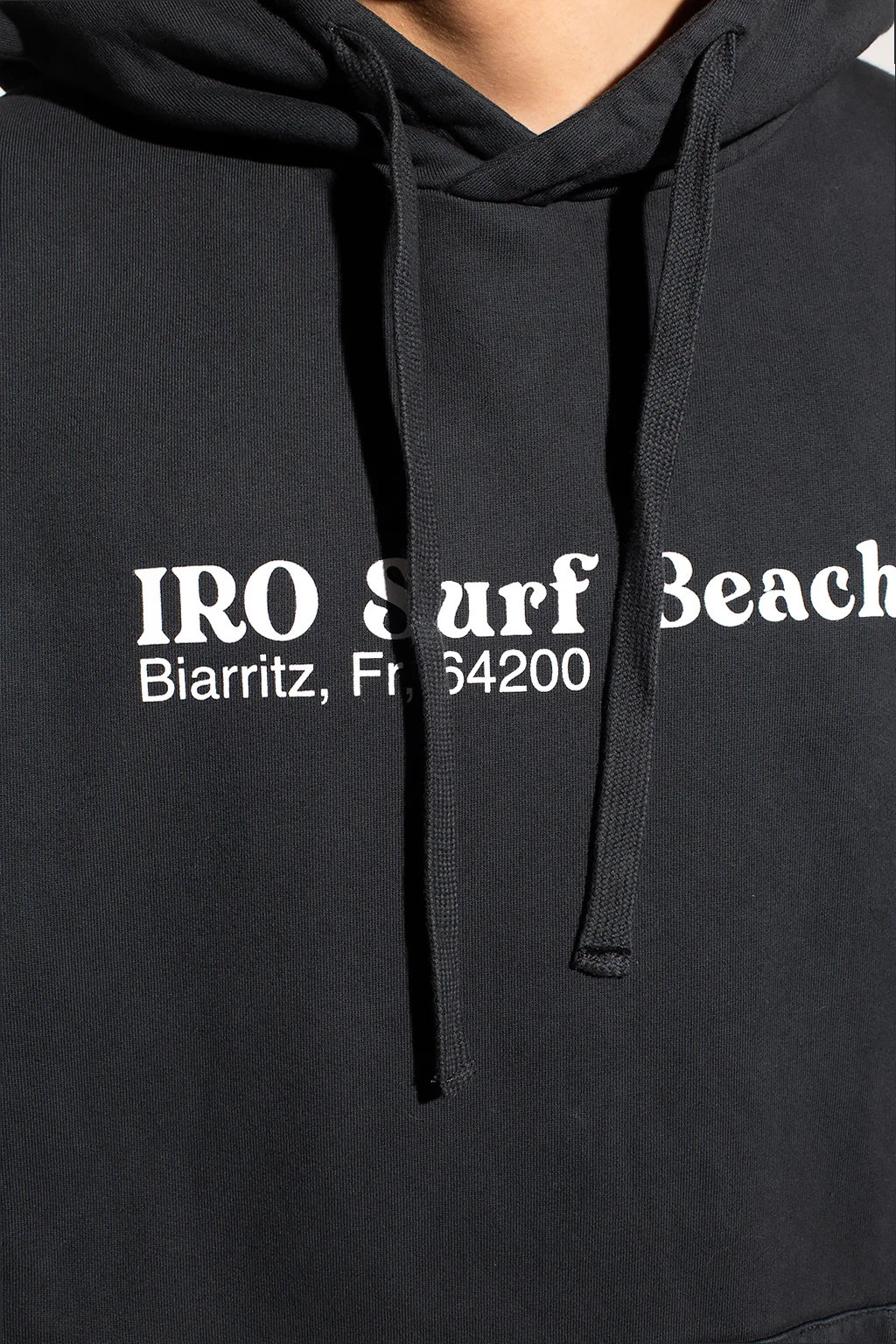 Dark grey sweatshirt with a drawcord-adjustable hood from Iro. Crafted from cotton jersey, this hoodie showcases a white graphic print with the brand's logo, a kangaroo pocket and ribbed trims.
