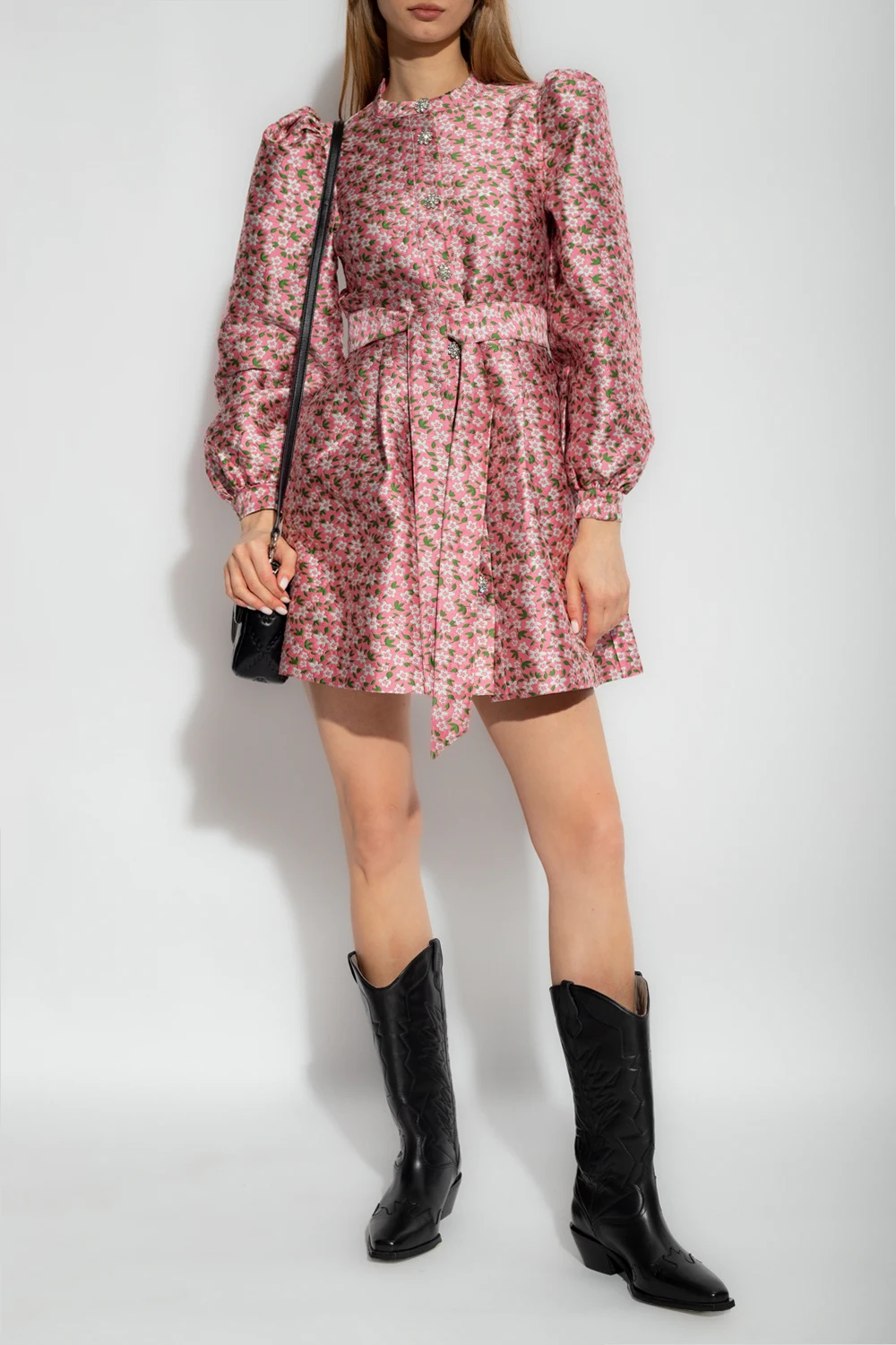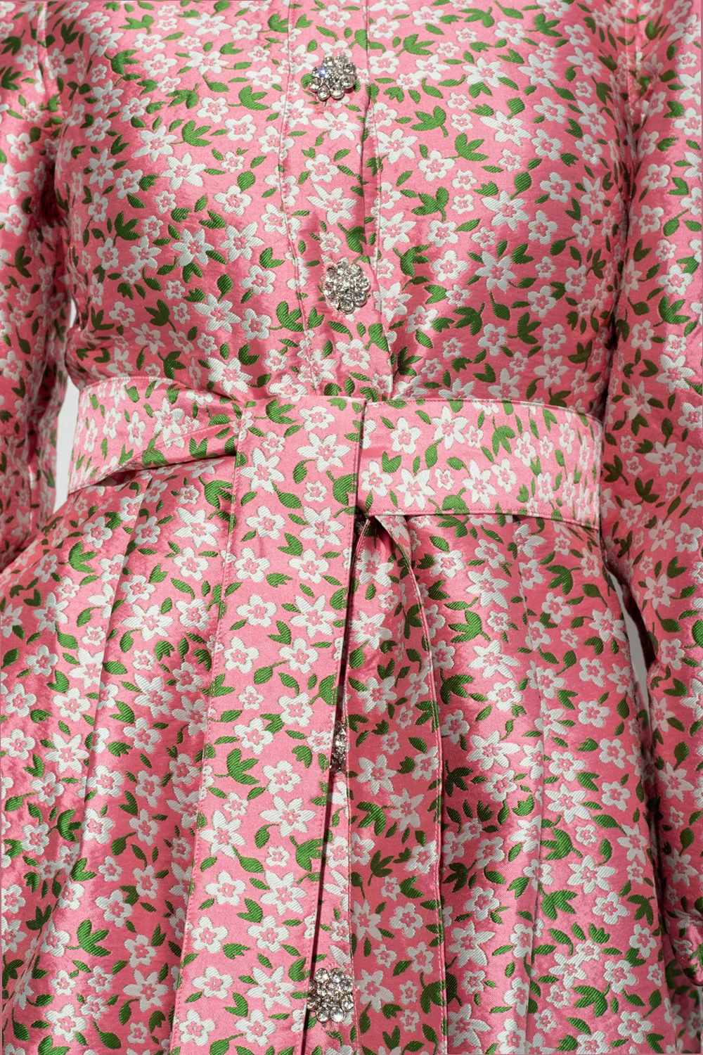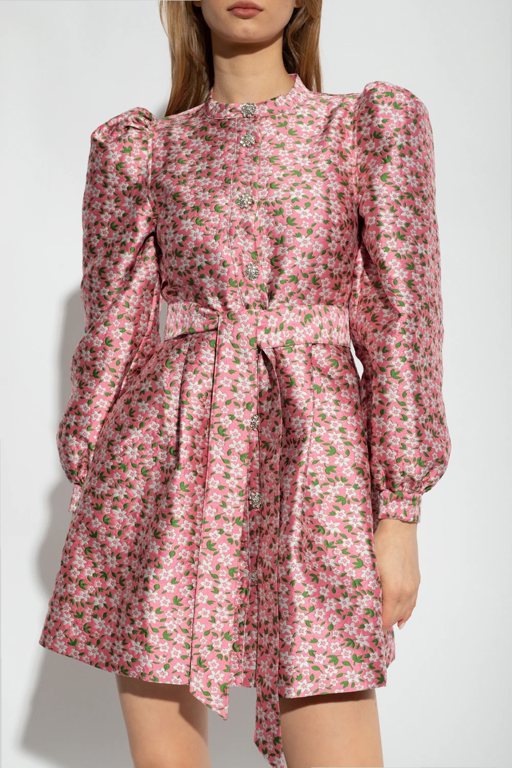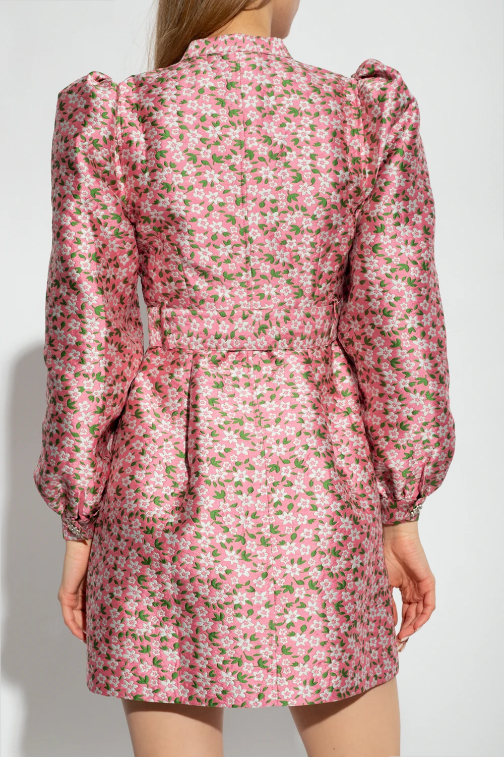 Pink, green and grey ‘Lynett’ jacquard dress from Custommade. Fastened with buttons, this design features a floral pattern, puff sleeves and two slip pockets.