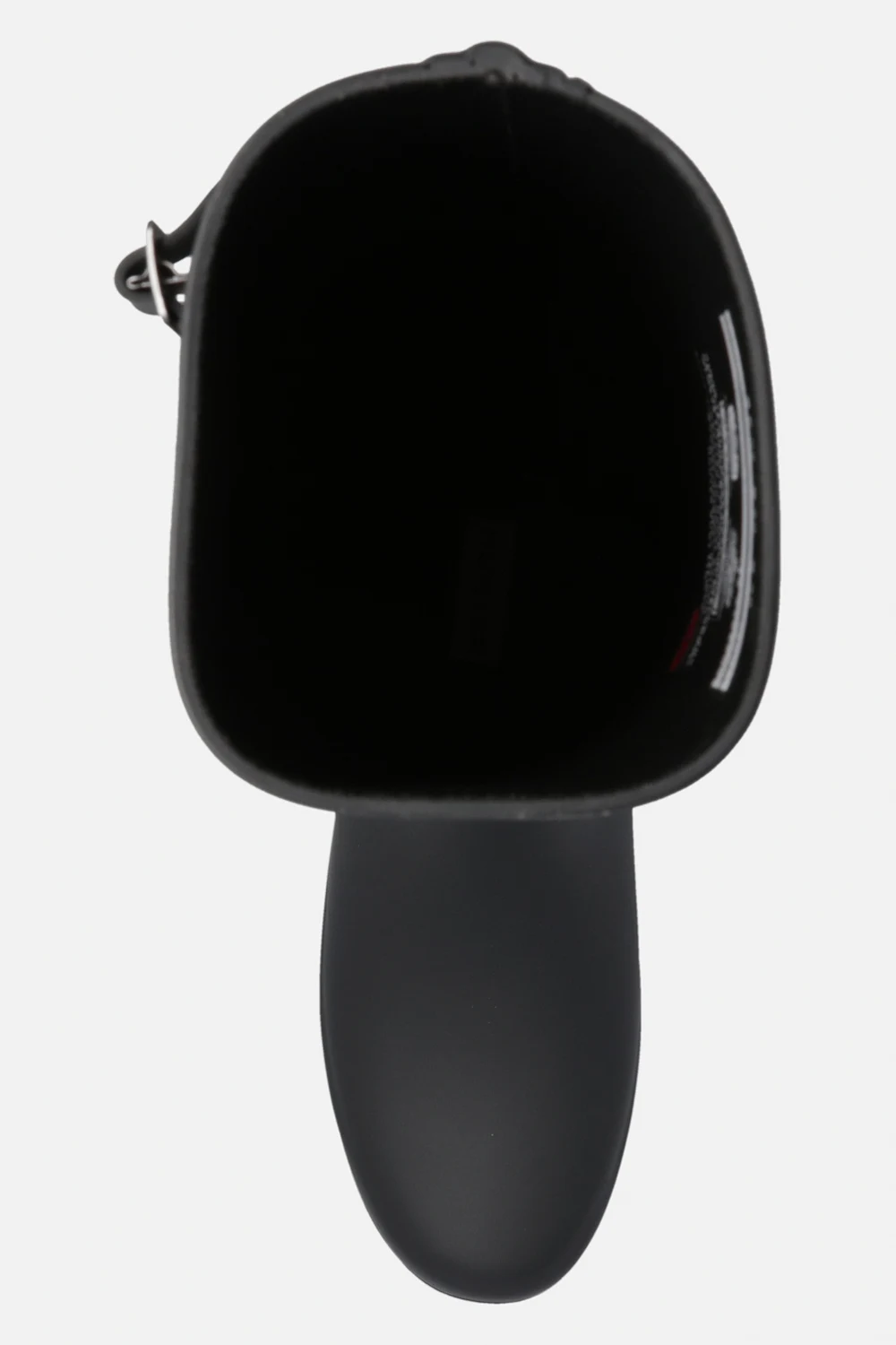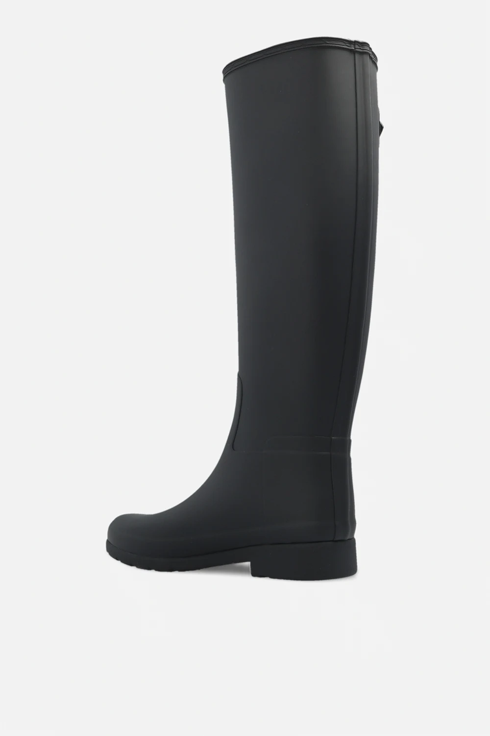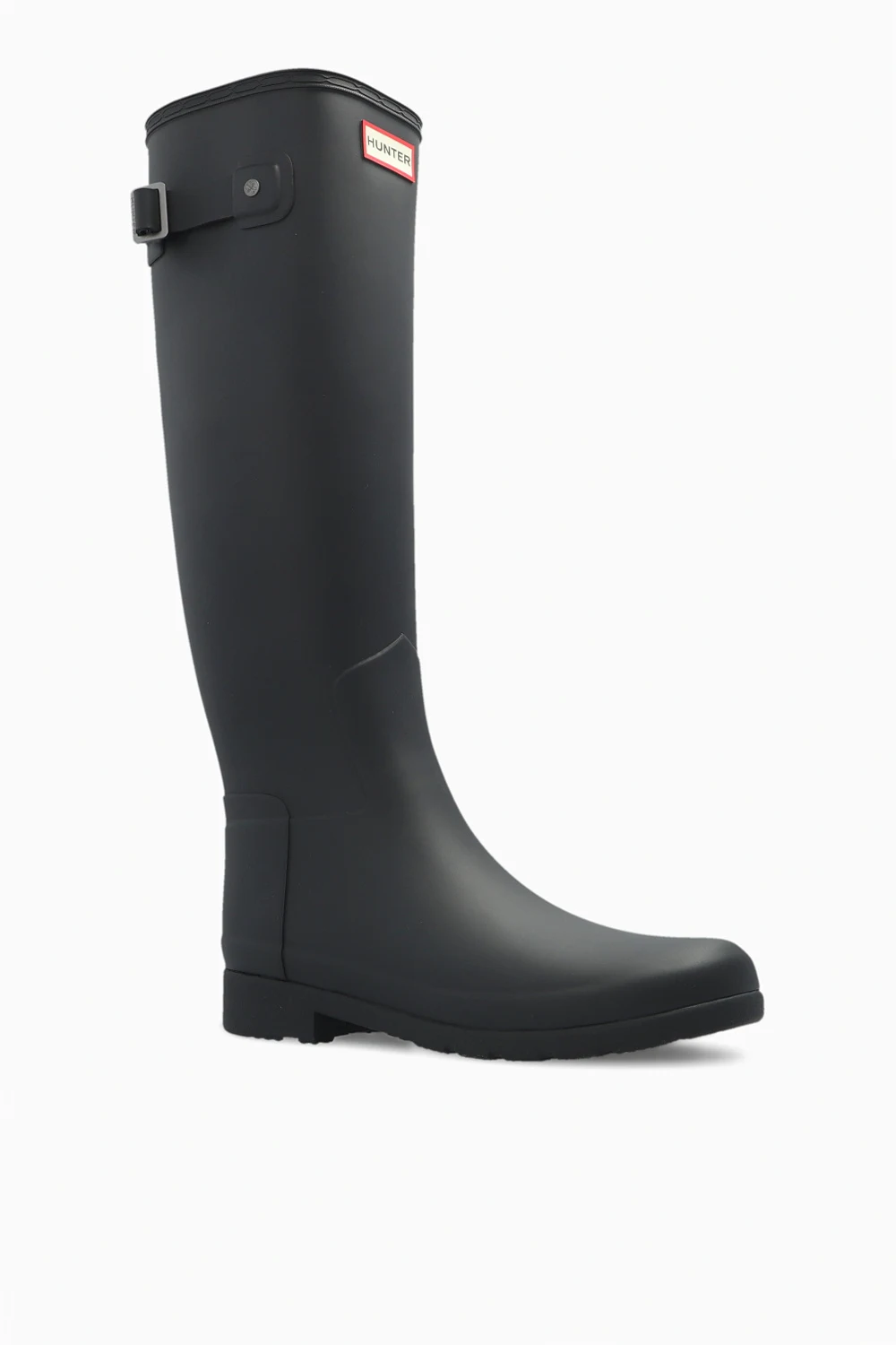 Black ‘Refined Tall Wellington’ rain boots from Hunter. Handcrafted from fewer rubber layers for a lightweight feel, this pair is complete with a red, cream and black logo detail, matte finish and black rubber sole.