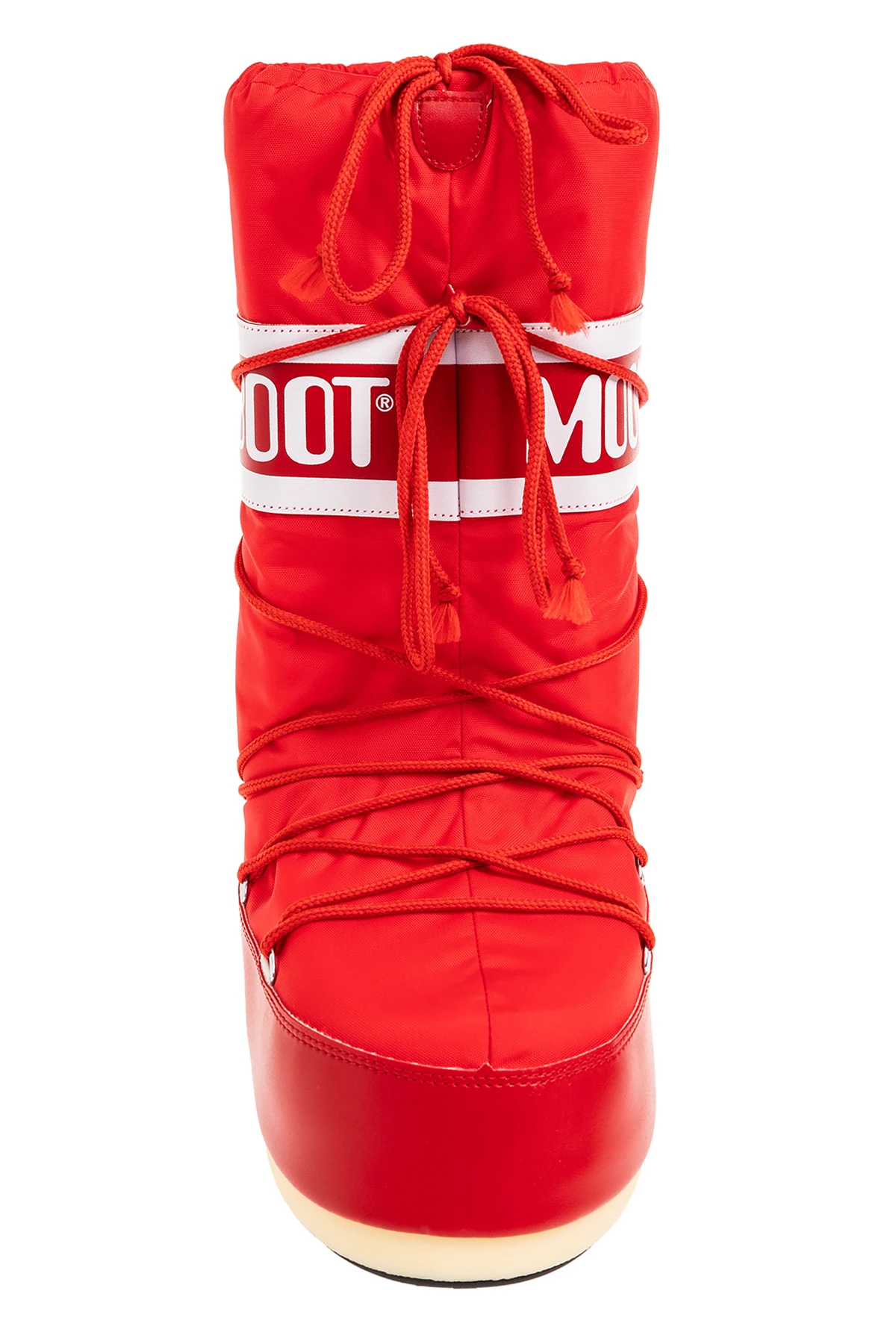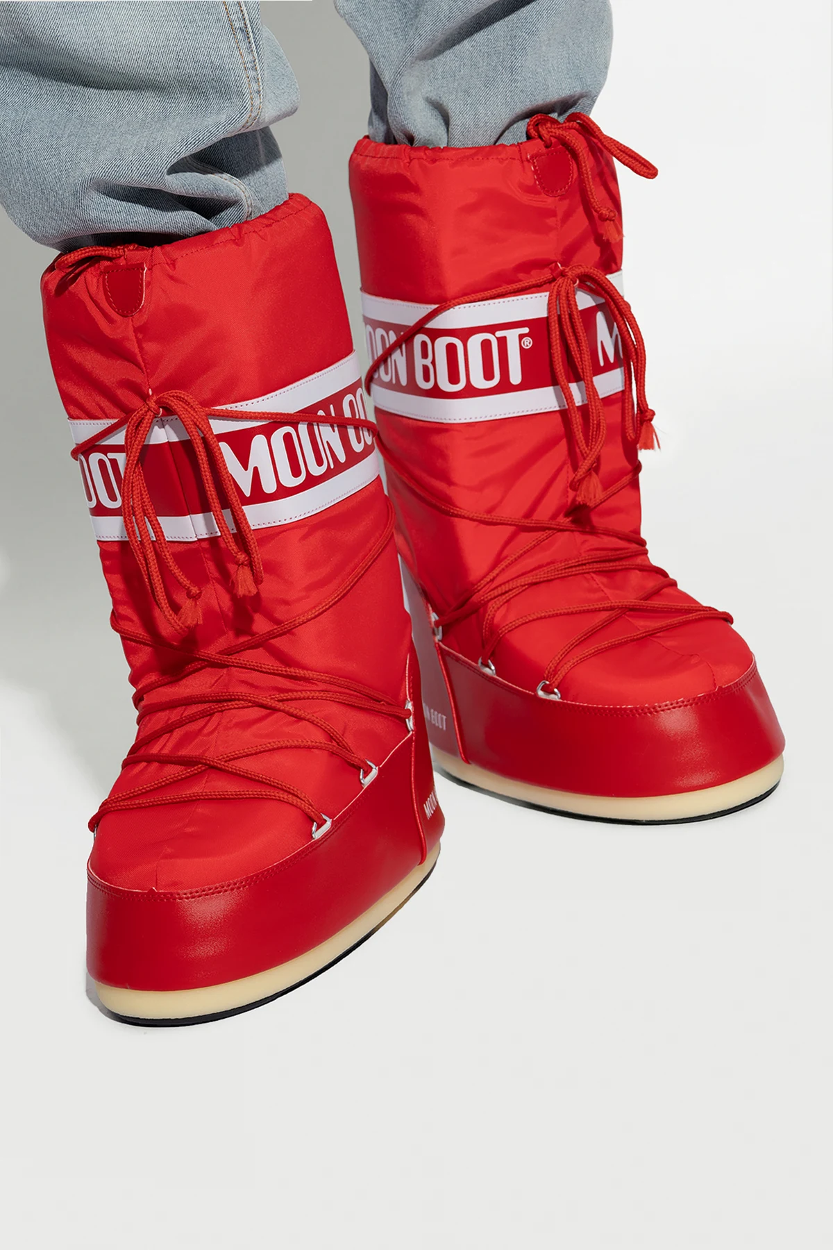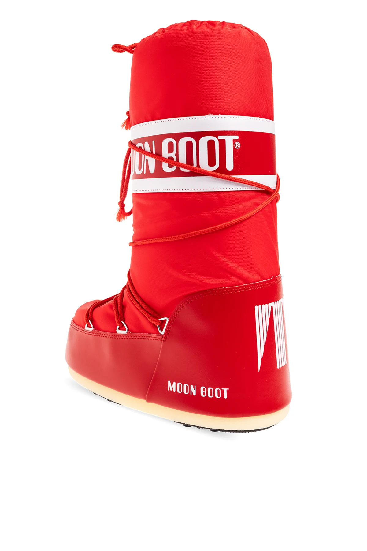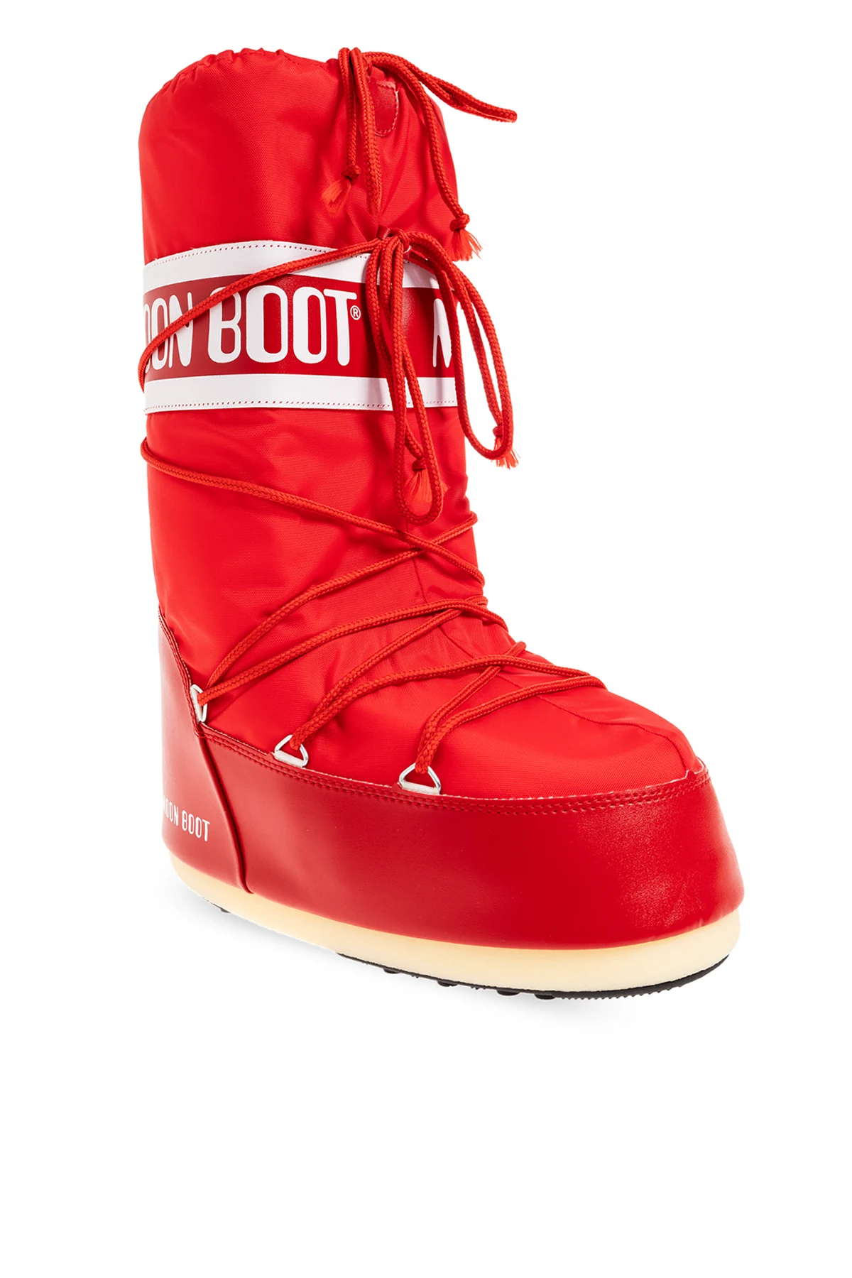 Red ‘Icon’ snow boots from Moon Boot. Made of waterproof synthetic material, this lace-up model sits on a cream and black thermoplastic rubber tread sole and features a drawstring upper decorated with white logo prints. Inspired by the footwear worn by astronauts during the 1969 lunar landing, this project combines technical features with a contemporary look.