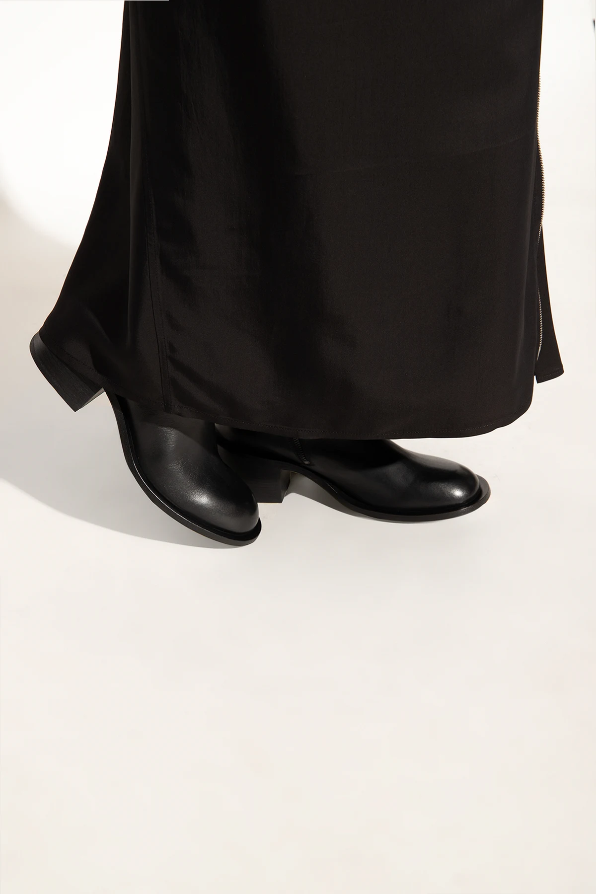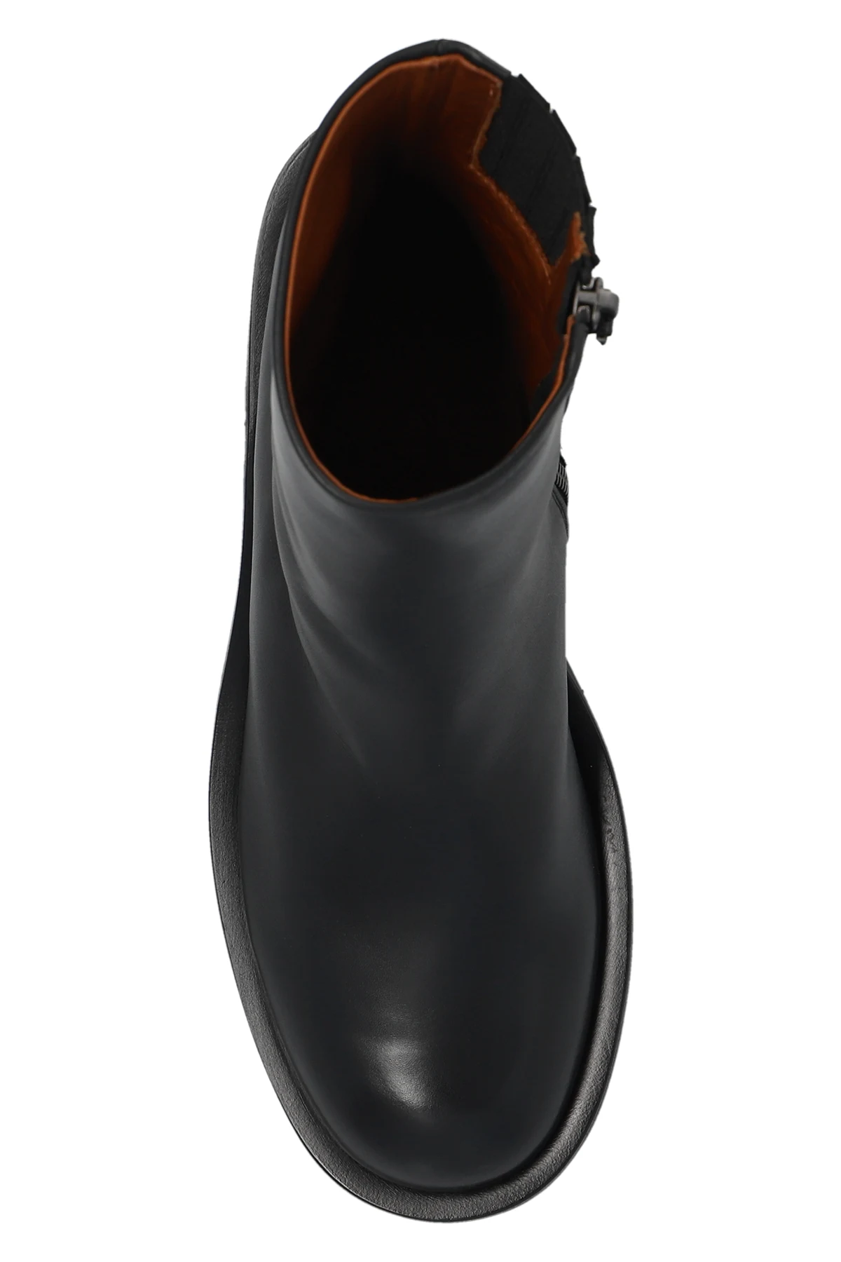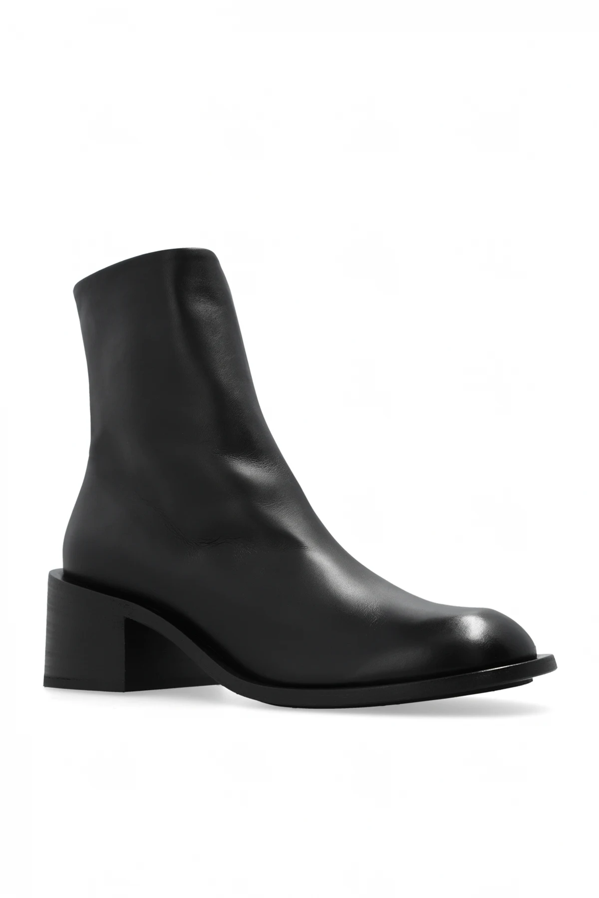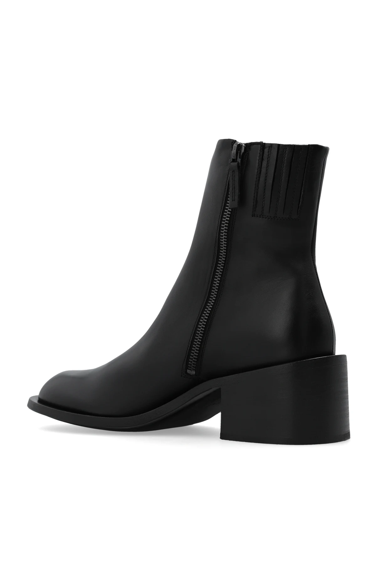 Black ‘Allucino’ heeled ankle boots from Marsell. Made of leather, this model sits on a black rubber sole and features a side zipper and massive heel.