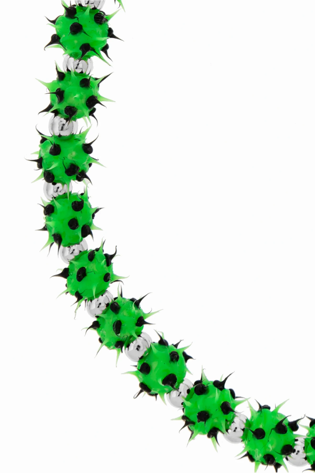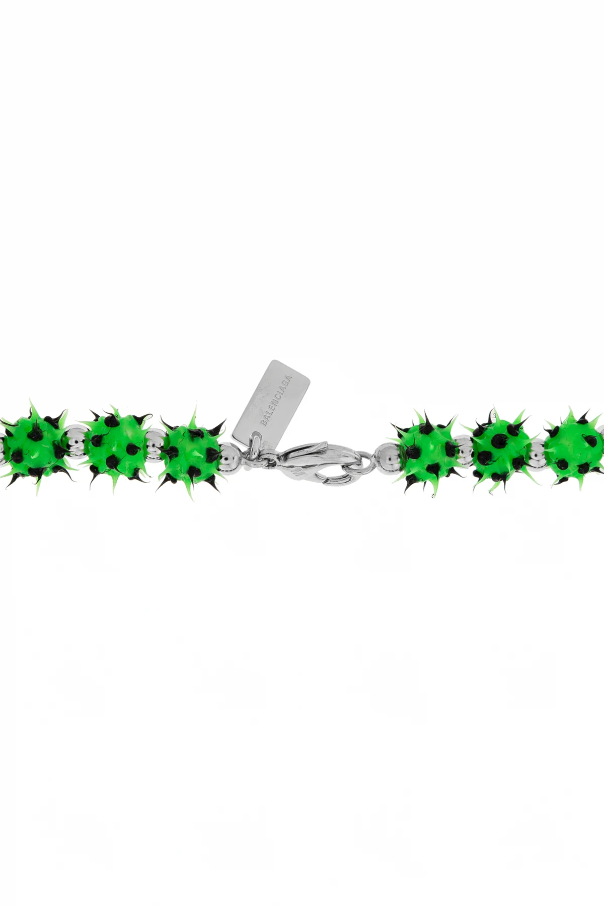 Discover the epitome of avant-garde elegance with the Logo Necklace from the exclusive Balenciaga collection. This exquisite choker, designed to sit closely around the neck, features a bold and distinctive design reminiscent of spiked spheres. Crafted meticulously from high-quality brass, plastic, and silicone, the necklace showcases vibrant green spiked beads adorned with subtle black accents, exuding a unique and edgy charm. The solid and secure metal clasp ensures both style and functionality. Presented in a striking green with silver and black highlights, this unisex piece is the perfect statement accessory for any sophisticated wardrobe. Why Choose This Product? Unique Design: The choker's spiked spherical elements make it a standout piece in any collection. High-Quality Materials: Crafted from durable brass, plastic, and silicone for lasting elegance. Secure Clasp: Features a reliable and stylish metal clasp for ease of wear. Versatile Style: Suitable for both men and women, adding a bold touch to diverse fashion ensembles. Exclusive Brand: Created by the renowned house of Balenciaga, known for merging couture craftsmanship with contemporary trends.