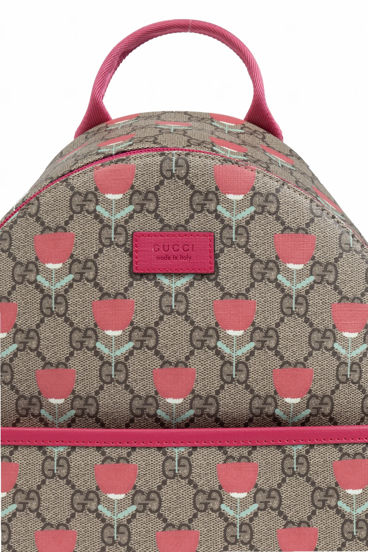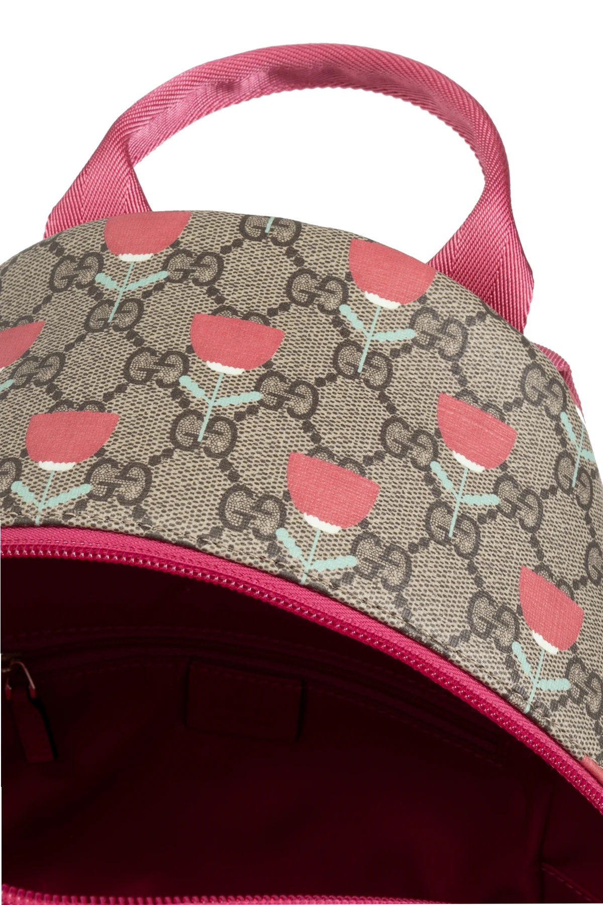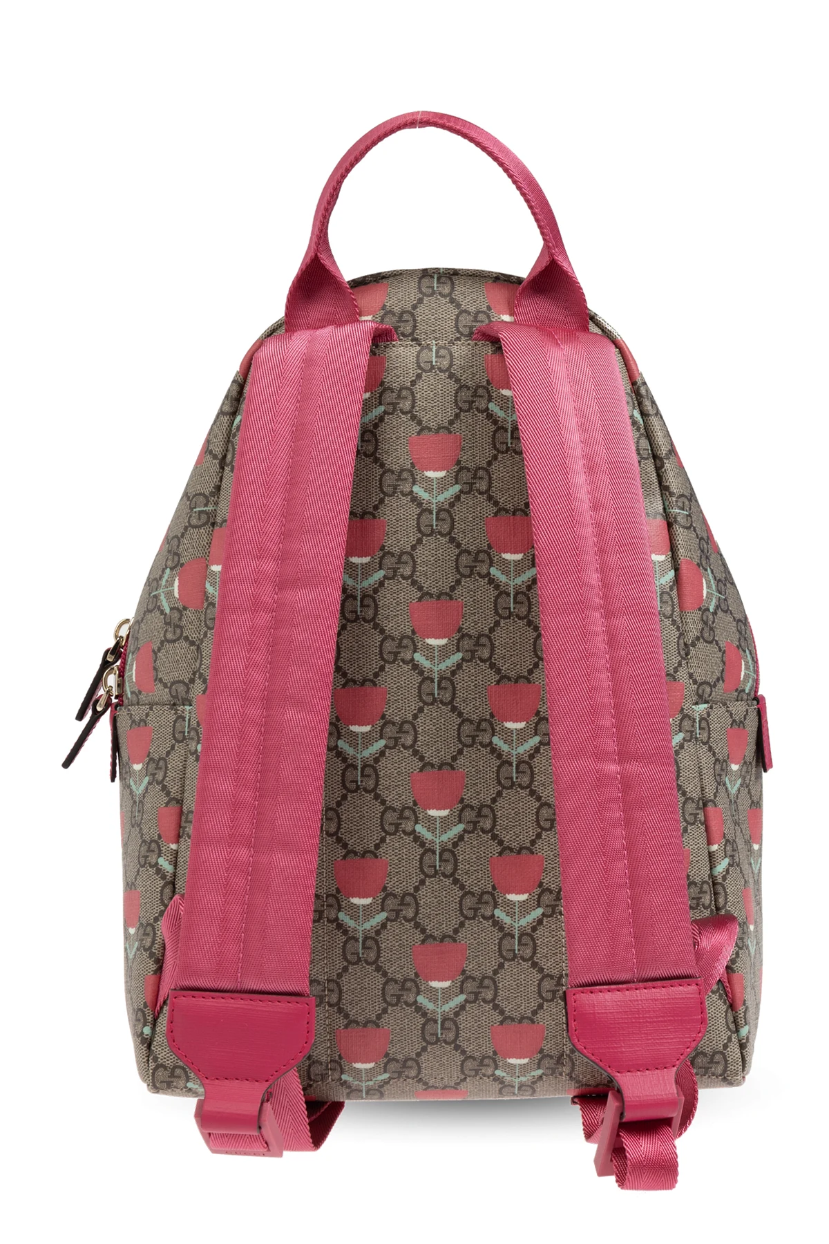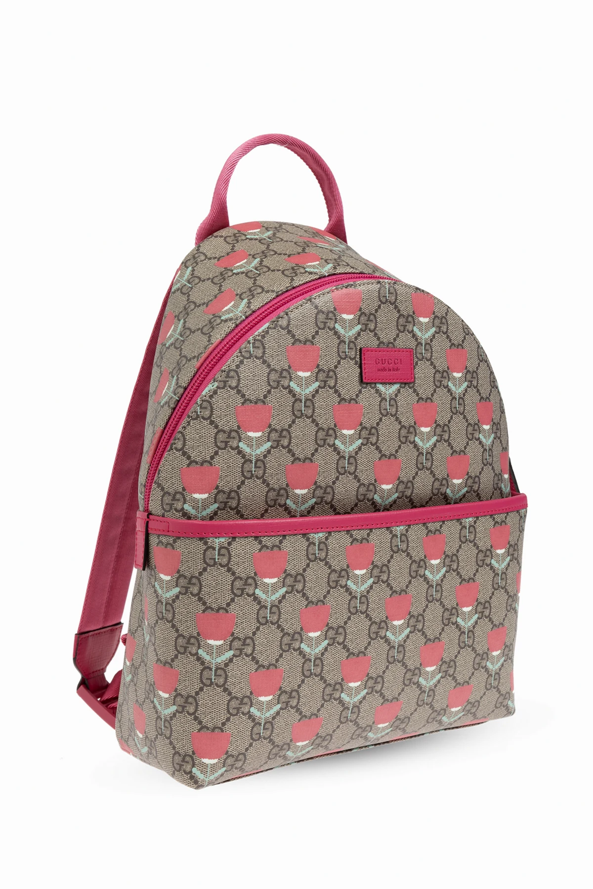 Introducing the Decorative Print Backpack, an exclusive accessory for children from the esteemed Gucci Kids collection. This backpack embodies both functionality and style, making it an impeccable choice for young fashion enthusiasts. Crafted with meticulous attention to detail, the backpack features a classic rectangular shape with a gently rounded top. The fabric is adorned with the iconic 'GG' pattern interspersed with delicate pink floral prints, exuding elegance and charm. The backpack is constructed from a durable blend of materials, ensuring longevity and resilience. The dominant beige hue is beautifully complemented by pink accents on the handles, straps, zippers, and edges, creating a harmonious and appealing design. A pink panel embossed with the brand’s logo graces the front, adding a touch of sophistication. For added convenience, the backpack boasts a spacious main compartment with a pink zipper closure, along with an additional front pocket for easy access to smaller items. The pink handle allows for hand-carrying, while the adjustable straps provide comfort and flexibility for wearing on the back. Inside, the backpack is lined with a vibrant pink fabric, echoing the exterior’s elegant design. Why Choose This Product? Renowned Brand: Designed by Gucci Kids, a leader in luxury children’s fashion. Iconic Design: Features the signature 'GG' pattern and chic floral prints. Durable Materials: Crafted from high-quality leather and canvas for lasting use. Practicality: Equipped with multiple compartments and adjustable straps for ease and comfort. Elegant Aesthetics: Exquisite color coordination and embossed logo panel.
