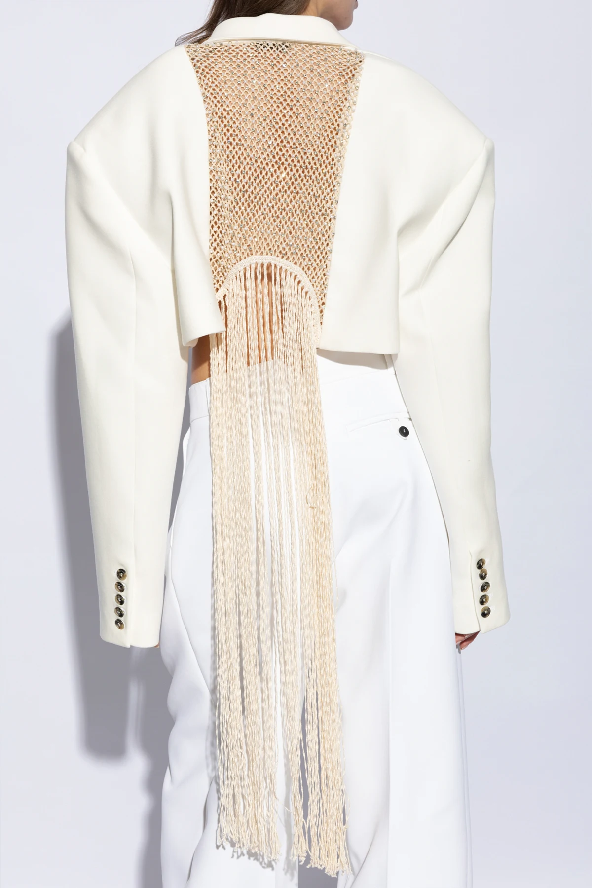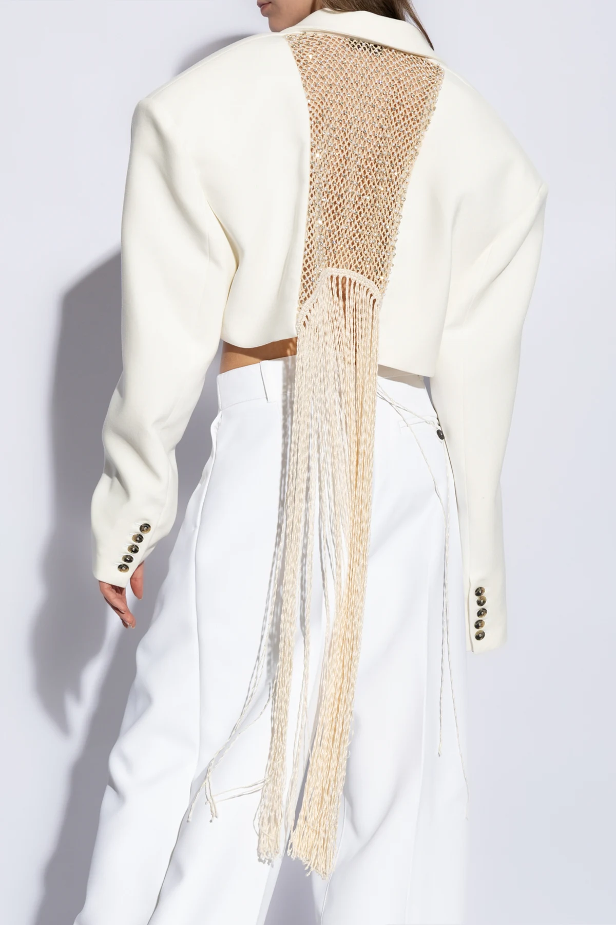 Introducing the Anette Blazer by The Mannei, an epitome of modern elegance and sophisticated design. Crafted from a luxurious blend of wool and polyamide, this exquisite white blazer showcases a unique open-front silhouette reminiscent of a chic bolero, complete with long sleeves and a gracefully draped shoulder line. The collar descends into wide lapels, adding a touch of refined grace to the overall structure. The rear of the Anette Blazer is adorned with a striking mesh insert, meticulously embellished with shimmering crystals and fringe details that cascade vertically, infusing this piece with an air of exclusivity. This mesh feature, combined with the decorative buttons on the sleeves, underscores the blazer's unparalleled craftsmanship and attention to detail. Upon wearing, the Anette Blazer exudes a relaxed fit that maintains an elegant and contemporary aesthetic, making it a versatile addition to any wardrobe. Its smooth, high-quality fabric further asserts the blazer's status among exclusive fashion brands. Why Purchase This Product? Exquisite Craftsmanship: Expertly tailored with high-quality materials and attention to intricate details. Unique Design: The open-front silhouette and decorative mesh insert with crystals and fringes set this blazer apart. Versatile Elegance: Perfect for elevating any outfit, offering a blend of modern sophistication and timeless style. Luxury Material: Made from a blend of wool and polyamide, ensuring both comfort and durability.