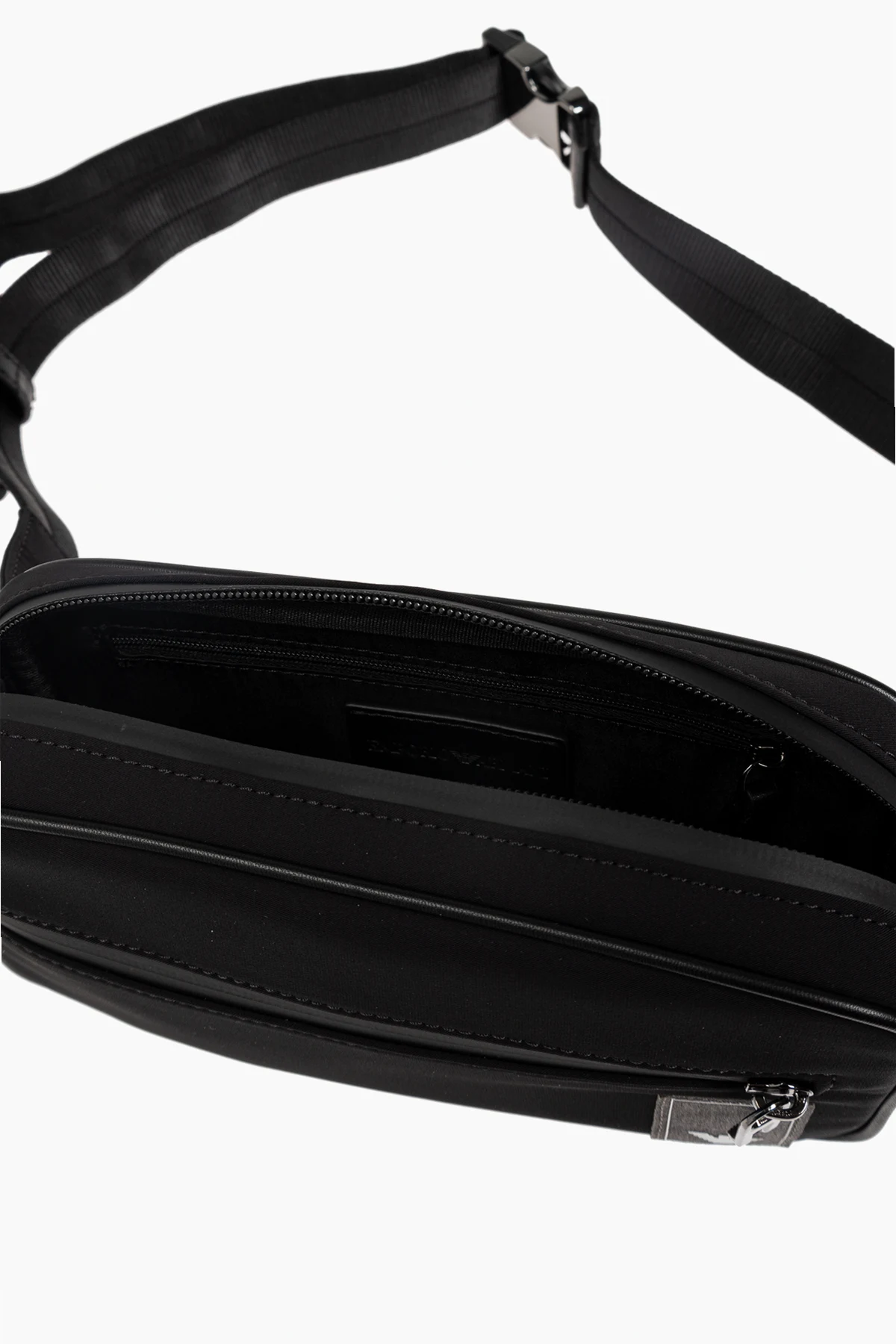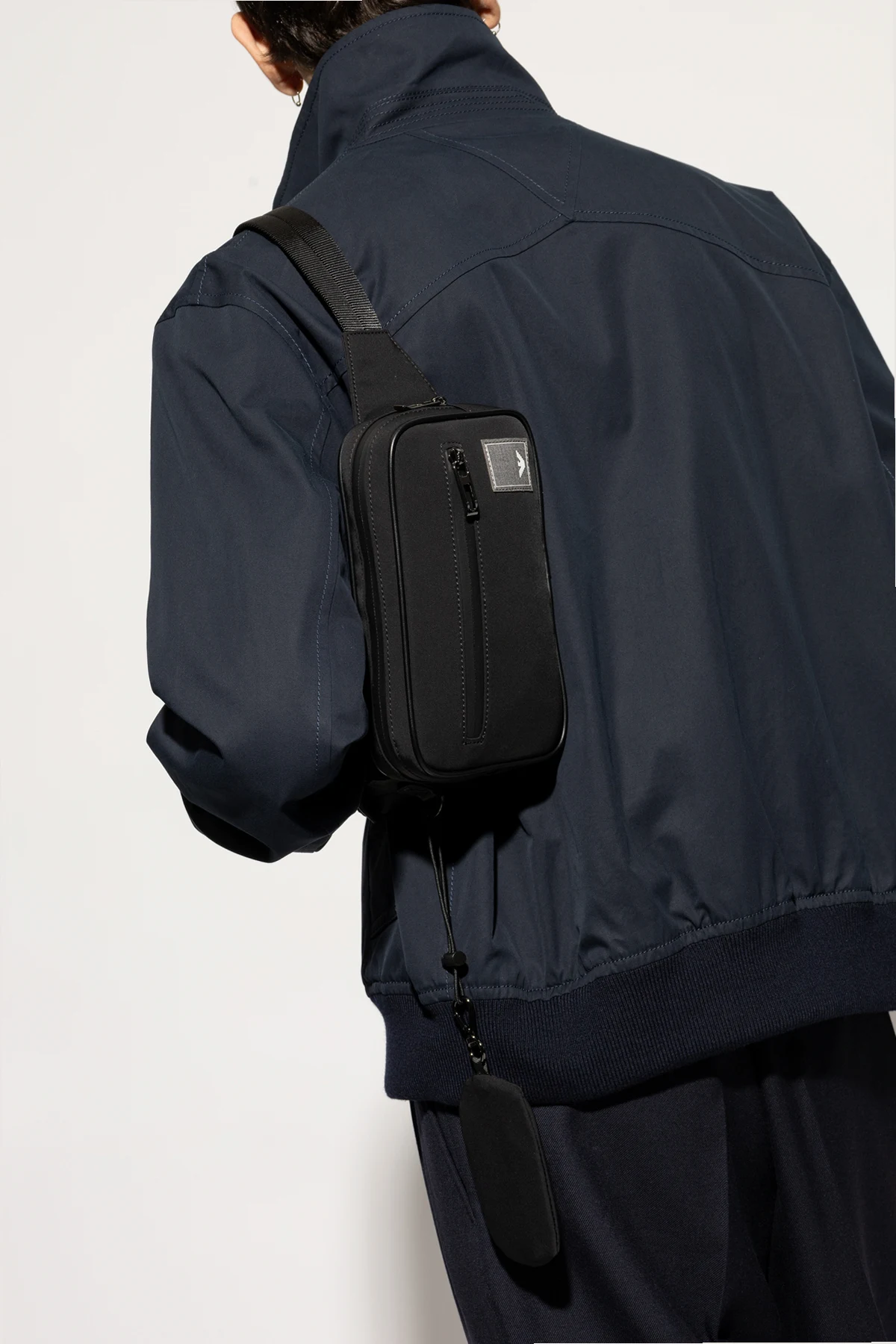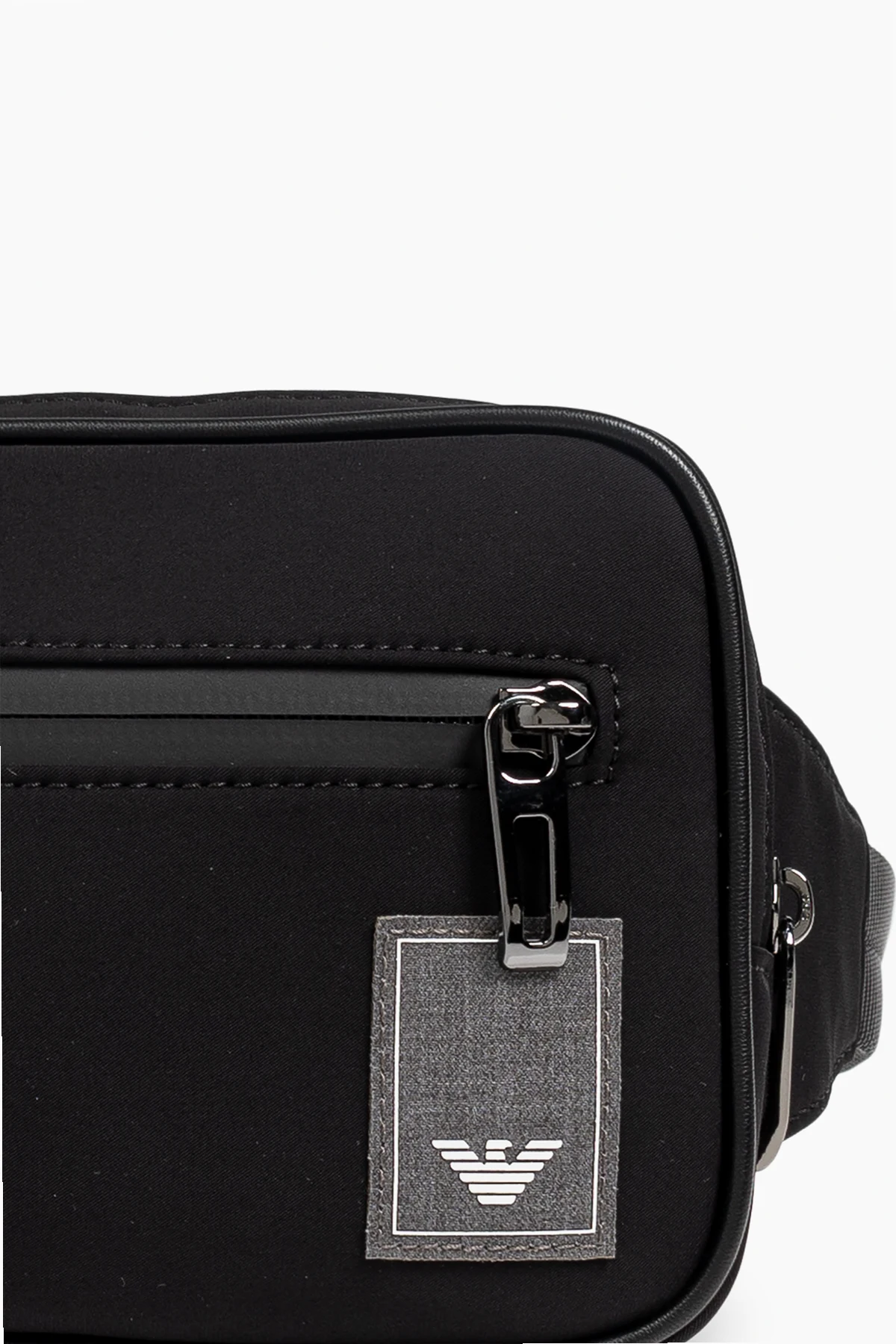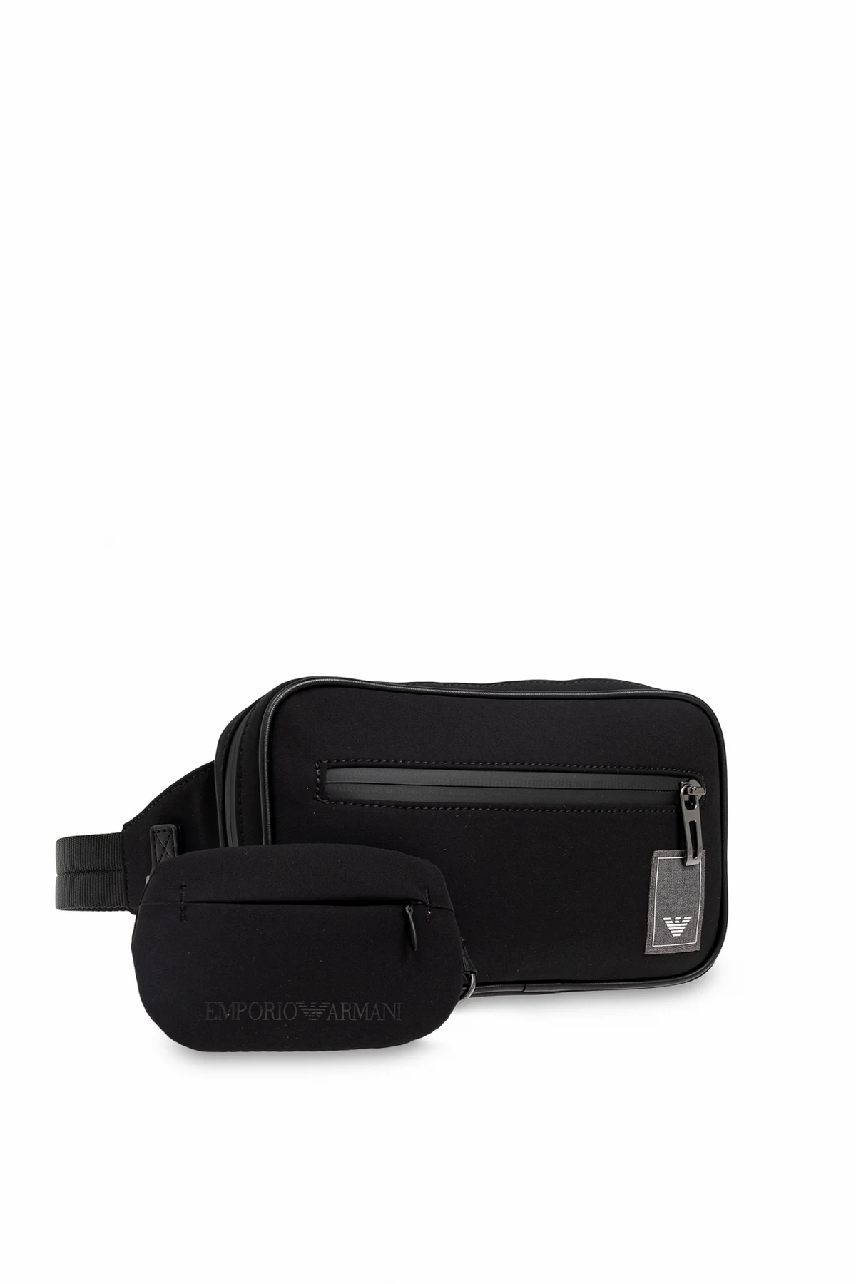 Introducing the exquisite Waist Bag by Emporio Armani, a paragon of modern elegance and practicality. Crafted from smooth, high-quality black material, this rectangular bag boasts a minimalist design that speaks volumes of sophistication. The bag features a spacious main compartment secured with a sturdy metal zipper, and an additional front pocket, also zippered, for easy access to essentials. A small designer logo tag graces the front, adding a touch of refined luxury. Complementing the main bag is a smaller black pouch, adorned with the iconic "EMPORIO ARMANI" logo, perfect for keeping smaller items organized. Designed for versatility, the bag includes an adjustable strap that can be tailored to your preferred fit, secured with a robust plastic buckle. The back of the bag is padded with mesh fabric, ensuring comfort during wear, whether on the waist or over the shoulder. Emporio Armani, renowned for its high-quality luxury products, encapsulates innovation and cutting-edge trends. Each item, including this waist bag, is a testament to Giorgio Armani's commitment to creating luxurious yet understated pieces. Why Choose This Product? Elegant and minimalist design High-quality, durable materials Spacious main compartment with additional zippered pocket Adjustable strap for customized fit Comfortable padded mesh back Includes an additional branded pouch