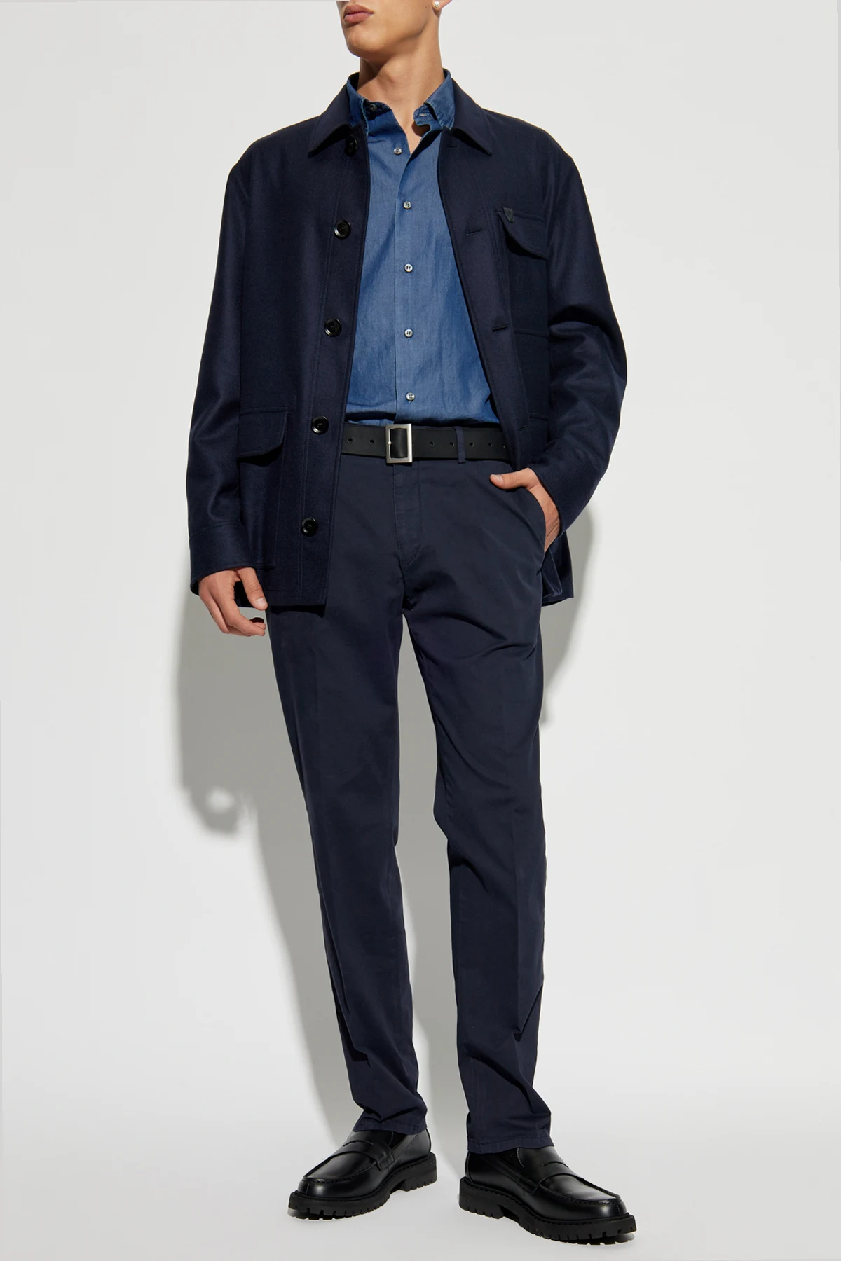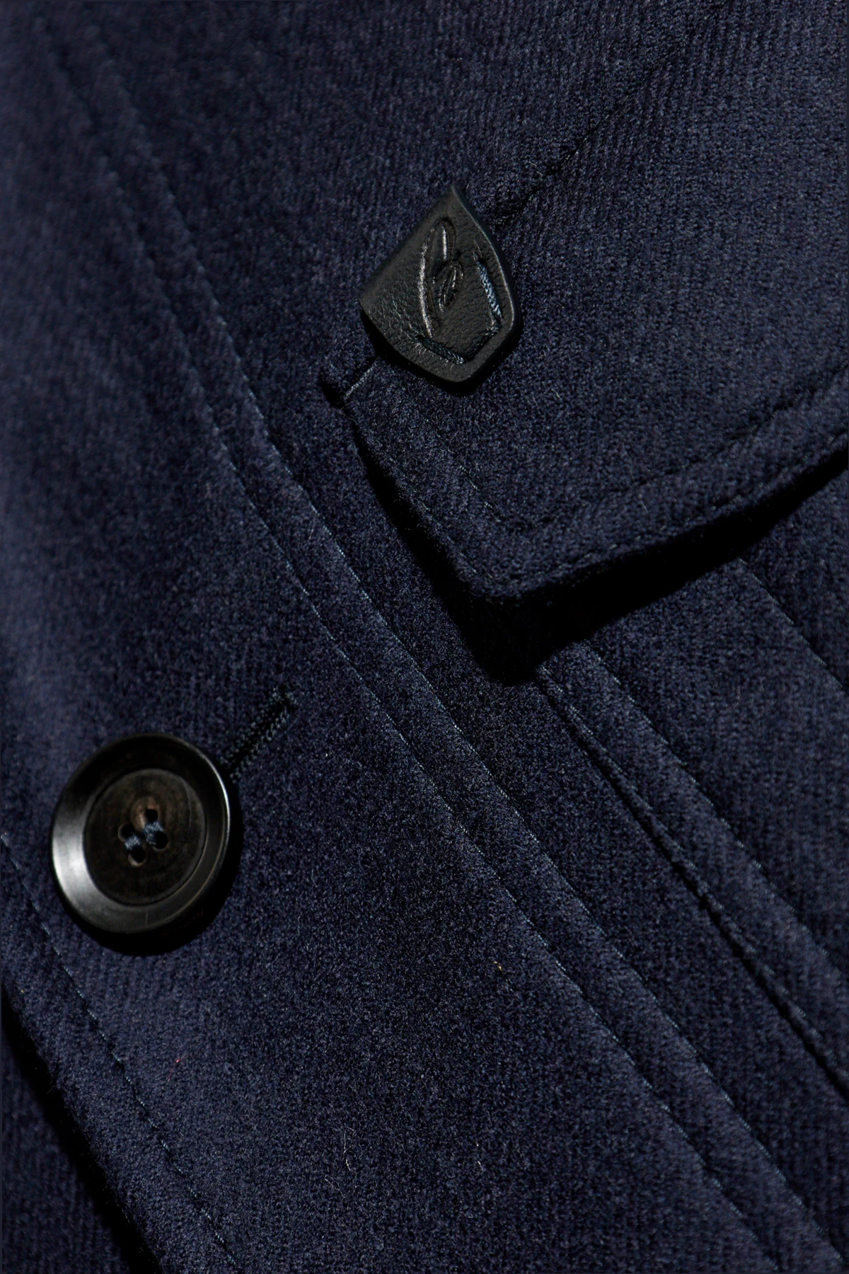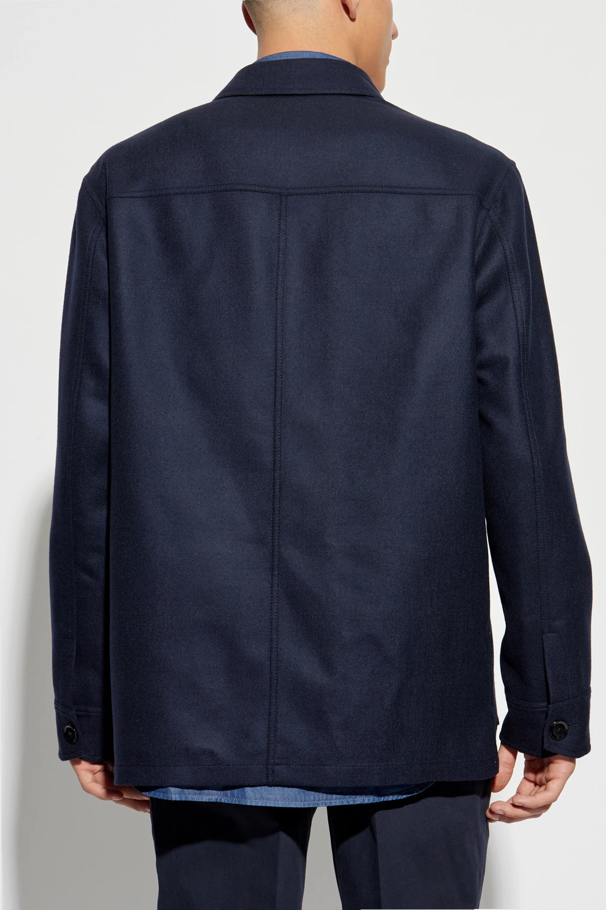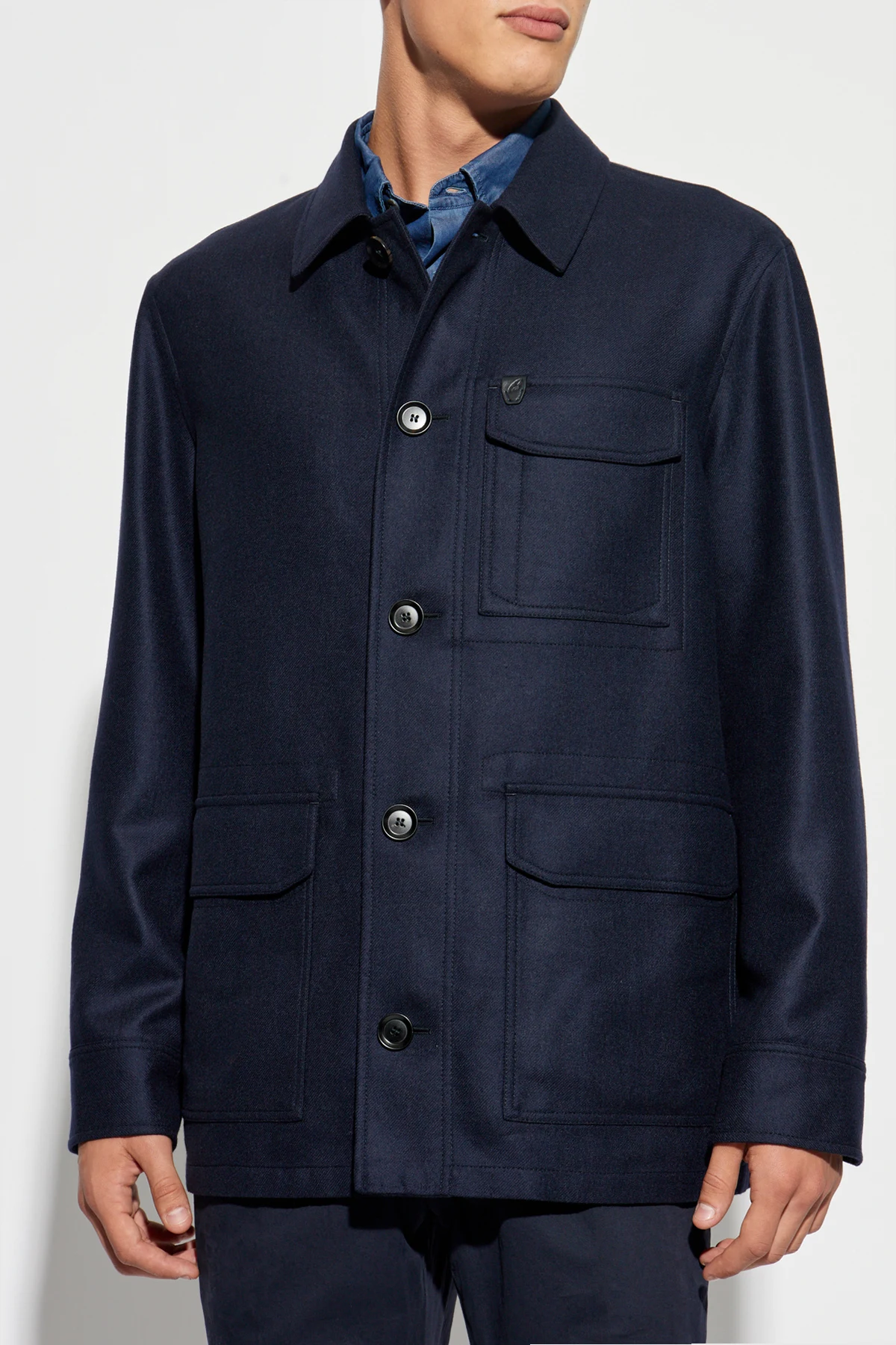 Introducing the Woolen Jacket by Brioni, a paragon of sartorial excellence. This men's jacket, resplendent in a deep navy hue, epitomizes the quintessence of Italian craftsmanship. Crafted from the finest wool with a touch of silk, it offers unparalleled comfort and a luxurious feel. The classic, straight cut, reminiscent of a work jacket, ensures a timeless silhouette, while the standard hip-length and long sleeves add to its sophisticated allure. The jacket features a traditional collar fastened with dark buttons, seamlessly blending with the navy fabric. Three prominent pockets—two at the lower front and one on the left chest—are adorned with flaps, enhancing both functionality and aesthetic appeal. A subtle emblem near the chest pocket underscores its designer pedigree. Additional refinements include buttoned cuffs and a sleek, unembellished back, maintaining the minimalist elegance that makes this piece suitable for both formal and informal occasions. Why Choose This Product? Exquisite blend of high-quality wool and silk Timeless design with a classic, straight cut Functional and stylish pockets with flap closures Luxurious dark buttons for a cohesive look Minimalist elegance for versatile wear