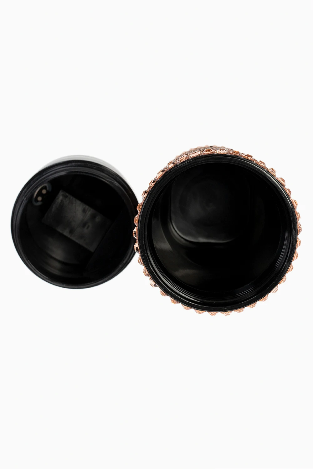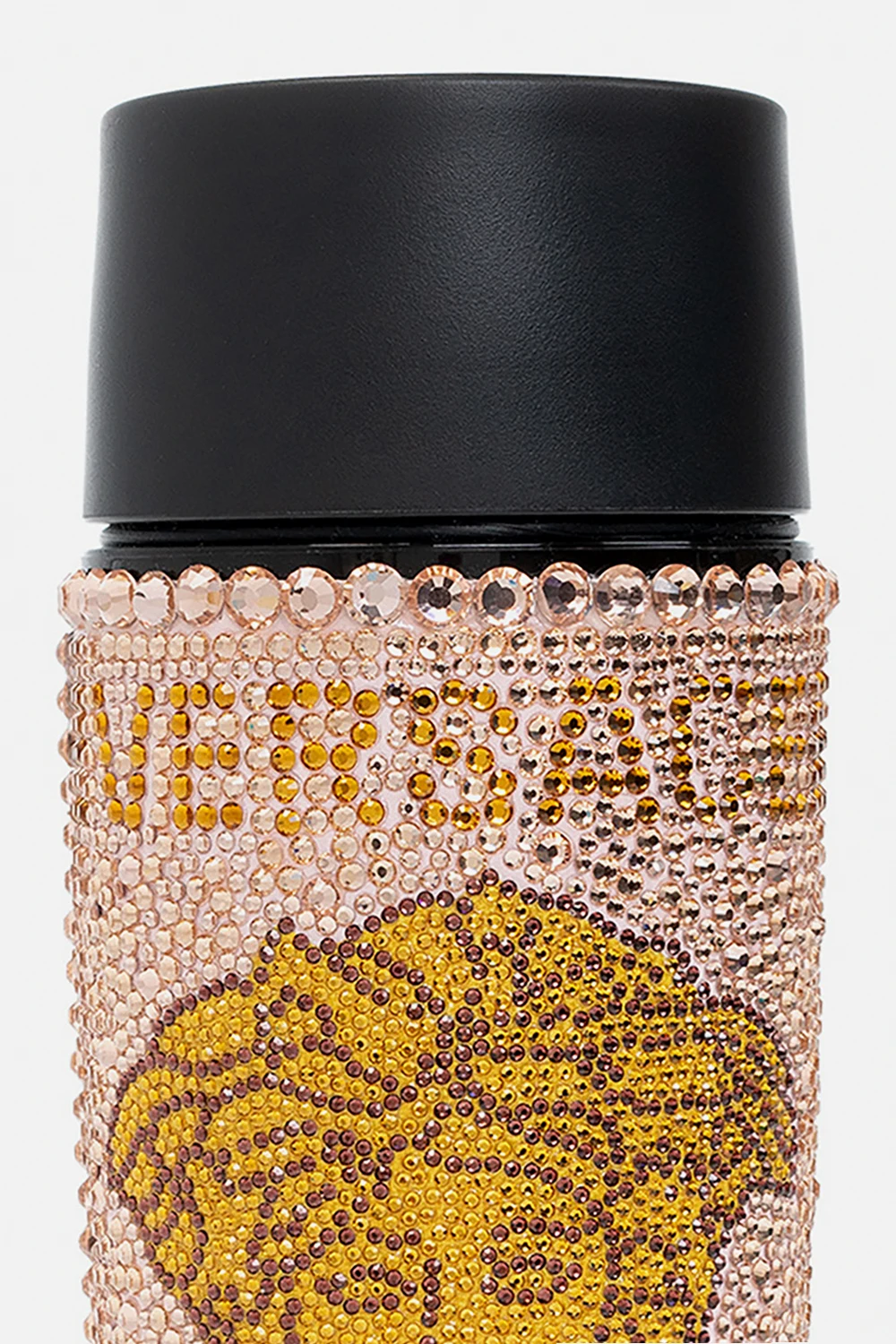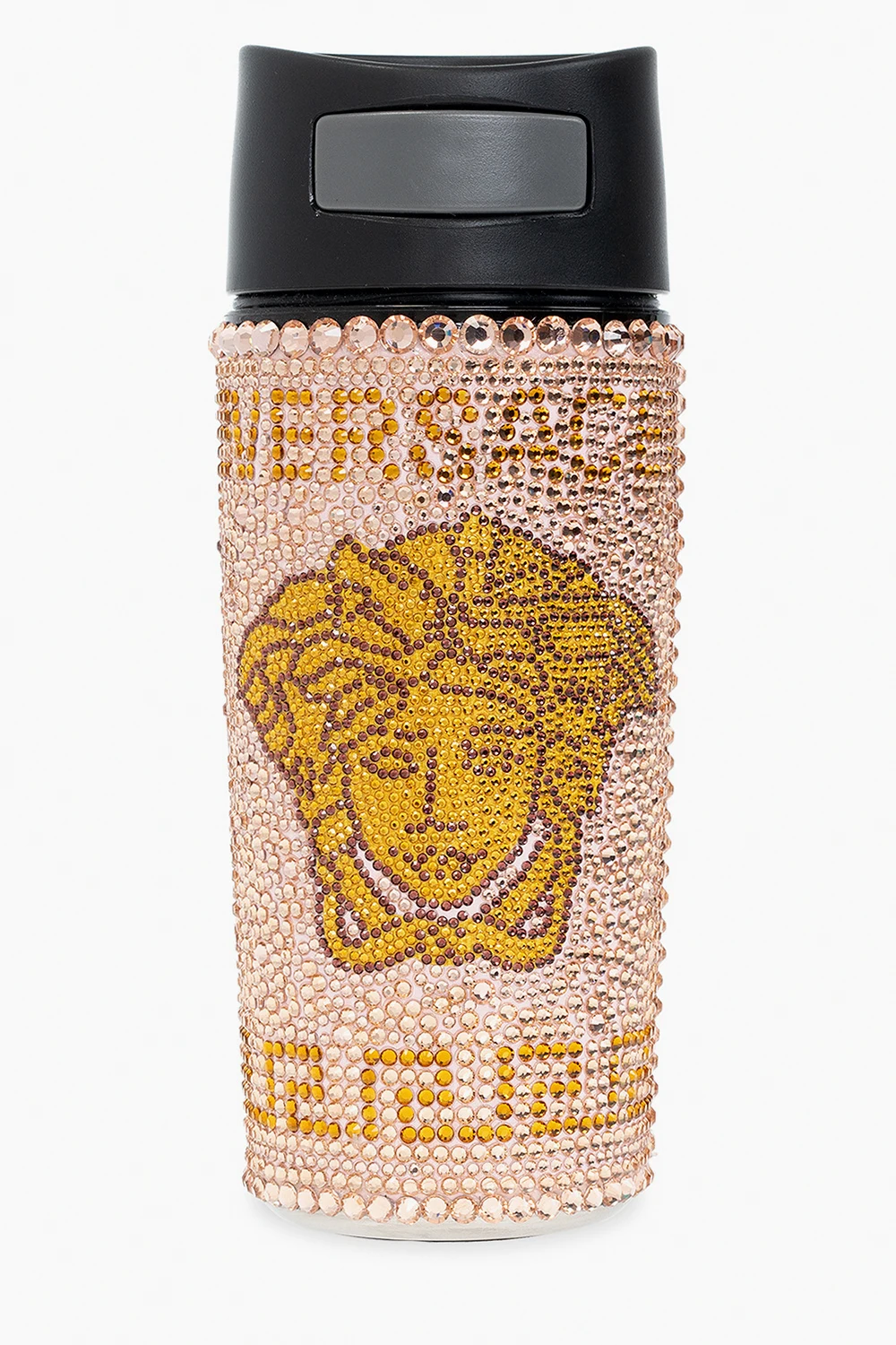 Pink and gold-tone twist-off travel mug from Versace Home. Perfect for your next adventure, this item showcases sparkling gemstones and the brand's signature Medusa motif and Greek pattern.