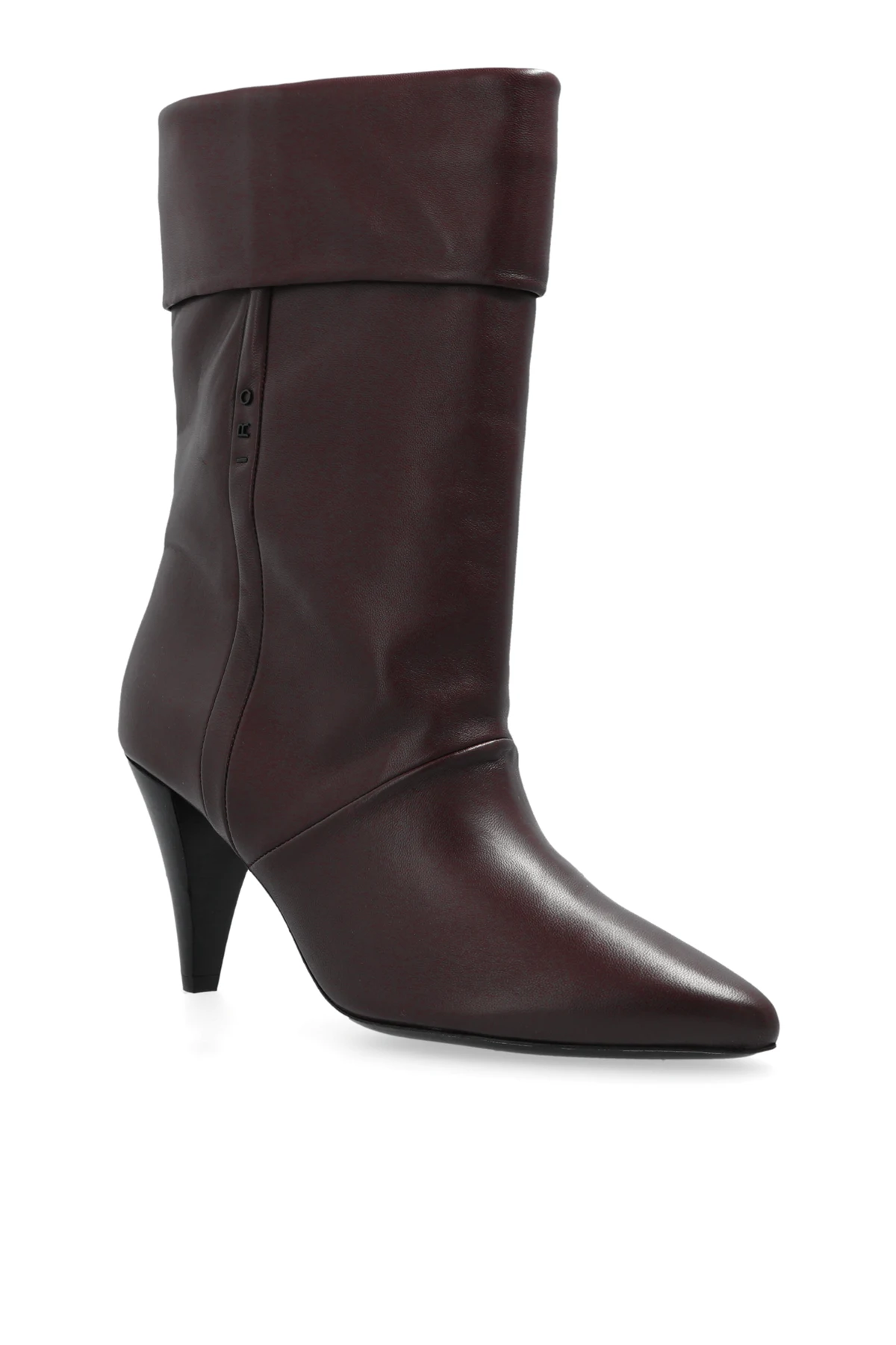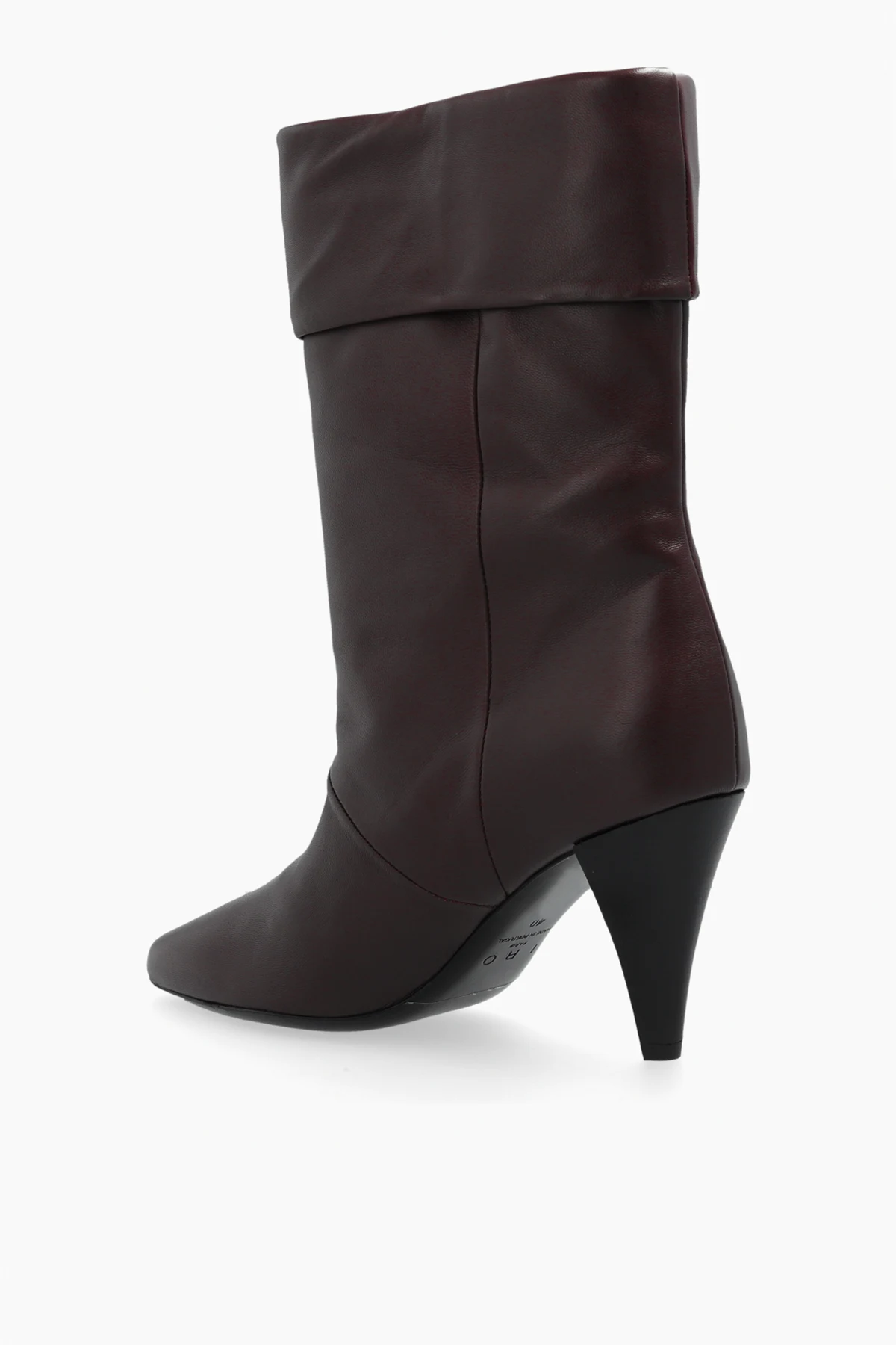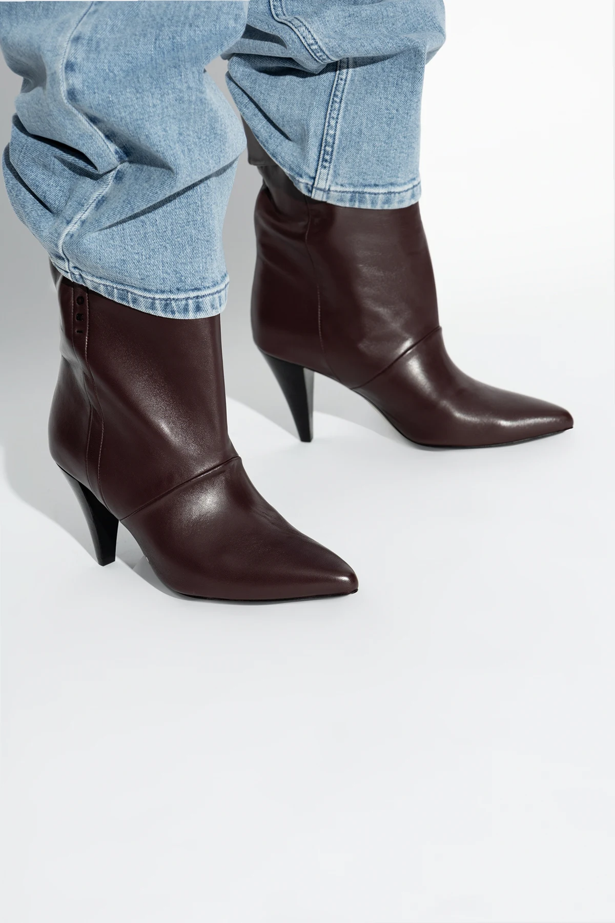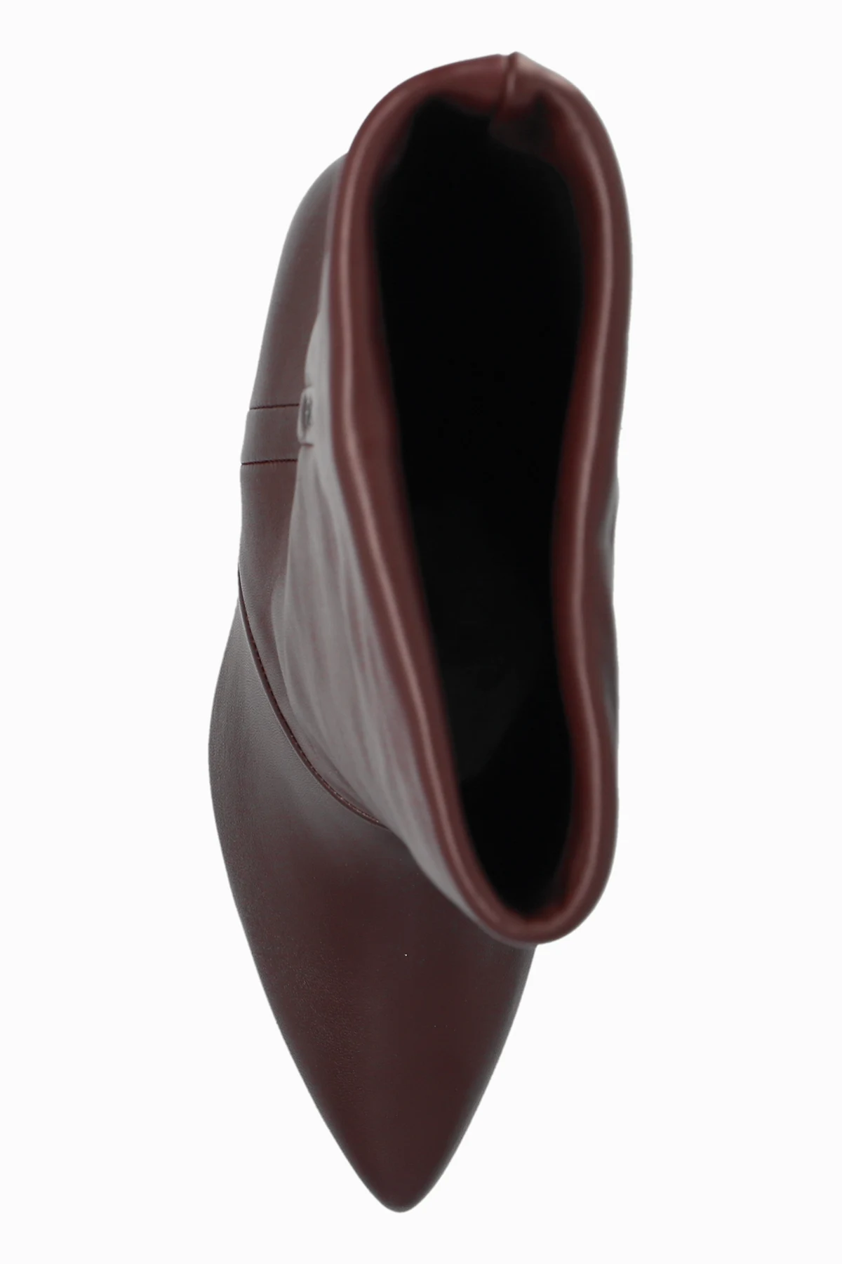 Introducing the 'Lolo' heeled ankle boots by Iro, epitomizing premium fashion with an impeccable blend of sophistication and minimalist design. Crafted from smooth, natural leather with a subtle sheen, these boots are a testament to unparalleled craftsmanship and timeless elegance. These boots feature a classic silhouette with a narrow, pointed toe and a high shaft that reaches above the ankle, adorned with a folded cuff at the top. The rich burgundy hue adds a touch of opulence, making them a versatile addition to any wardrobe. The absence of visible logos or embellishments enhances their sleek and refined aesthetic. A discreet side zipper ensures ease of wear, while the medium-height, cone-shaped heel provides a feminine touch, balancing comfort and grace. This exquisite piece is a part of Iro's collection, curated for women who embrace effortless elegance with a Parisian flair. Why Choose This Product? Exquisite design with a narrow, pointed toe and high shaft. Made from smooth, natural leather with a subtle sheen. Rich burgundy color for a luxurious look. Discreet side zipper for easy wear. Medium-height, cone-shaped heel for added elegance and comfort. Minimalist design with no visible logos or embellishments.