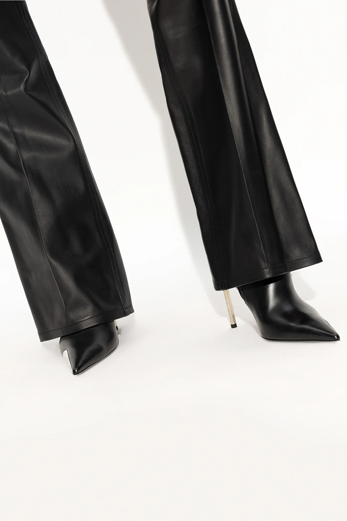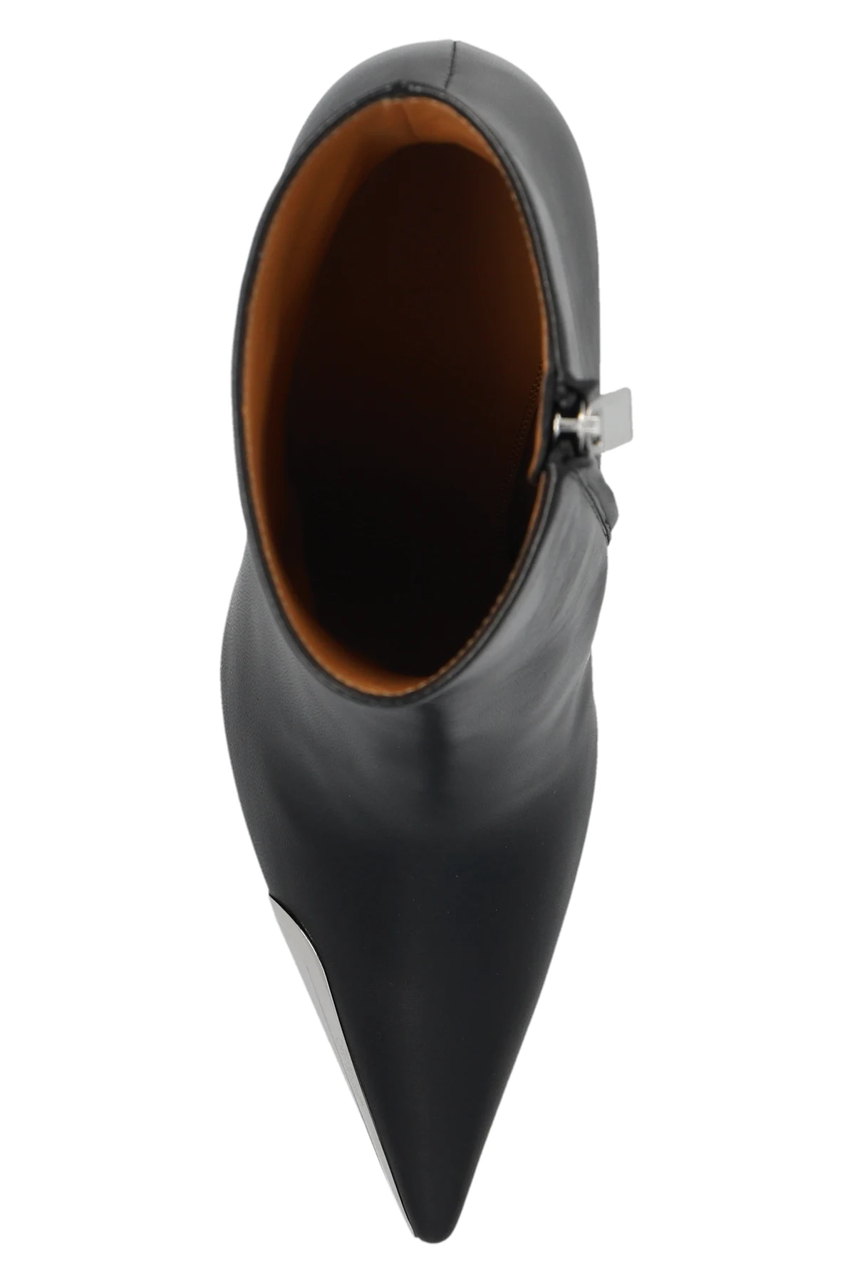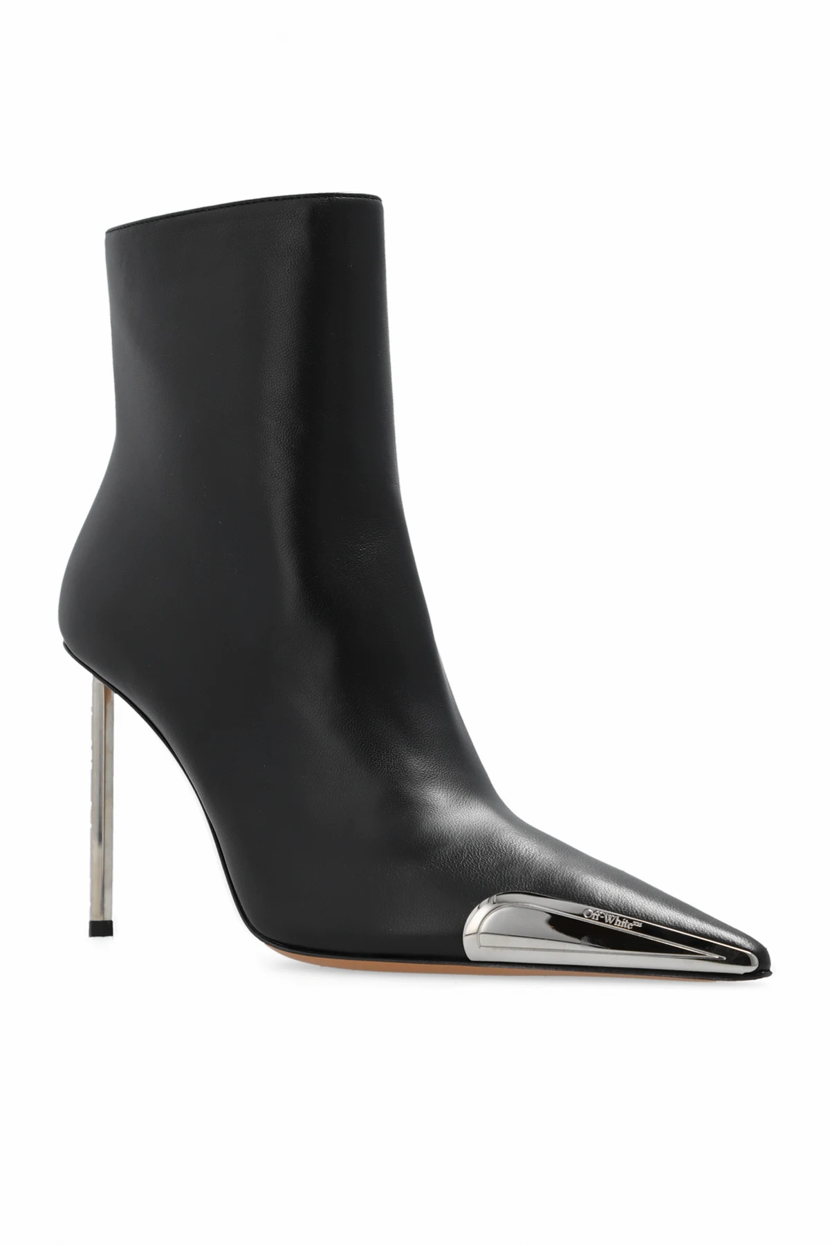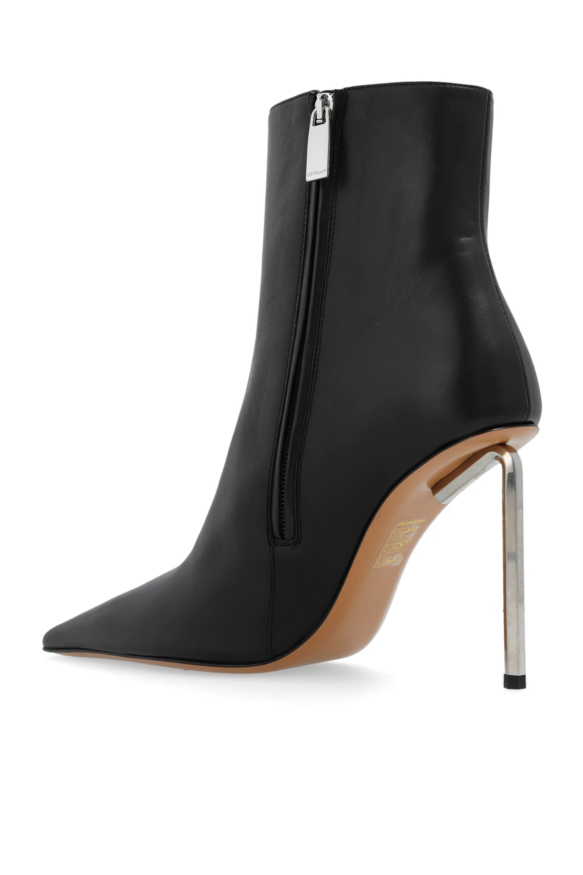 Black ‘Allen’ heeled ankle boots from Off-White. Made of leather, this pair features a side zip, pointed toe with a metal detail, the brand’s signature Allen Key heel engraved with a logo in silver-tone and a beige leather sole.