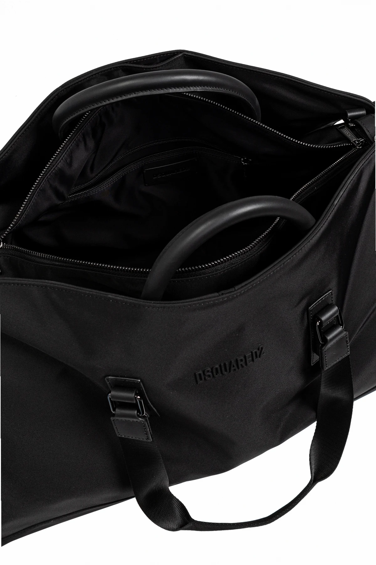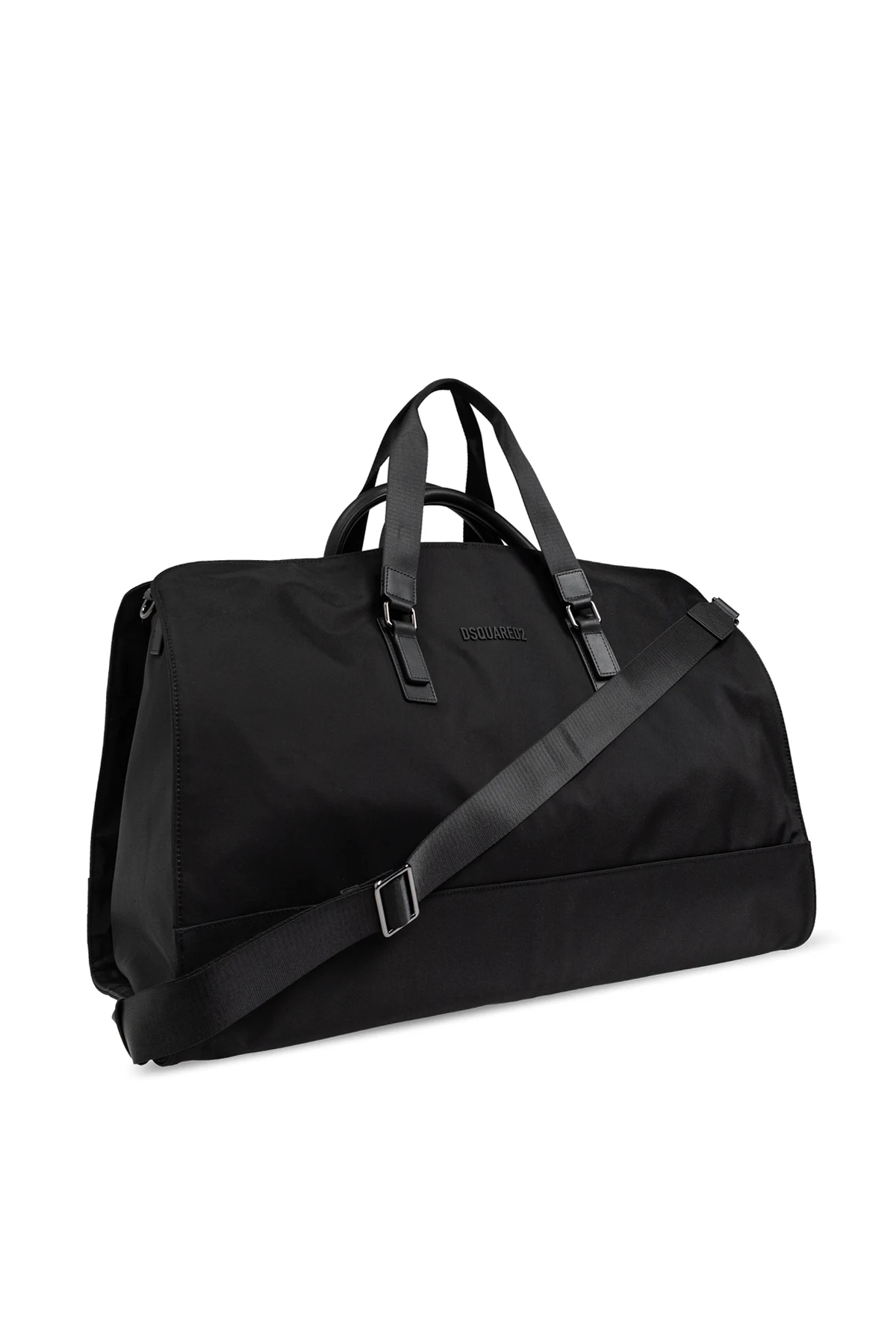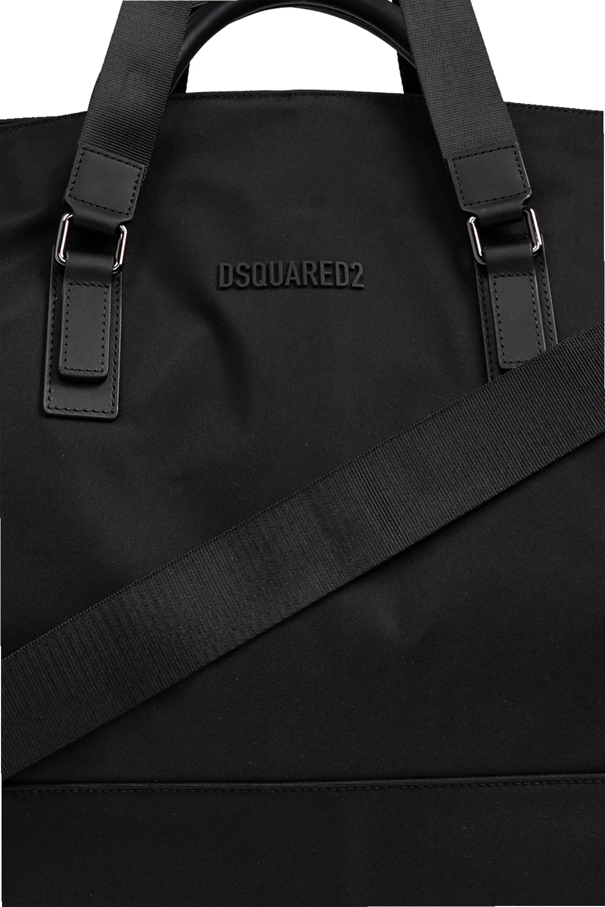 Introducing the Dsquared2 Black Handbag, an epitome of sophistication and practicality from the esteemed collection of renowned designers Dan and Dean Caten. This rectangular-shaped bag, with its rounded edges, exudes a contemporary charm that seamlessly blends into both travel and sports aesthetics. Crafted from durable poliamid, this handbag promises longevity and resilience. The black exterior is not only elegant but also versatile, poised to complement any attire. The bag features two robust hand straps and an adjustable, detachable shoulder strap with metal buckles, ensuring both comfort and style. A subtle, embossed DSQUARED2 logo adorns the front, adding a touch of understated luxury. The spacious interior, accessible through a top dual-zip closure, includes a main compartment with additional pockets: a zippered pocket and two slip pockets for optimal organization. The exterior snap-fastened layer further enhances its functionality, making it a perfect companion for the discerning traveler. Why Choose This Product? Exclusive Design: A blend of American glamour and Italian chic by Dsquared2. Durable Material: Made from high-quality poliamid, ensuring durability. Spacious and Functional: Ample storage with multiple pockets for organized packing. Versatile Wear: Features both hand straps and a detachable shoulder strap for varied use. Elegant Aesthetic: Sleek black color with a subtle designer logo for a polished look.