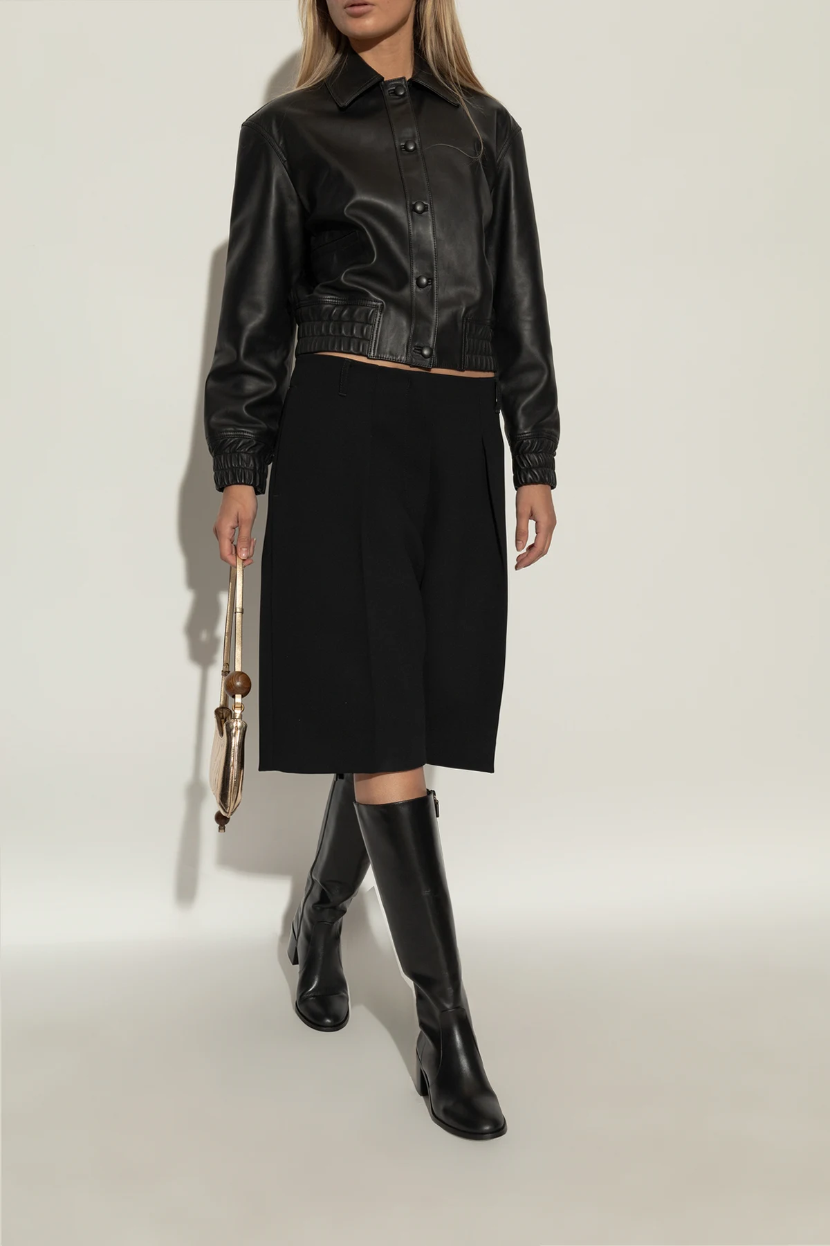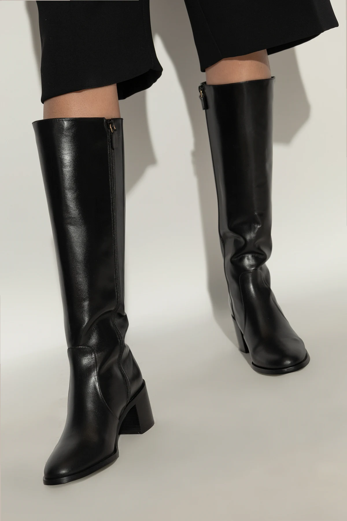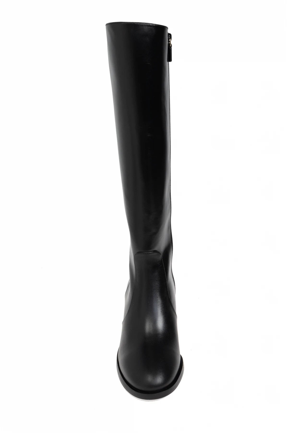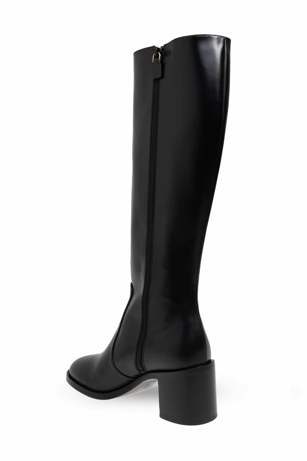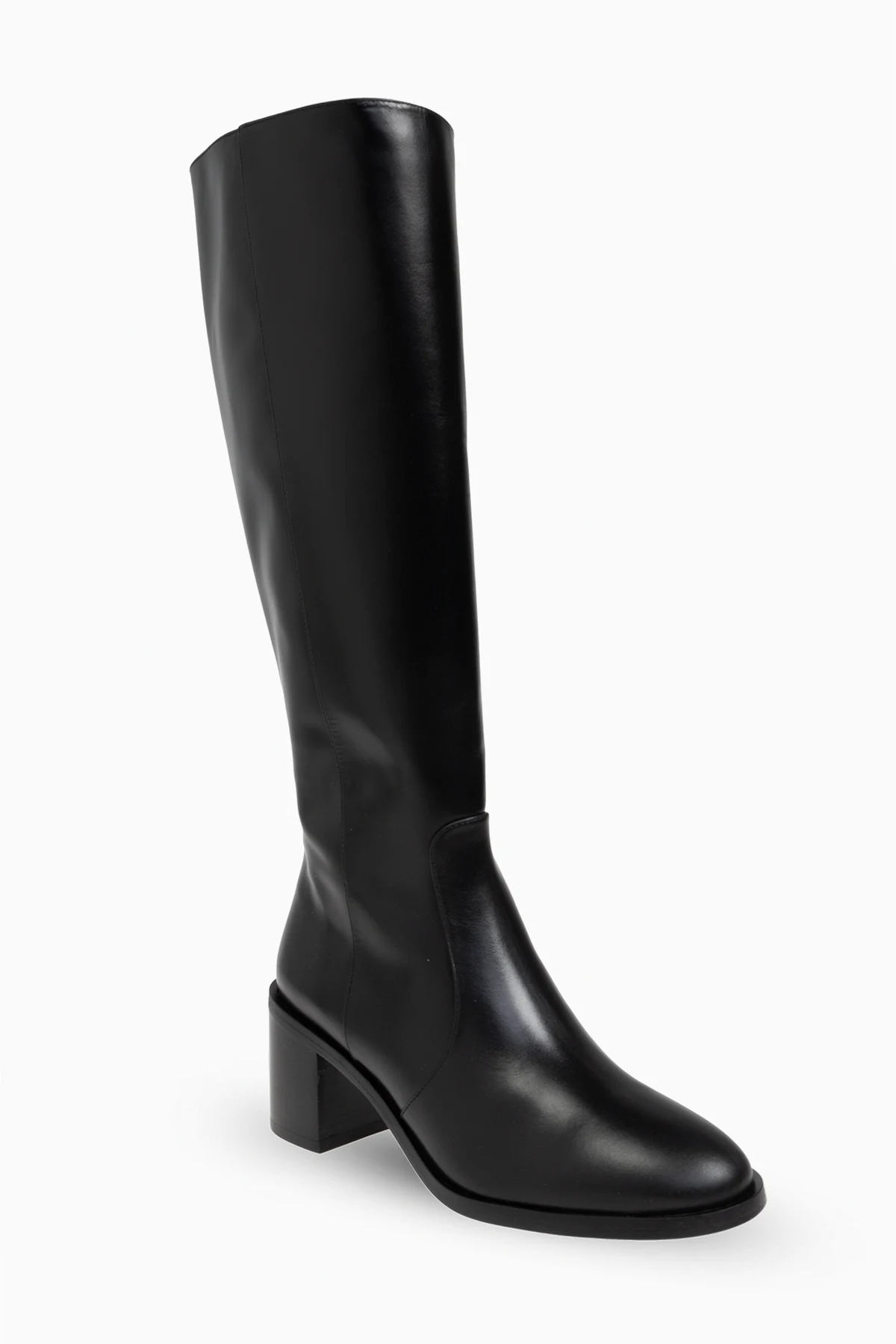 Introducing the exquisite Esme knee-high boots by renowned designer Stuart Weitzman. These elegant, black boots are meticulously crafted from smooth, glossy leather, offering a luxurious and sophisticated touch to any ensemble. The Esme boots feature a sleek, simple silhouette with a gently rounded toe, complemented by a stable, medium-height block heel that provides both comfort and an air of refined elegance. The discreet side zipper ensures ease of wear, while the absence of visible embellishments underscores their minimalist, yet striking design. Created with attention to detail, the outer layer, inner lining, and soles are made from premium leather, with the addition of a rubber component in the sole for enhanced durability and grip. Why Choose This Product? Designed by the acclaimed Stuart Weitzman, known for his innovative use of materials and impeccable craftsmanship. Crafted from luxurious, high-quality leather for a polished and sophisticated look. Stable block heel and side zipper for comfort and convenience. Minimalist, elegant design suitable for both formal and casual occasions.