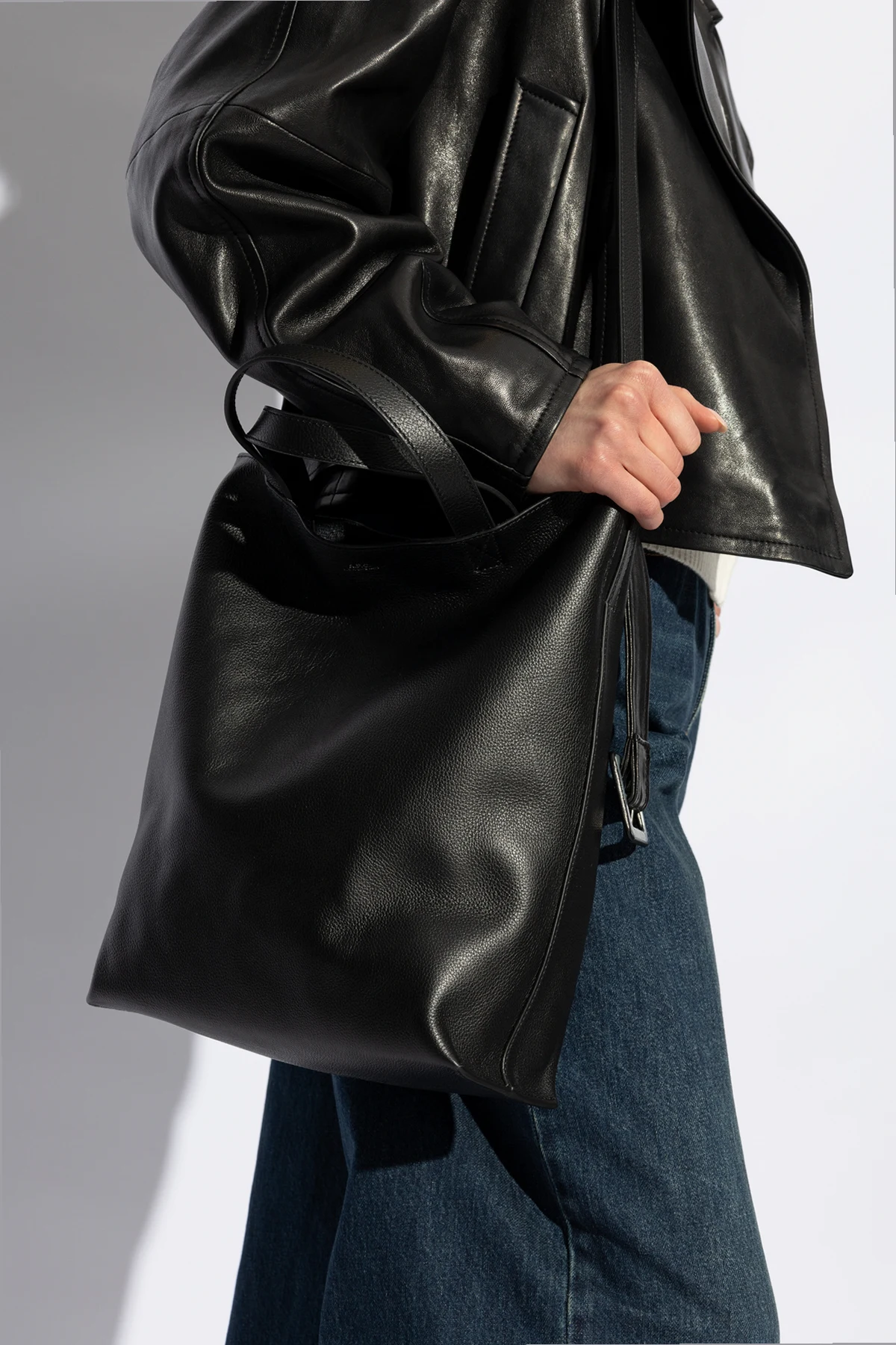 Introducing the Maiko Medium Shopper by A.P.C., a paragon of minimalist elegance and functionality. Crafted from what appears to be high-quality, smooth leather or its finest imitation, this bag embodies the quintessence of sophisticated design. Its sleek, black silhouette, devoid of unnecessary embellishments, makes it a versatile accessory suited to a myriad of styles. The Maiko Medium features two top handles and an additional, longer strap that crosses the front, lending a contemporary edge to its classic shape. Its spacious interior, revealed in one of the snapshots, is thoughtfully designed with a practical side pocket secured with a zipper, ensuring your essentials are organized and easily accessible. The discrete logo of the designer, A.P.C., subtly placed on the front of the bag in a hue that harmonizes with the rest of the piece, signals a mark of distinction and quality recognized by connoisseurs of the brand. This shopper bag, celebrated for its non-zippered, open-top design, champions a minimalist style while promising utility and elegance. Why Purchase the Maiko Medium Shopper? Universal Elegance: Its black color and simple design ensure it complements any outfit, making it a staple for any wardrobe. Quality Materials: Made from premium, smooth leather or a high-quality imitation, offering durability and a luxurious feel. Functional Design: Features a spacious main compartment and an additional zippered pocket for optimal organization. Signature Detailing: Boasts a discreet A.P.C. logo, adding a touch of exclusivity without overpowering the minimalist aesthetic.