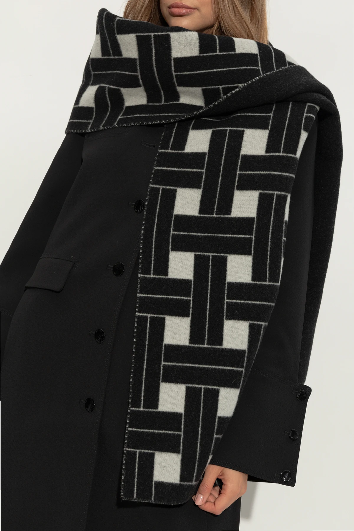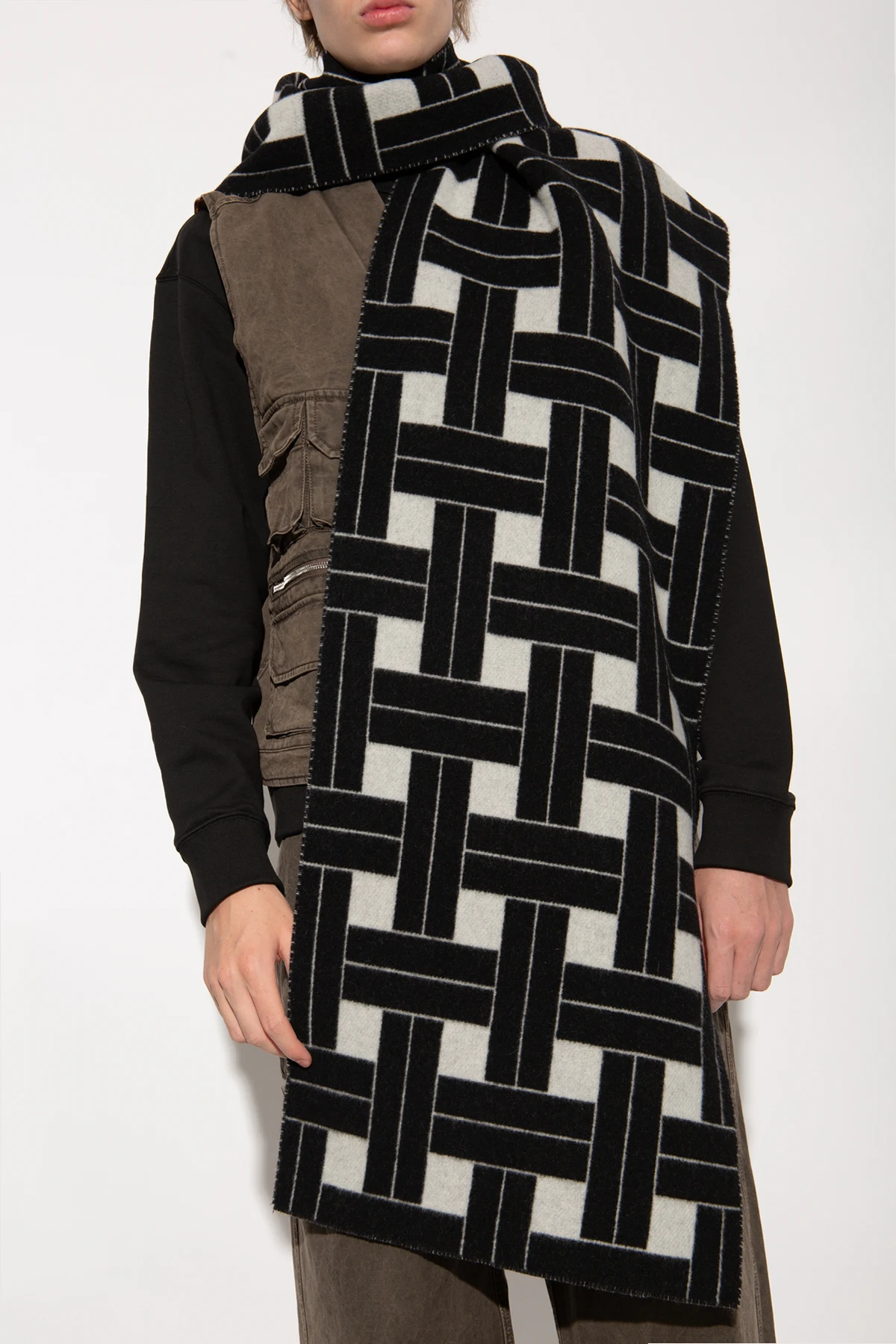 Introducing the Kenzo Wool Scarf, an epitome of luxury and meticulous craftsmanship. This exquisite accessory, designed by the renowned fashion house Kenzo, is a testament to contemporary elegance and sophisticated style. Fashioned from premium quality wool, this rectangular scarf offers unparalleled warmth and comfort. The intricate geometric pattern, featuring interlacing rectangles in various directions, adds a modern and striking touch to its design. The dominant black hue, accentuated by contrasting white elements, ensures its versatility and timeless appeal. Every detail of this scarf is carefully considered, from its impeccably finished edges to the uniform pattern that graces its entire surface, underscoring its elegance and exclusivity. As a unisex piece, it seamlessly complements both casual and formal ensembles, making it an indispensable addition to any wardrobe. Why Choose This Product? Crafted from high-quality wool for superior warmth and comfort. Unique geometric design for a modern and bold look. Versatile black and white color scheme suitable for various outfits. Expertly finished edges for a polished appearance. Unisex style, perfect for both men and women.