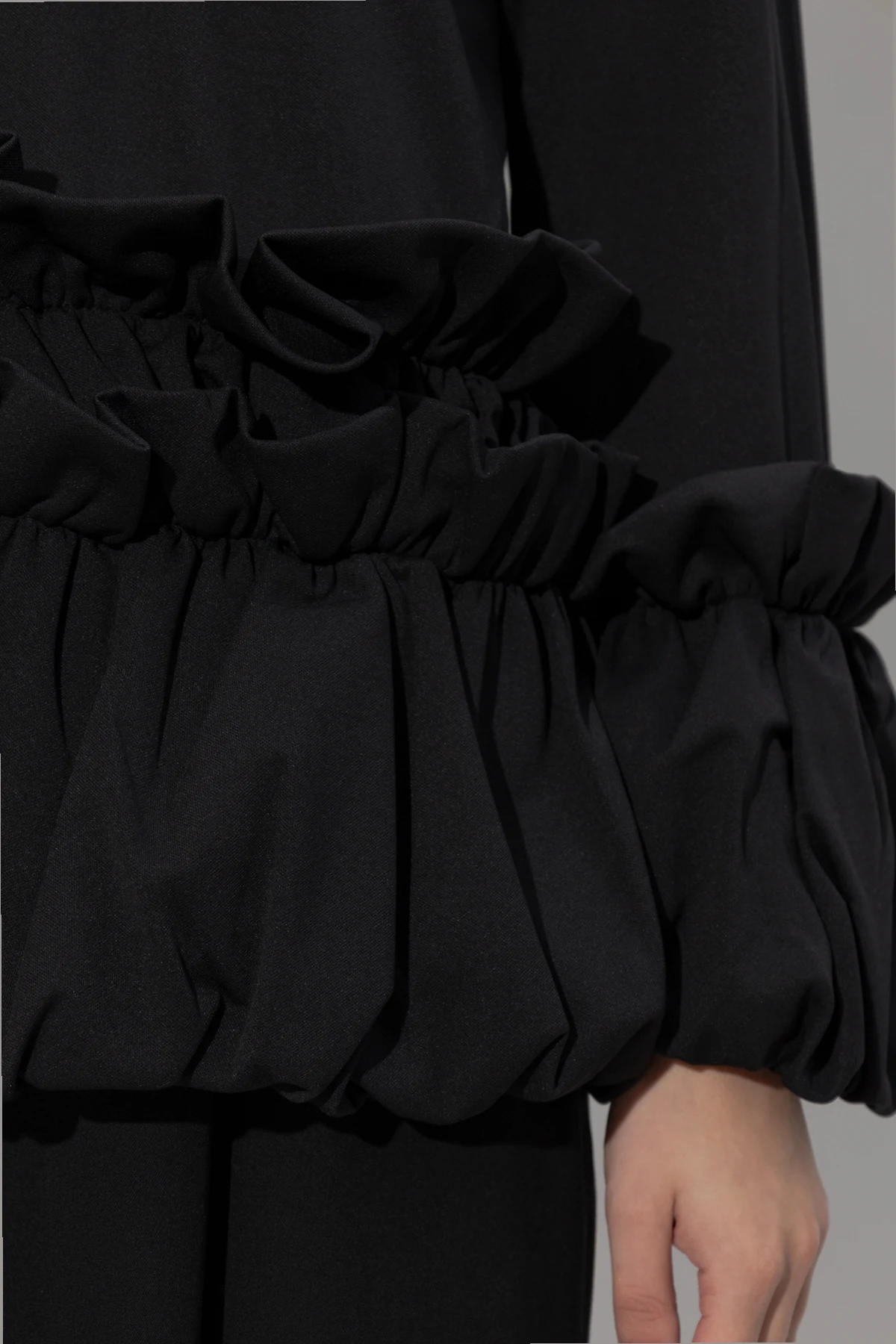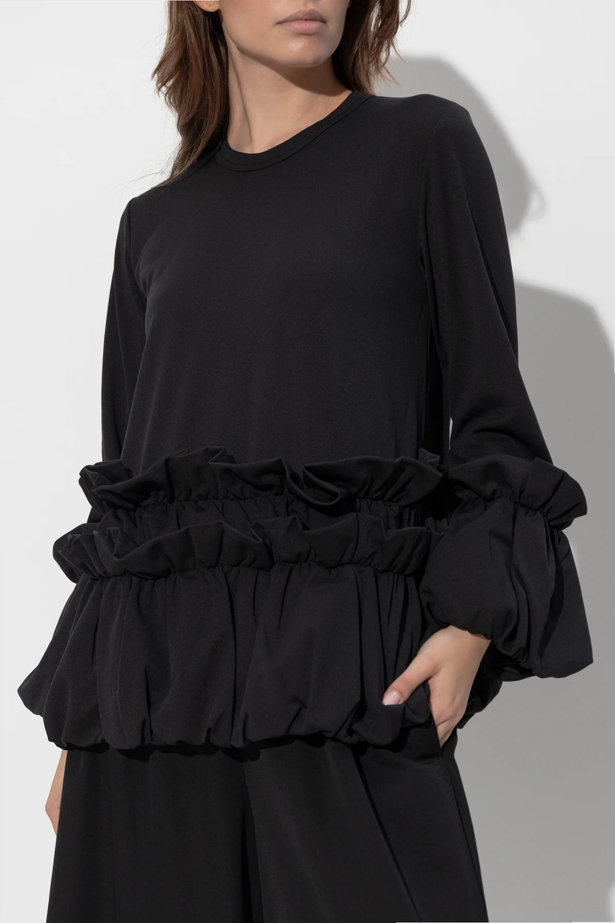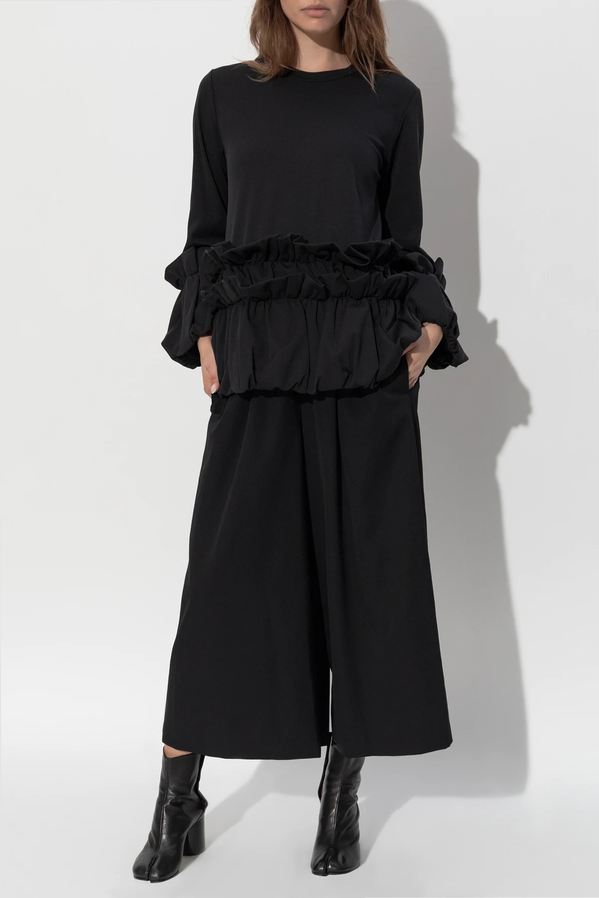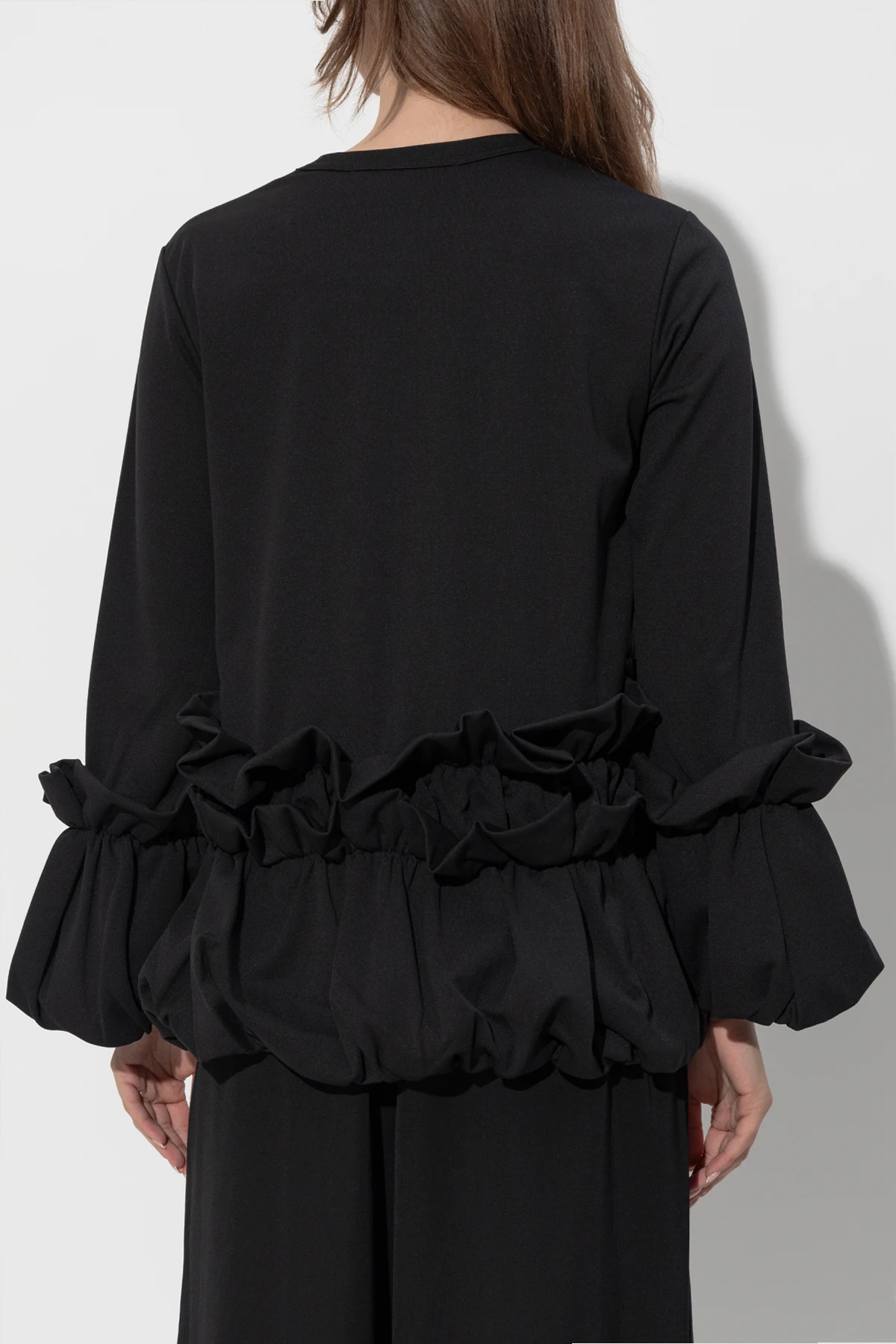Experience the epitome of sophistication with the CDG by Comme des Garçons Ruffled Top. This exclusive piece from the renowned collection is a testament to the brand’s commitment to luxury and avant-garde design. Crafted from a sumptuous black fabric with a matte finish, this top exudes understated elegance. Its simple, loose silhouette features long sleeves adorned with wide, voluminous ruffles at the waist and cuffs, adding a touch of decorative flair and texture. The ruffles encircle the waist, creating a dramatic yet refined aesthetic, while the cuffs mirror this motif for a harmonious design. The absence of visible logos and branding underscores a minimalist approach, allowing the intricate details to take center stage. As styled in the accompanying visuals, this top pairs exquisitely with wide-leg black trousers and heeled boots, epitomizing modern elegance. The model’s relaxed pose further highlights the top’s blend of comfort and sophistication. Why Choose This Product? Exquisite Material: Made from 100% polyester for a luxurious feel. Elegant Design: Black matte finish with distinctive ruffle detailing. Comfort & Style: Loose fit ensures both ease and elegance. Minimalist Branding: Focus on design with no visible logos. Versatile Styling: Perfect for pairing with various elegant ensembles.