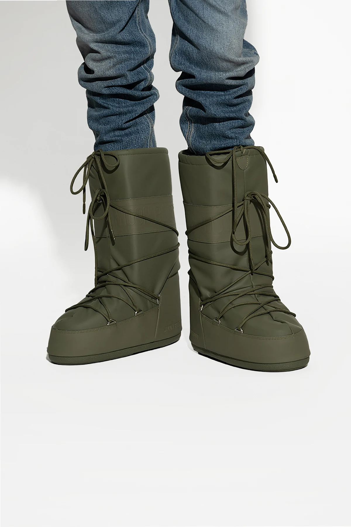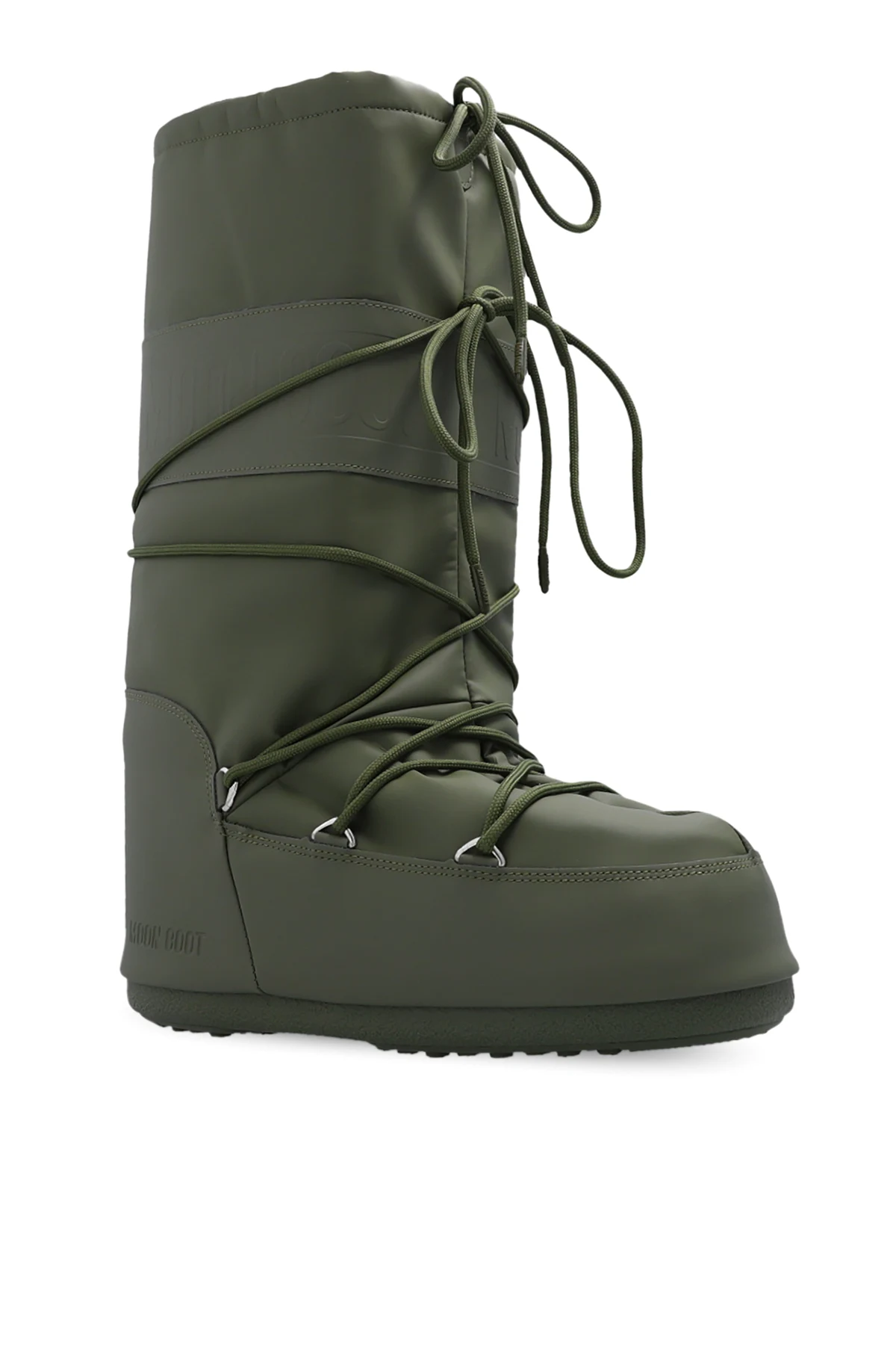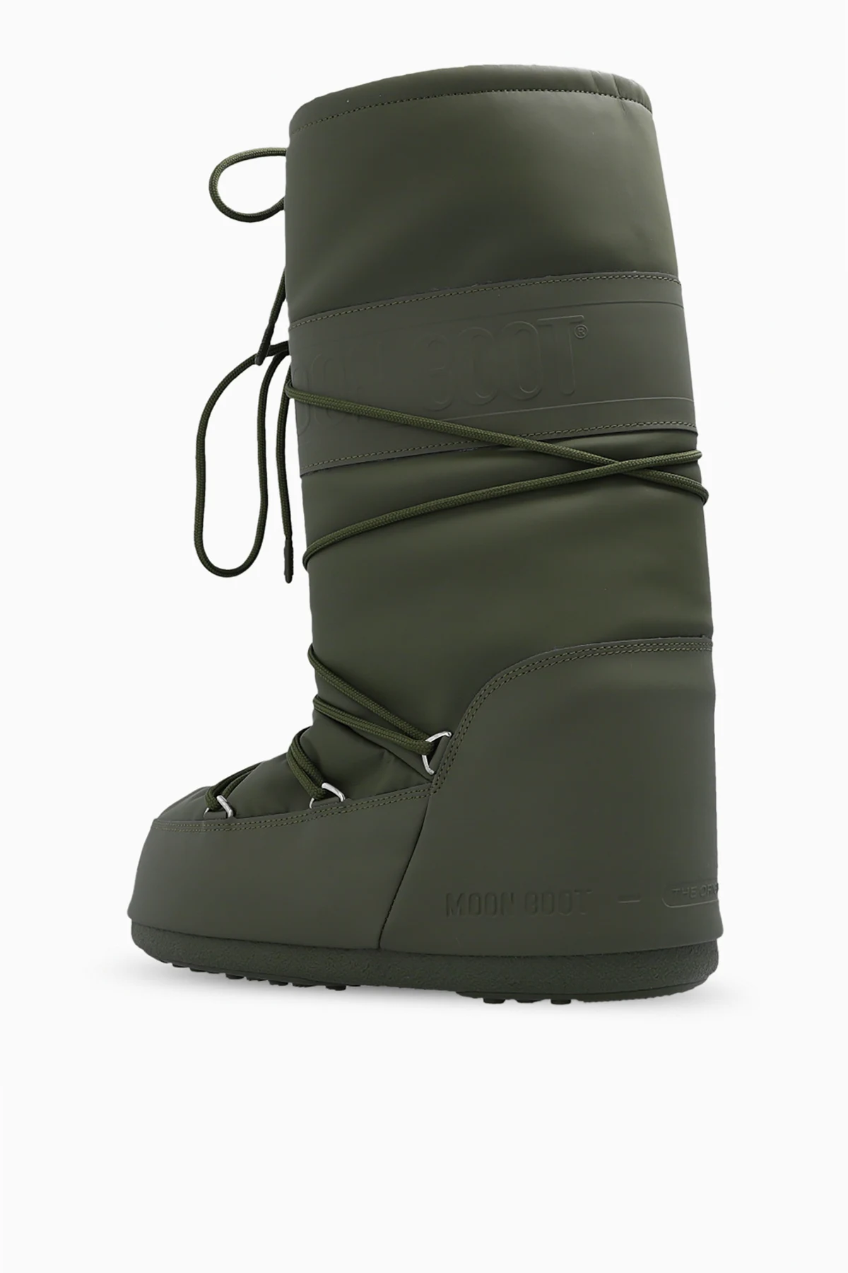 Khaki ‘Icon’ insulated snow boots from Moon Boot. Crafted from water-repellent ProTECHt material, this lace-up model showcases the brand's logo printed in grey, a lightweight midsole and suction pads on the rubber tread sole that offer serious ground control. Inspired by the footwear worn by astronauts during the 1969 lunar landing, this project combines technical features with a contemporary look.