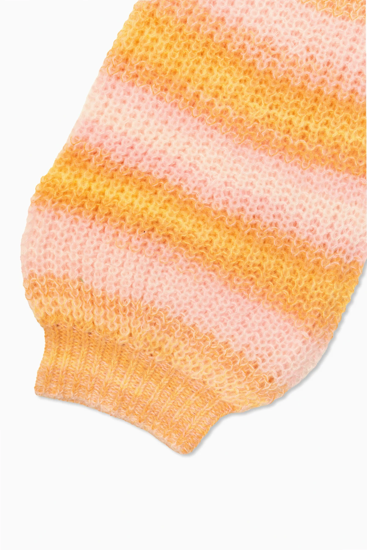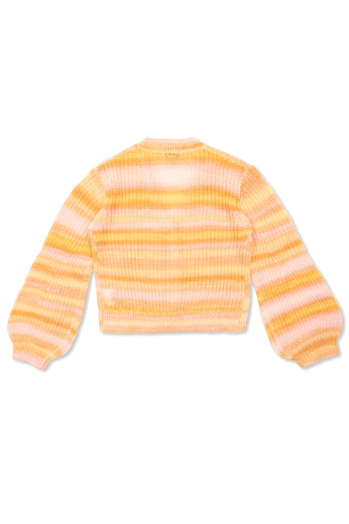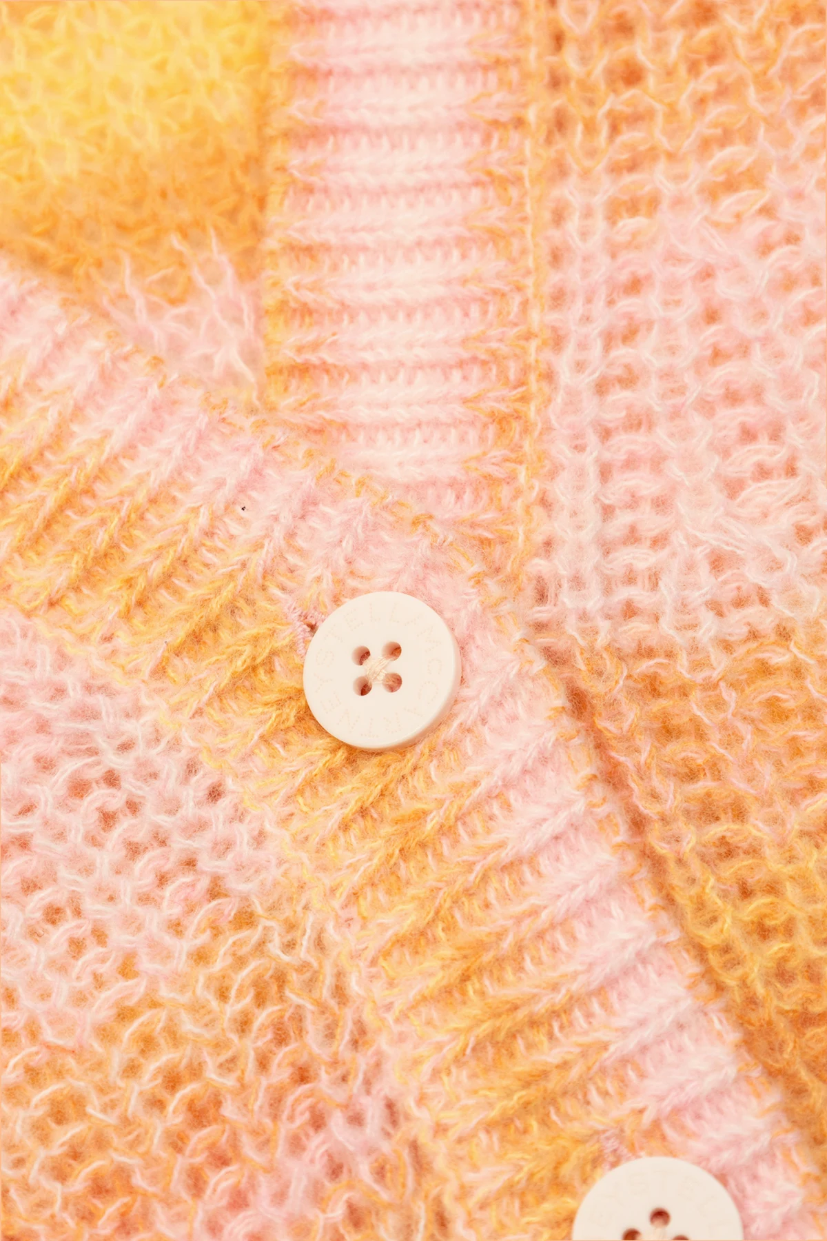 Introducing the Cardigan with V-Neck from the exclusive collection by Stella McCartney Kids, a paragon of exquisite children's fashion. Crafted with meticulous attention to detail, this cardigan features a classic cut with a sophisticated V-neckline and long sleeves. Adorned with horizontal stripes in warm shades of orange and pink, this piece exudes a charmingly cozy aesthetic. The soft, plush fabric suggests the use of high-quality fibers, likely a blend of wool or mohair, ensuring both comfort and durability. The cardigan is fastened with cream-colored buttons, each with four holes, adding a touch of refined elegance. The sleeves end in gently tapered cuffs, enhancing both the elegance and comfort of this garment. The loose, breathable knit pattern makes this cardigan lightweight and ideal for cooler days without being overly warm. Why Choose This Product? Designed by the renowned Stella McCartney Kids. Combines high-quality materials for a soft and plush feel. Features a classic V-neckline and refined button details. Elegant horizontal stripes in warm, inviting colors. Perfectly balanced for cooler days, providing warmth and style.