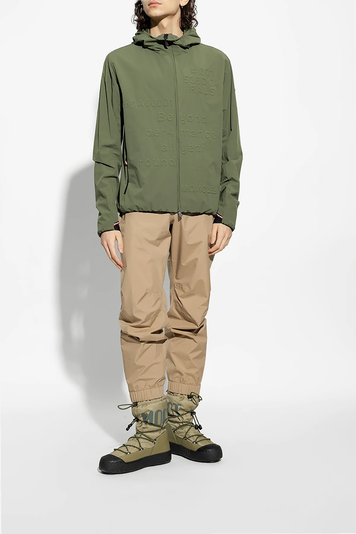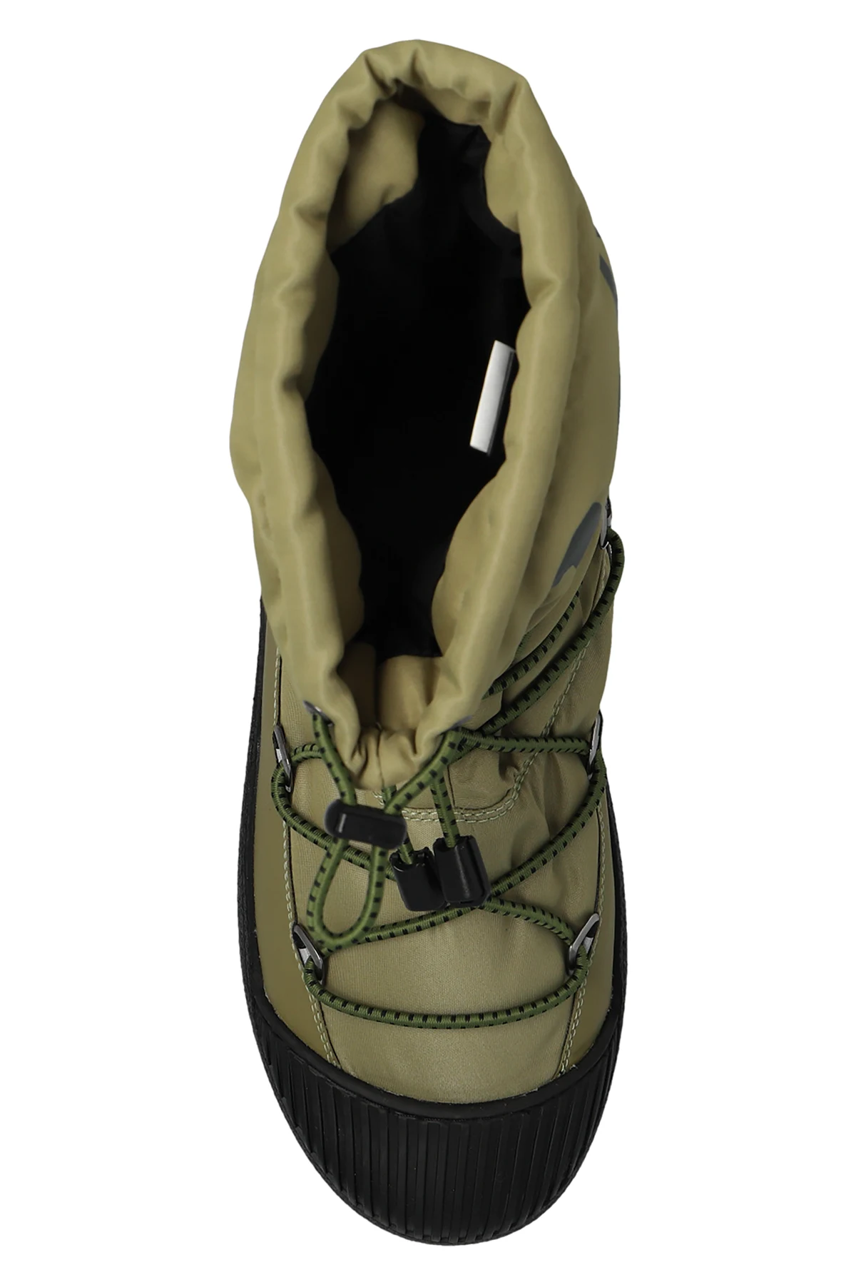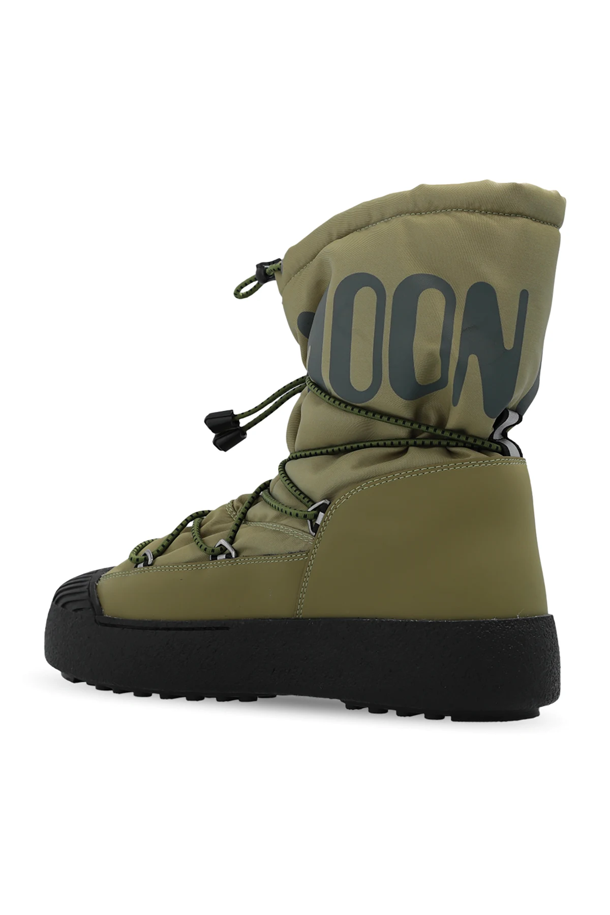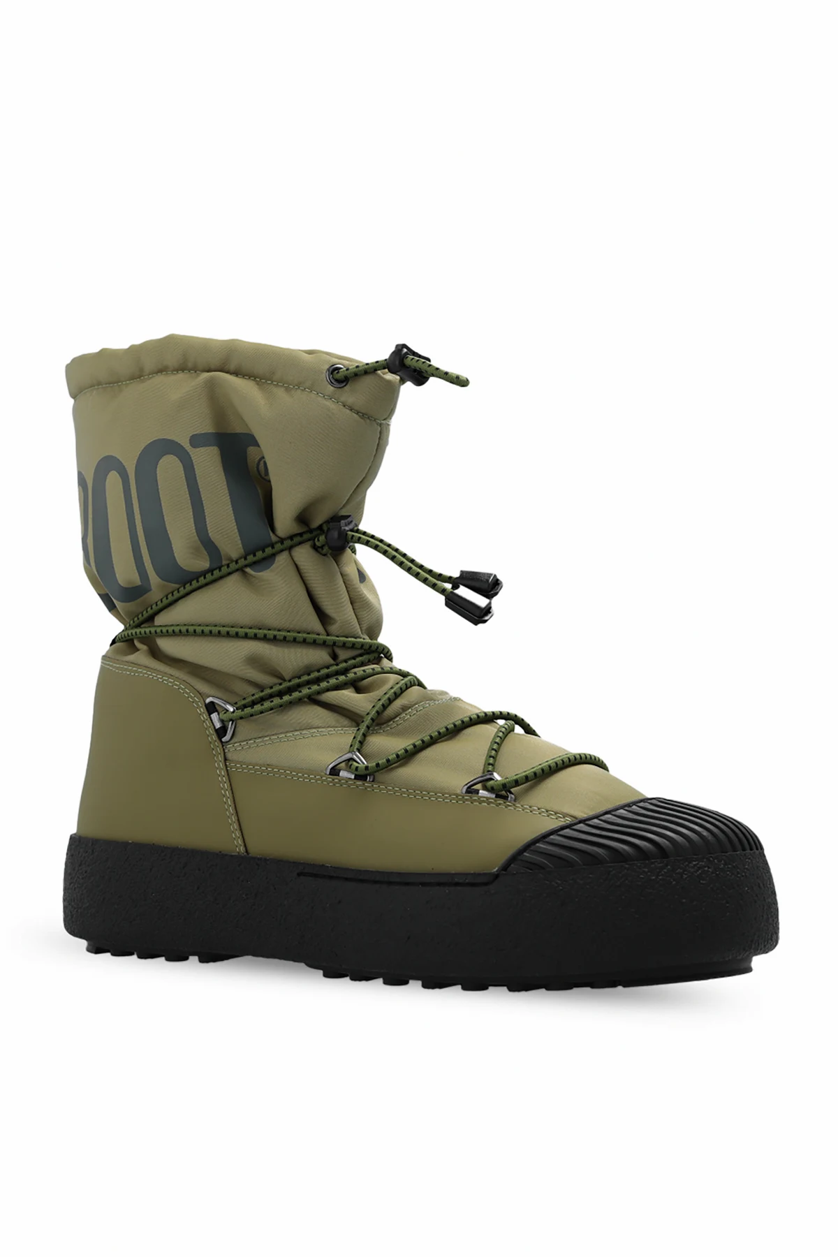 Khaki ‘Mtrack Polar’ insulated snow boots from Moon Boot. Crafted from water-repellent material, this model showcases a fast lacing system, a printed grey logo, rubber trims, a thermoplastic midsole and a black rubber outsole.