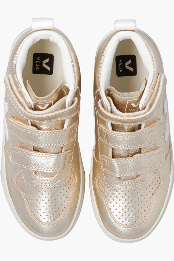Light gold-tone ‘V-10’ sneakers from Veja Kids. Crafted from chrome-free vegetable-tanned bovine leather, this pair has a velcro closure, perforations, pull strap at the back and white logo patch made of rubber and rice waste. The mesh inner lining made from recycled materials was developed to acquire a better resistance to friction. The organic-sourced and recycled insole is made from sugar cane, Amazon rubber, organic cotton and recycled EVA. It is set on a cream rubber sole made of organic and recycled materials.