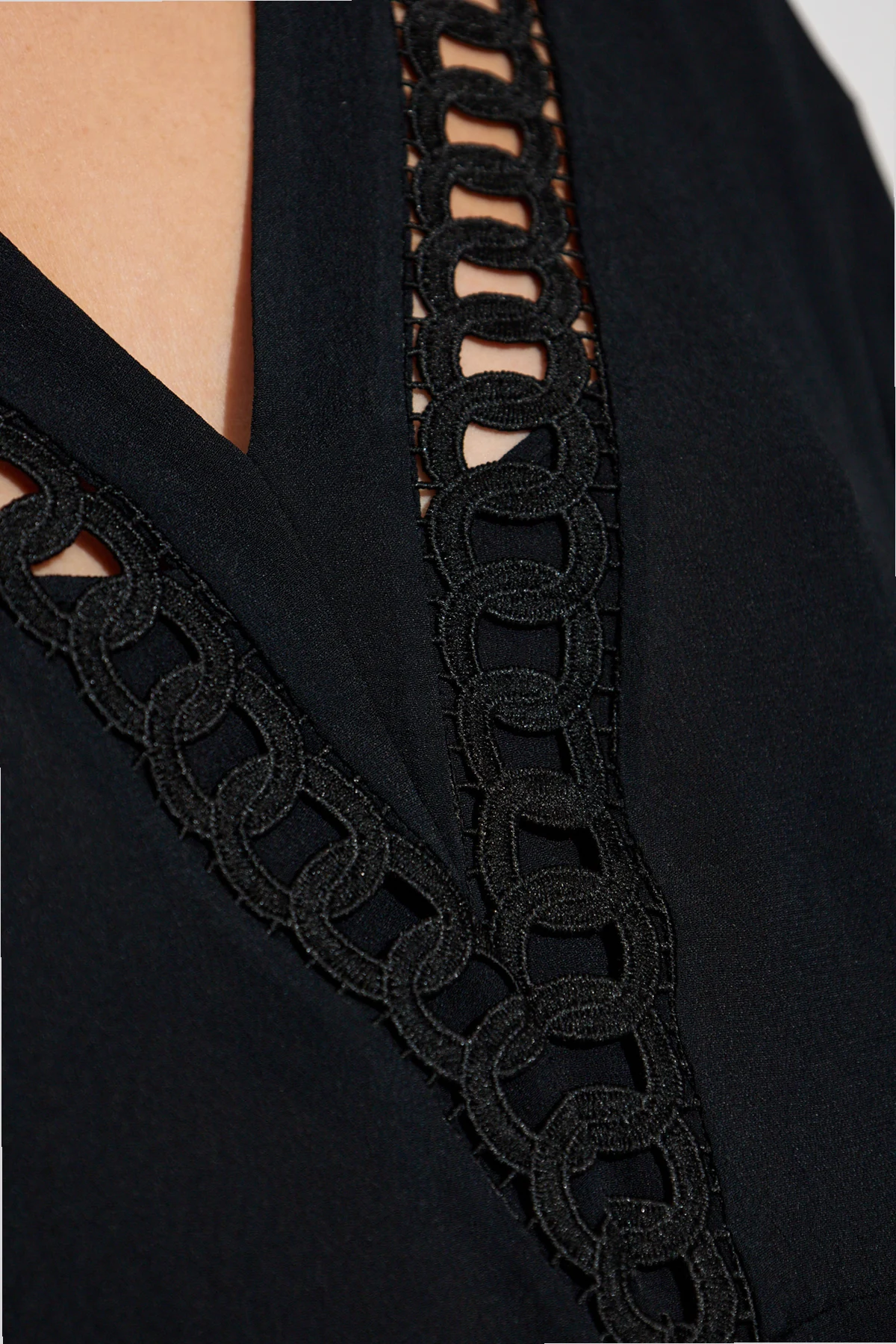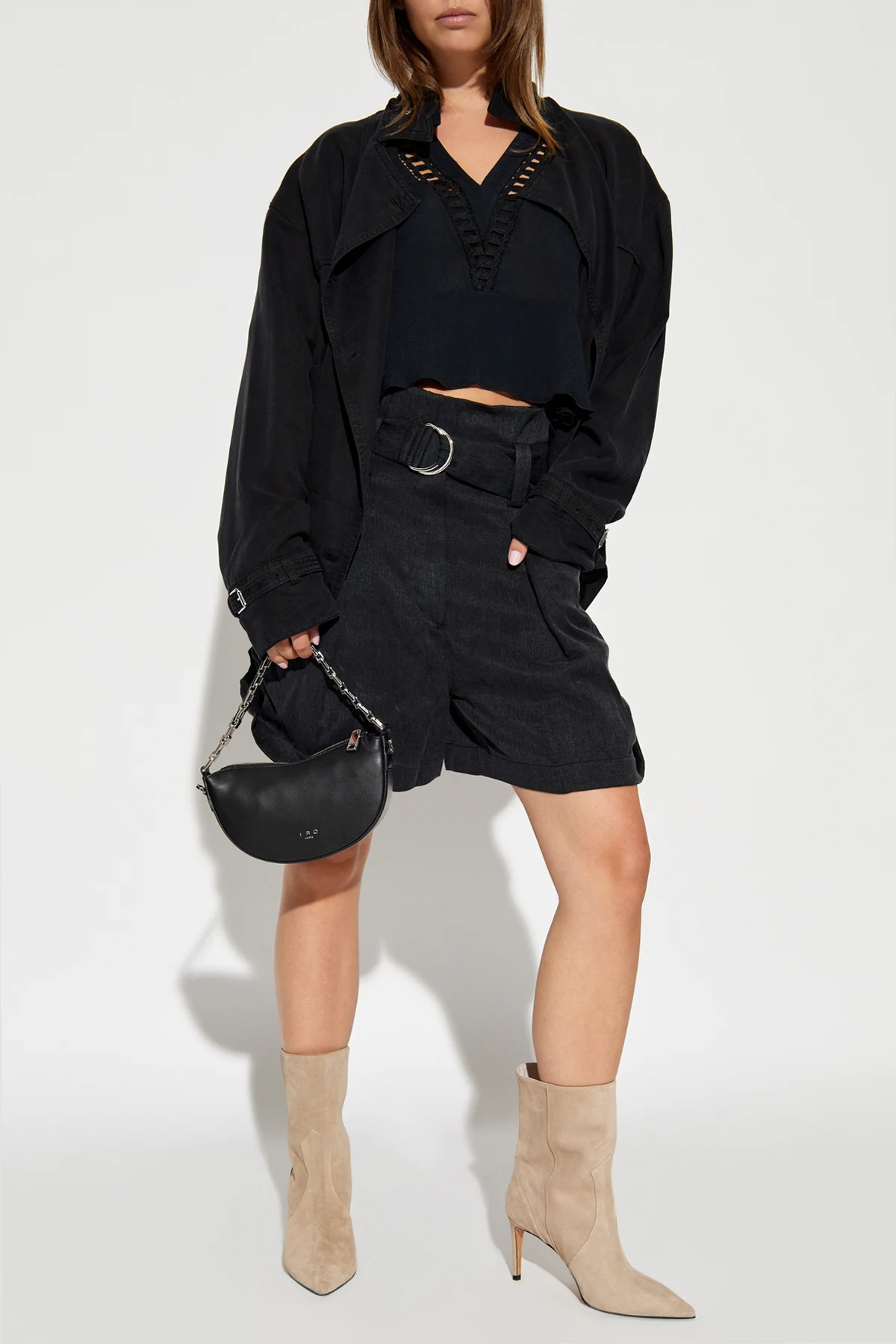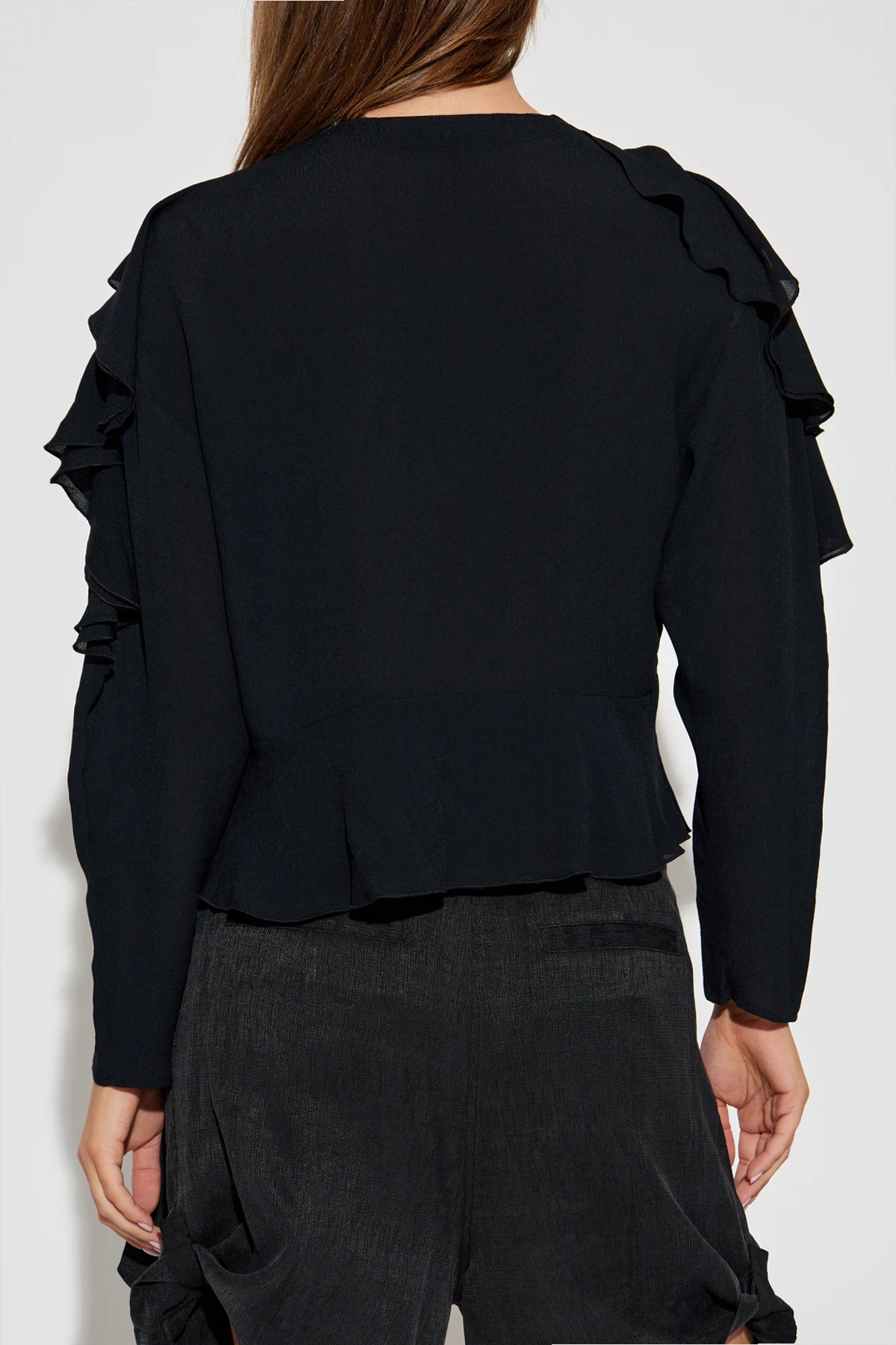 Introducing the exquisite "Begonia" top from the exclusive collection by Iro. This meticulously crafted black button-down top epitomizes elegance and sophistication. Design: Featuring a tailored fit with long, slightly puffed sleeves, the top boasts a minimalist yet refined silhouette. The V-neckline is adorned with a delicate, chain-like lace trim, extending along the neckline, adding a touch of opulence. Material: Made from 100% viscose, the fabric is lightweight and breathable, perfect for warmer days. Its soft and delicate texture ensures exceptional comfort. Details: Romantic ruffles embellish the shoulders and hemline, infusing the piece with a feminine charm. The top is cropped, ending just above the waist, making it an ideal match for high-waisted pants or skirts. A discreet side zipper provides ease of wear without compromising on style. Versatility: Styled effortlessly with black high-waisted shorts, beige booties, and a black handbag, the "Begonia" top showcases its versatility and potential for creating diverse ensembles. Why You Should Buy This Product: Timeless black hue for effortless pairing Exquisite lace trim for a luxurious touch Lightweight and breathable fabric for superior comfort Discreet side zipper for easy wear Versatile design suitable for various outfits