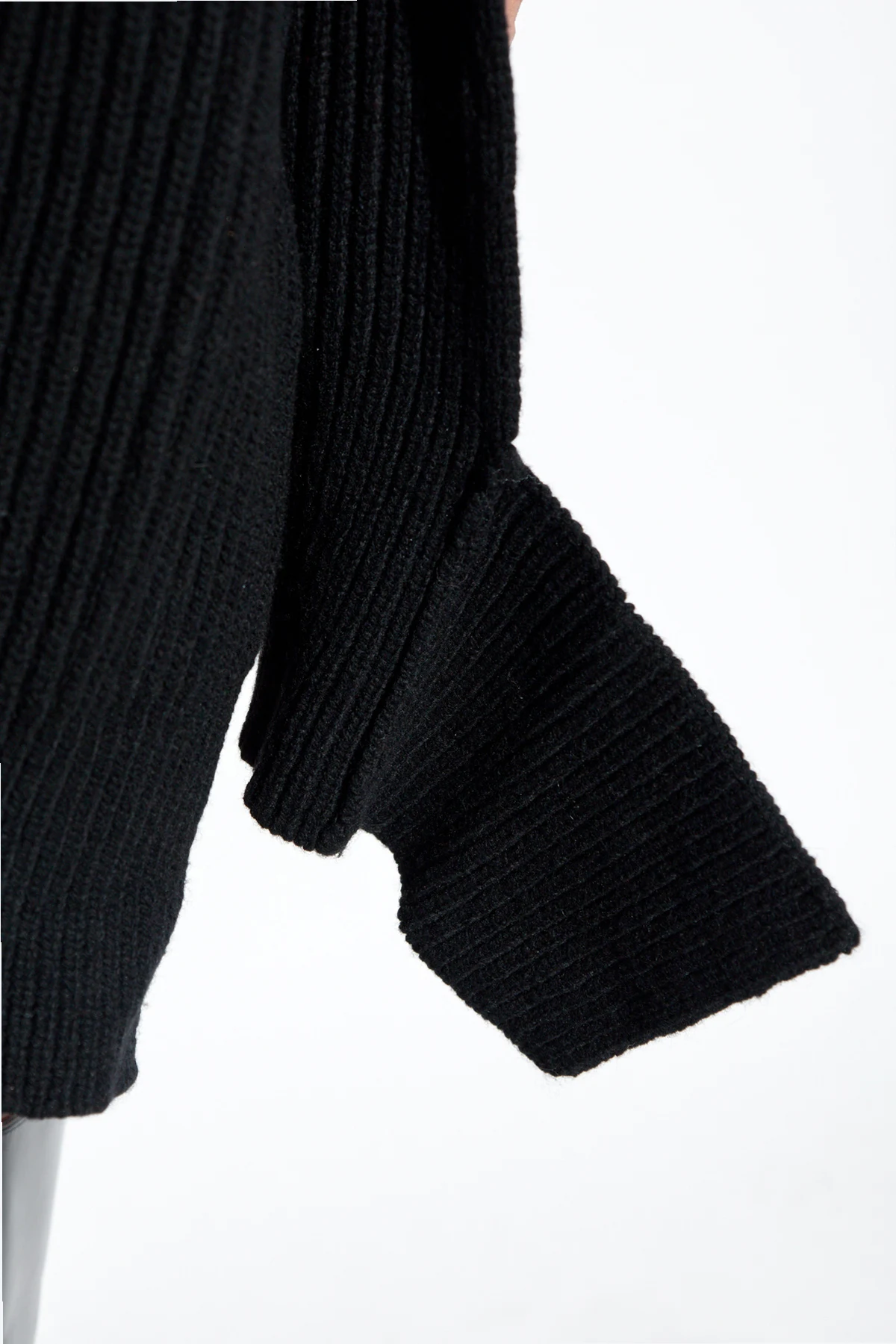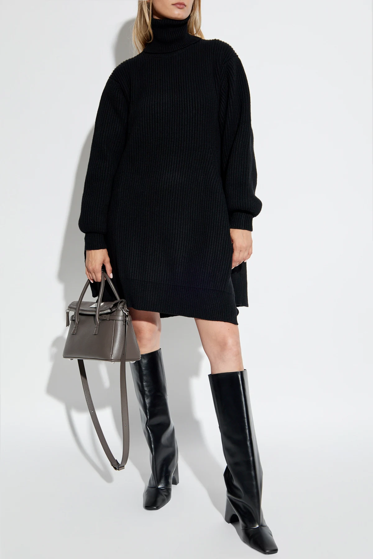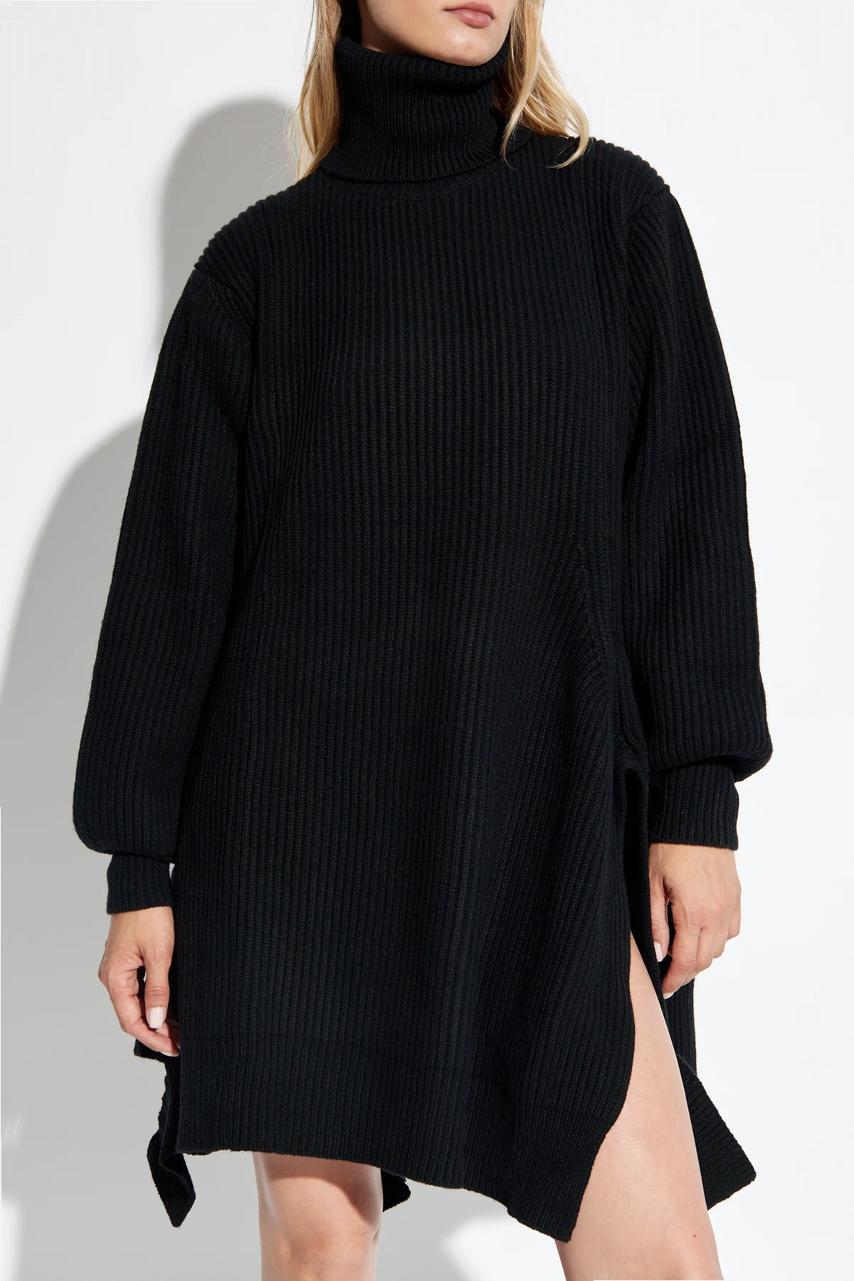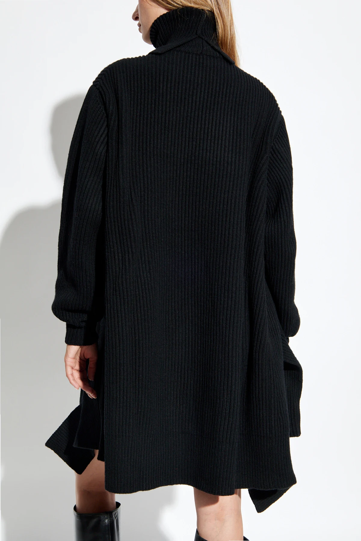 Indulge in the epitome of sophistication and comfort with the High-Neck Dress by the illustrious designer Yohji Yamamoto. This exquisite black dress is a testament to Yamamoto's unparalleled craftsmanship and avant-garde vision. Crafted from a sumptuous blend of wool and nylon, the dress boasts a ribbed knit pattern, ensuring warmth and elegance during cooler days. The oversized fit, complemented by its mid-thigh length, provides both ease of movement and a chic silhouette. The long sleeves, finished with cuffed hems, enhance its refined aesthetic. This dress features a high turtleneck, exuding an air of sophistication, while the asymmetrical hem with side slits infuses a contemporary edge. The minimalist design, devoid of logos or inscriptions, underscores its timeless elegance. Why Choose This Product? Luxurious wool-nylon blend for ultimate comfort and warmth. Elegant high-neck design adds sophistication. Modern asymmetrical hem with side slits. Versatile oversized fit suitable for various occasions. Crafted by renowned designer Yohji Yamamoto, reflecting a blend of gothic and futuristic inspirations.