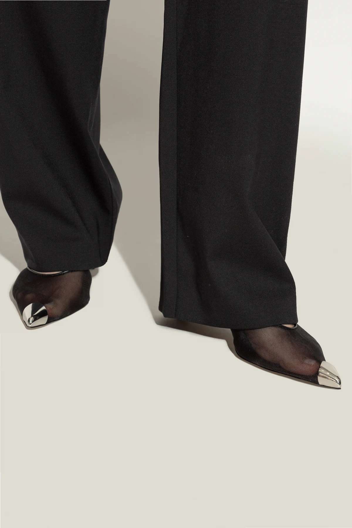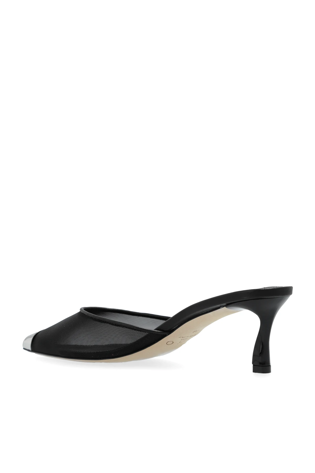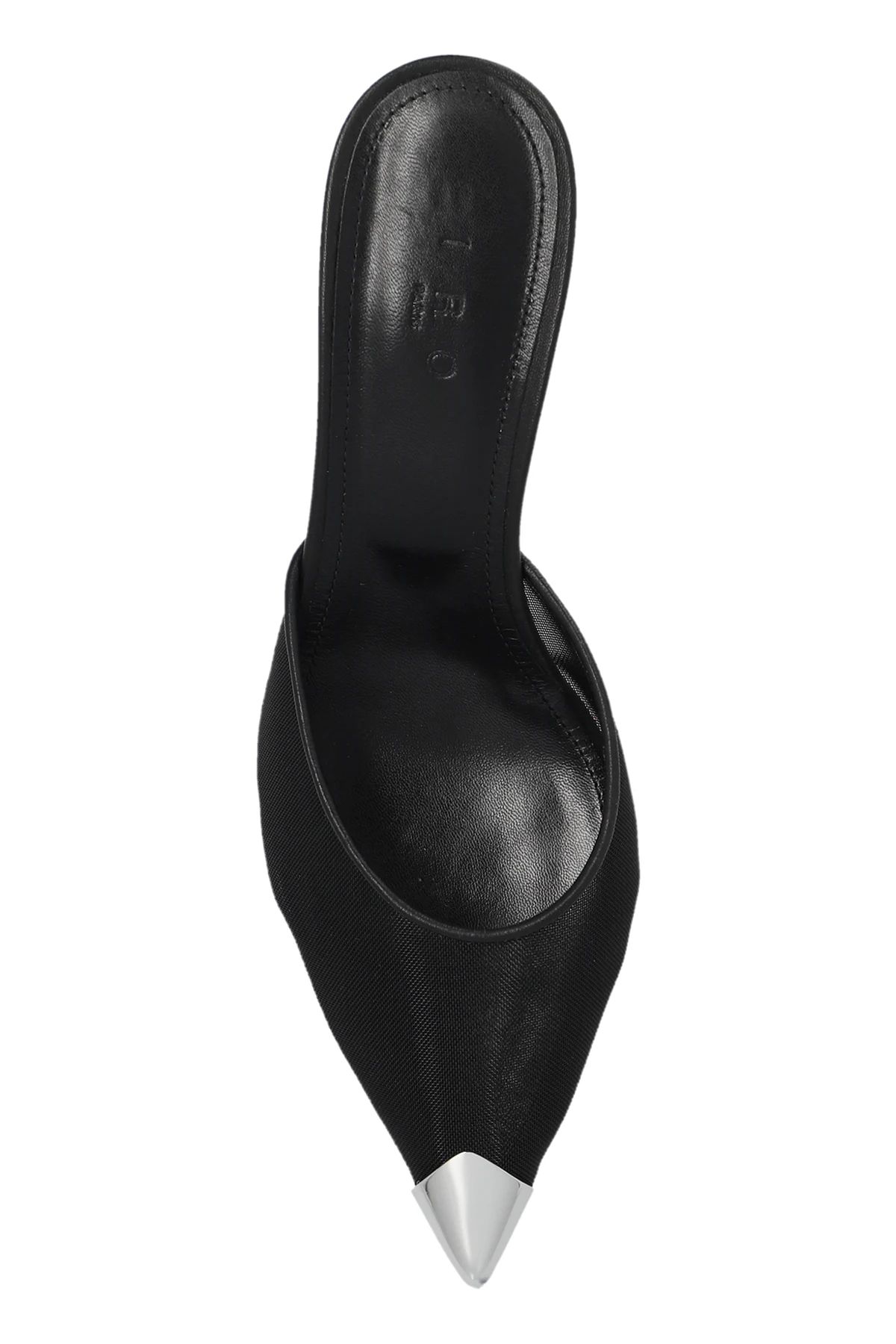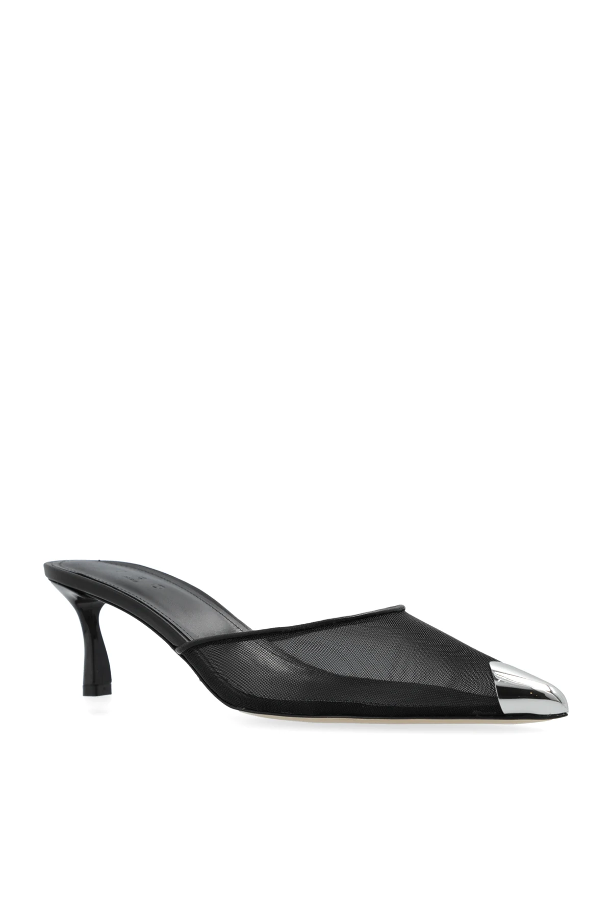 Introducing the Mumunet Heeled Mules from the exclusive Iro collection, an epitome of sophistication and contemporary design. These black mules feature a sleek, narrow pointed toe and a delicate kitten heel, exuding timeless elegance. Crafted from a sheer, black mesh, the main body of the shoe offers a lightweight and modern aesthetic. The standout feature is the metallic silver tip, adding a unique touch of luxury. Designed with a minimalist approach, these mules boast no visible logos or text, emphasizing their clean and refined look. The low, stable heel ensures comfort without compromising on style. The dominant black color palette, contrasted with the silver toe, makes these mules a versatile addition to your wardrobe. Perfectly paired with wide-leg trousers and a black blouse, they transition seamlessly from formal to evening wear. Why choose these mules? Elegant and slender silhouette with a kitten heel Sheer black mesh for a modern touch Metallic silver tip for a luxurious accent Minimalist design with no visible logos Comfortable and stable low heel Versatile styling for formal and evening occasions