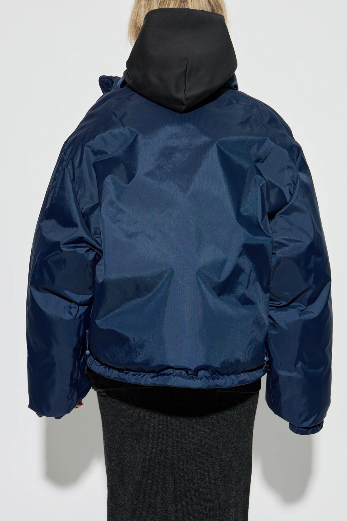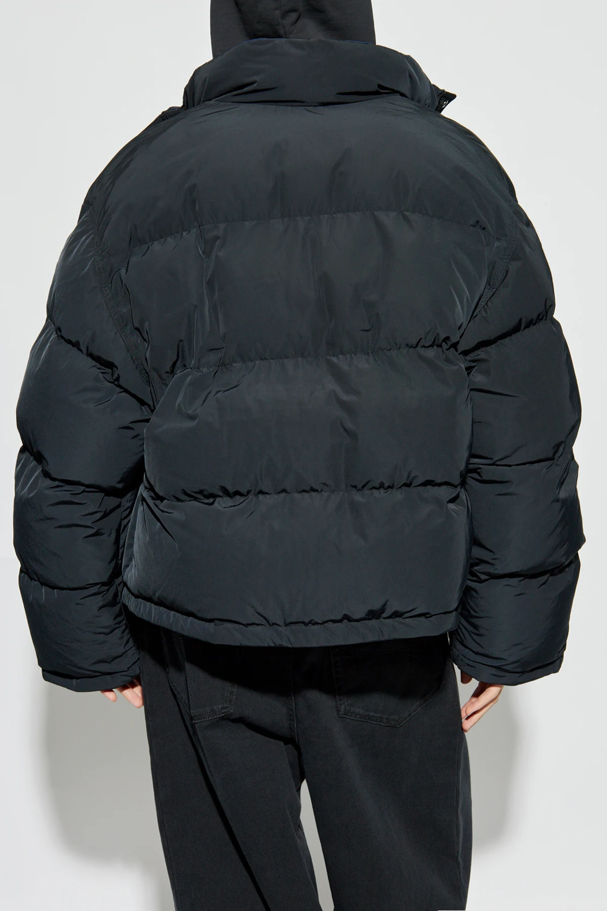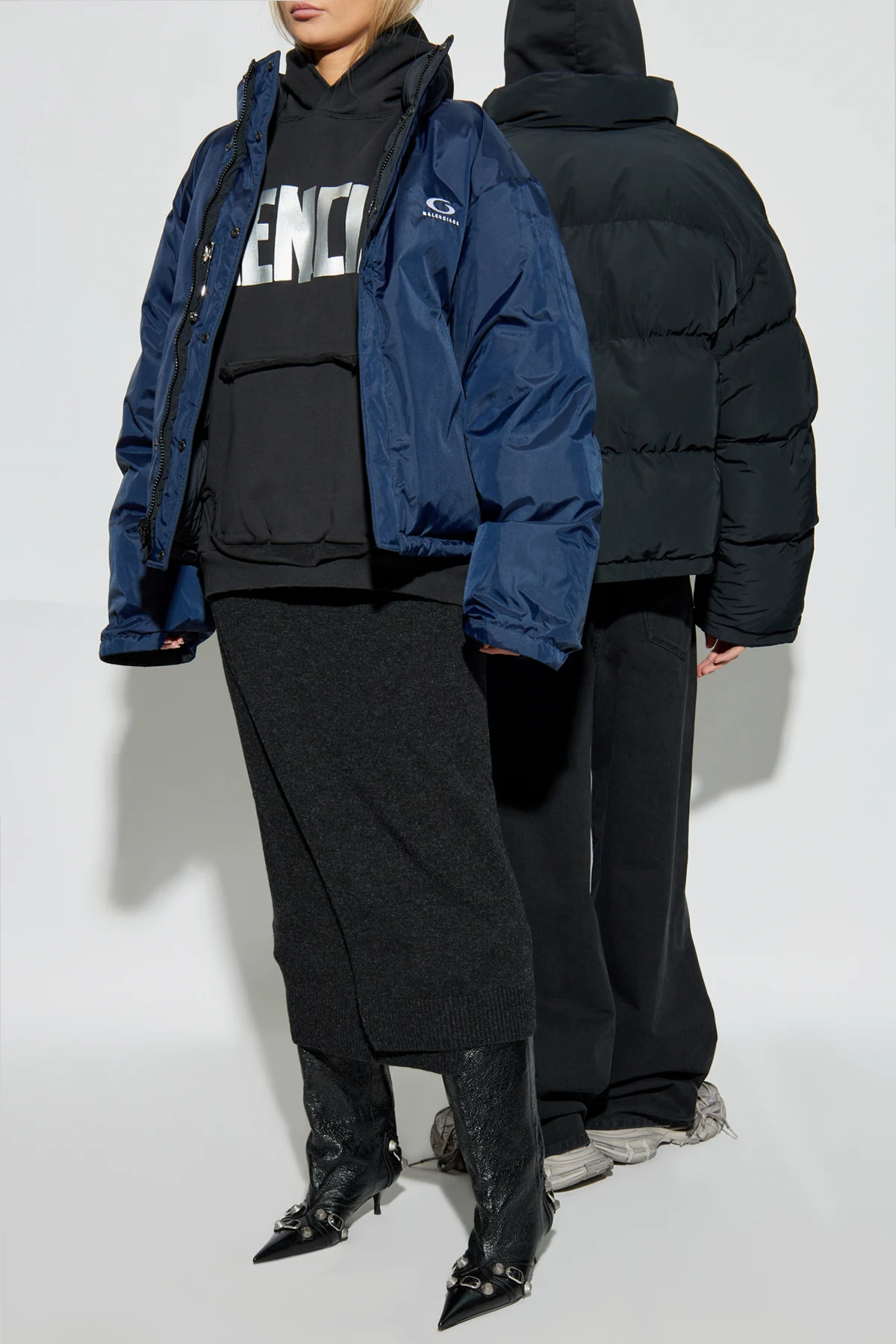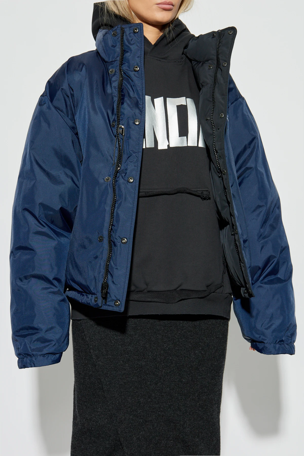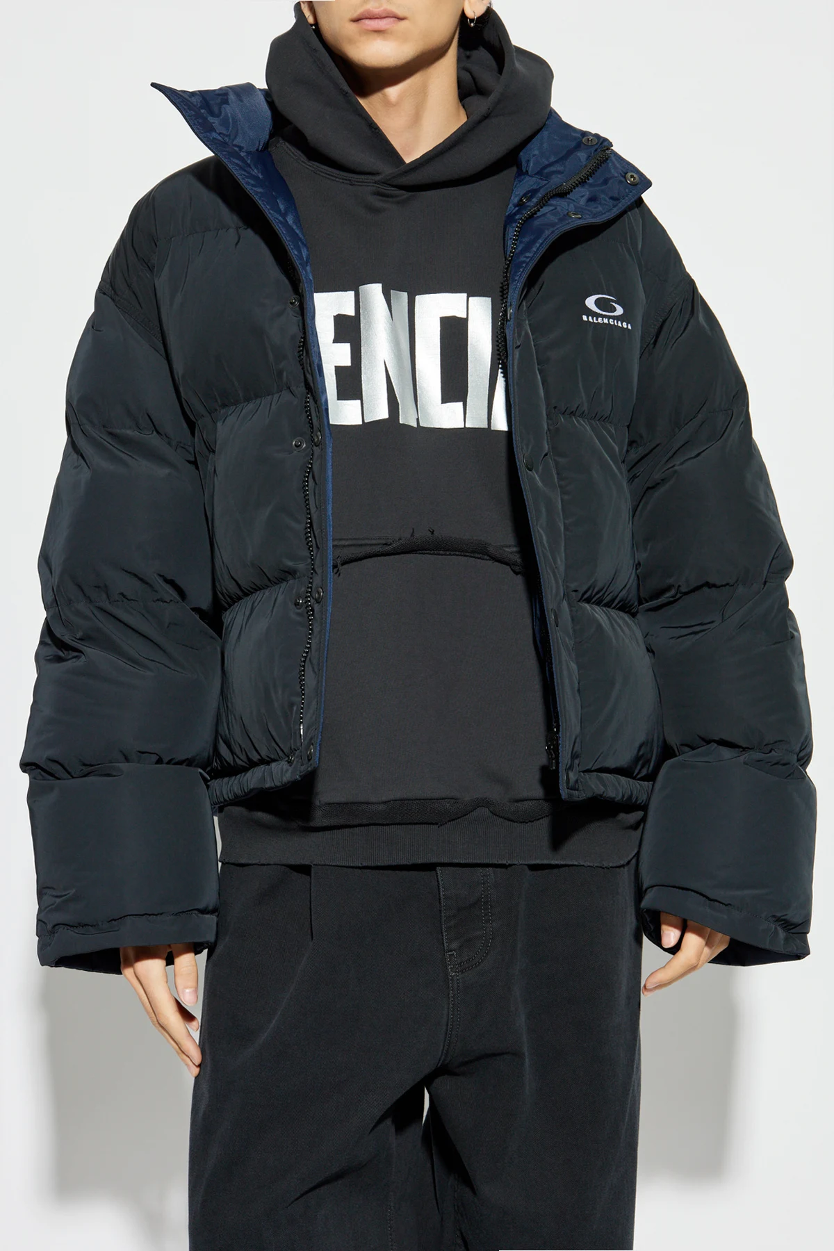Introducing the Reversible Insulated Jacket from the illustrious fashion house Balenciaga. This exquisite garment epitomizes the perfect fusion of innovative design and unparalleled craftsmanship, a hallmark of Balenciaga's storied legacy. Meticulously crafted with a quilted exterior, this jacket offers a sumptuous warmth that is ideal for the cooler seasons. The reversible design boasts a sophisticated black on one side and a contemporary navy on the other, allowing for versatile styling options. The high collar and dual closure system with both zipper and snaps ensure a snug and secure fit, providing both comfort and elegance. Adorned with the iconic Balenciaga logo in pristine white on the left chest, this jacket exudes a subtle yet unmistakable mark of luxury. The thoughtful inclusion of front zippered pockets on both sides adds practicality to its chic design, making it a functional yet fashionable addition to any wardrobe. Why Choose This Product? Reversible Design: Two stylish color options in one – black and navy. Premium Insulation: Crafted with polyester and silk for exceptional warmth. Elegant Details: High collar and dual closure system for added sophistication. Iconic Branding: Featuring the renowned Balenciaga logo on both sides. Practicality: Front zippered pockets for secure storage.