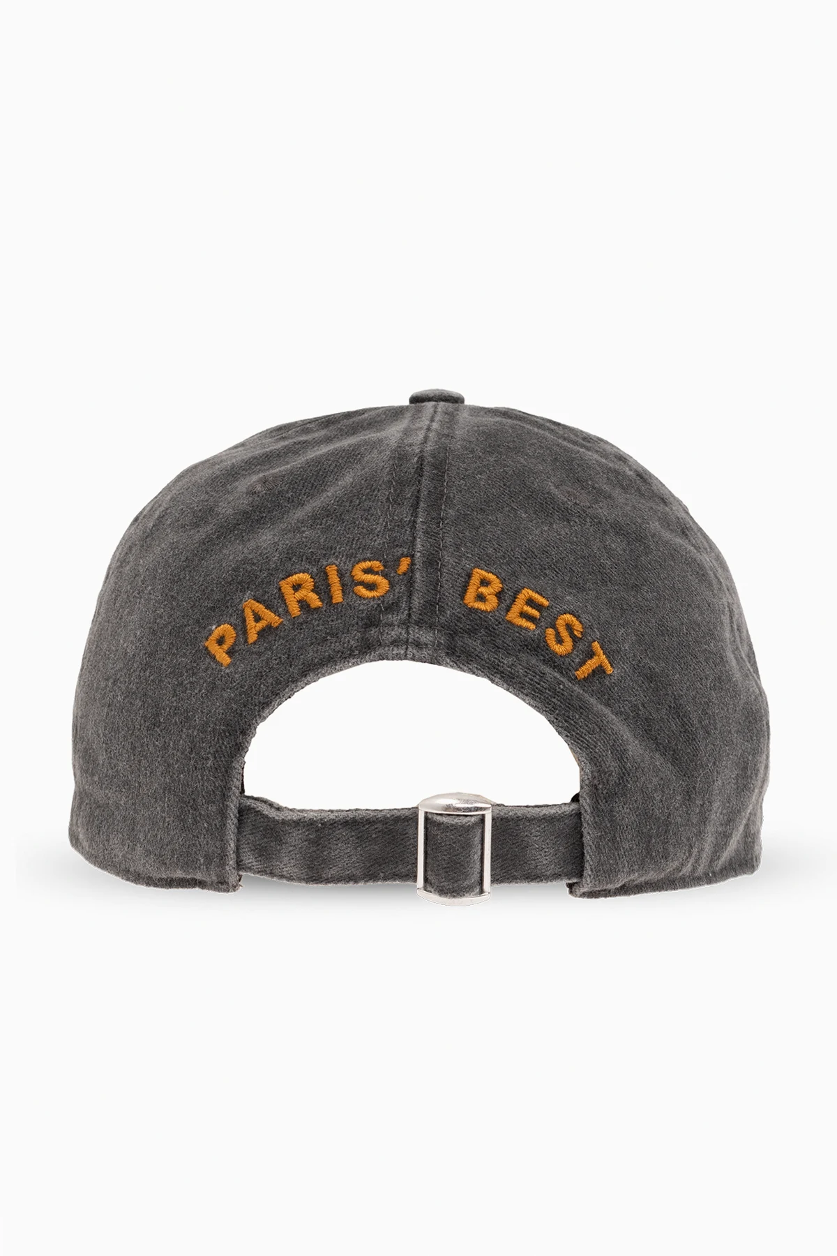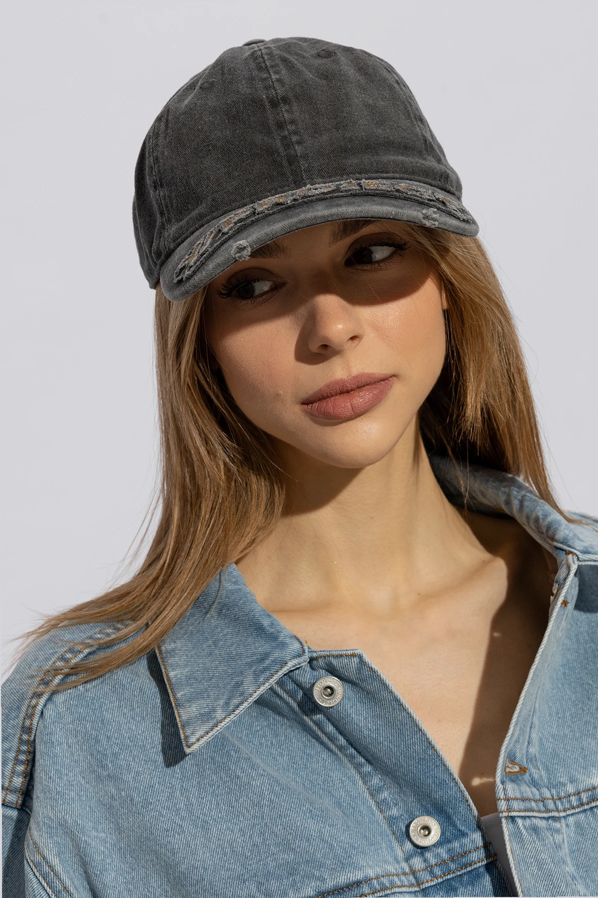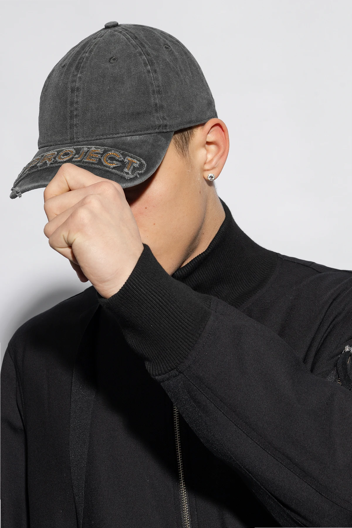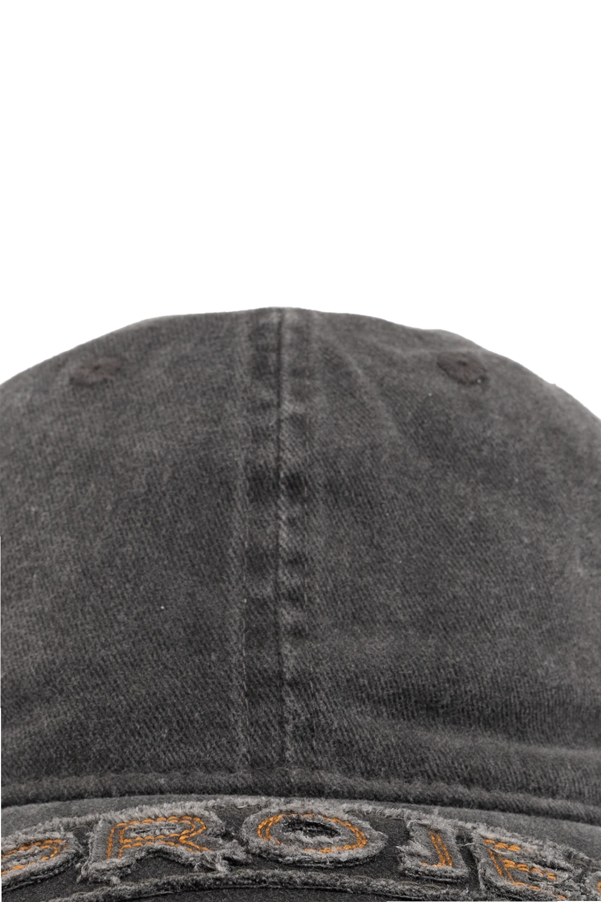 Dark grey baseball cap from Y Project. Made of denim, this item adjusts via a back strap and showcases a logo patch, brown lettering embroidery on the back and distressed and discolouration effects for a vintage look.