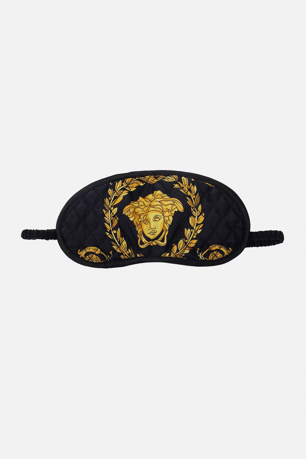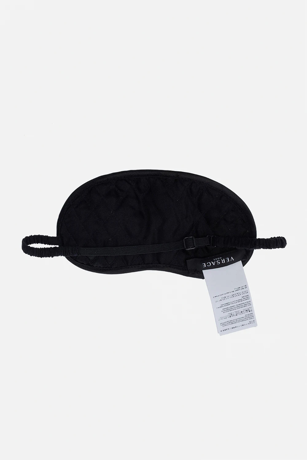 Black sleep mask from Versace Home. Made of silk, this item features quilted detailing, an adjustable strap and the brand's signature baroque pattern in yellow and orange.