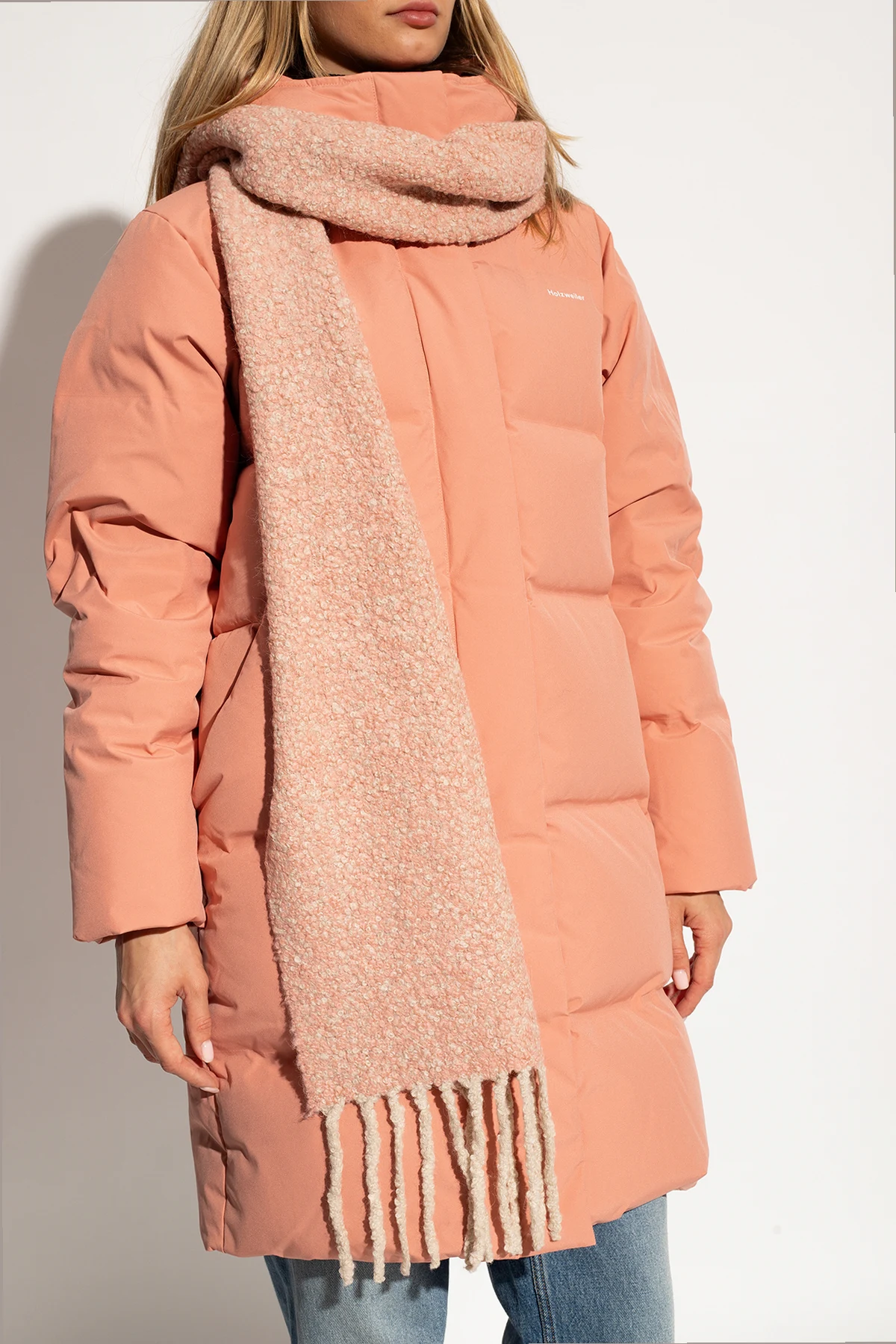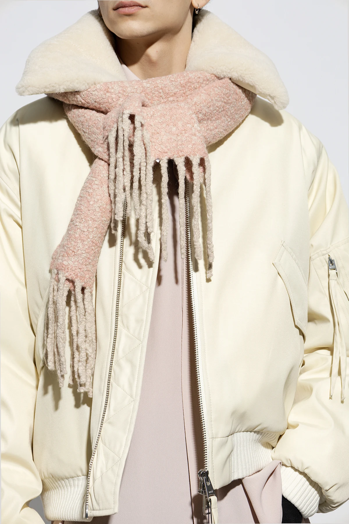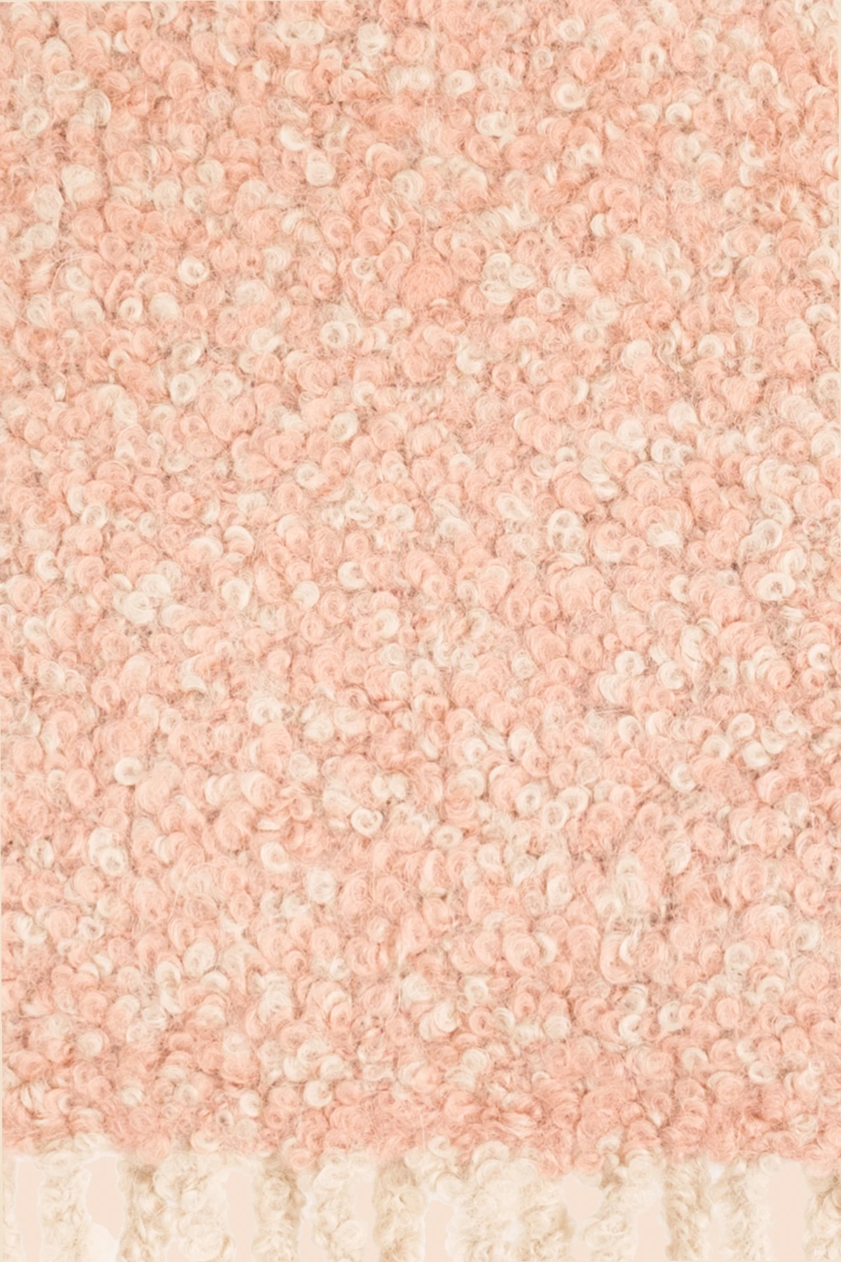 Pink and cream ‘Vinica’ melange scarf with fringes from Holzweiler. Made of alpaca.