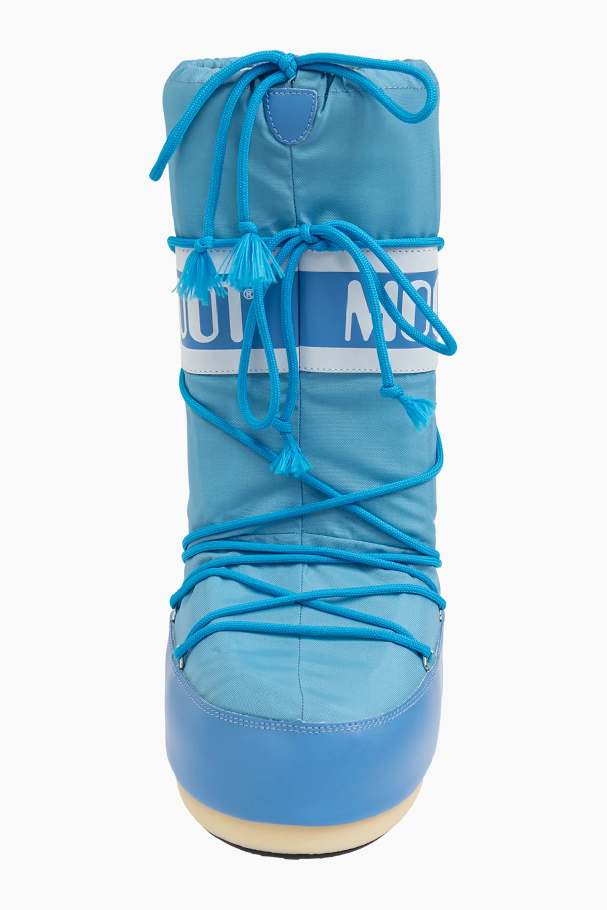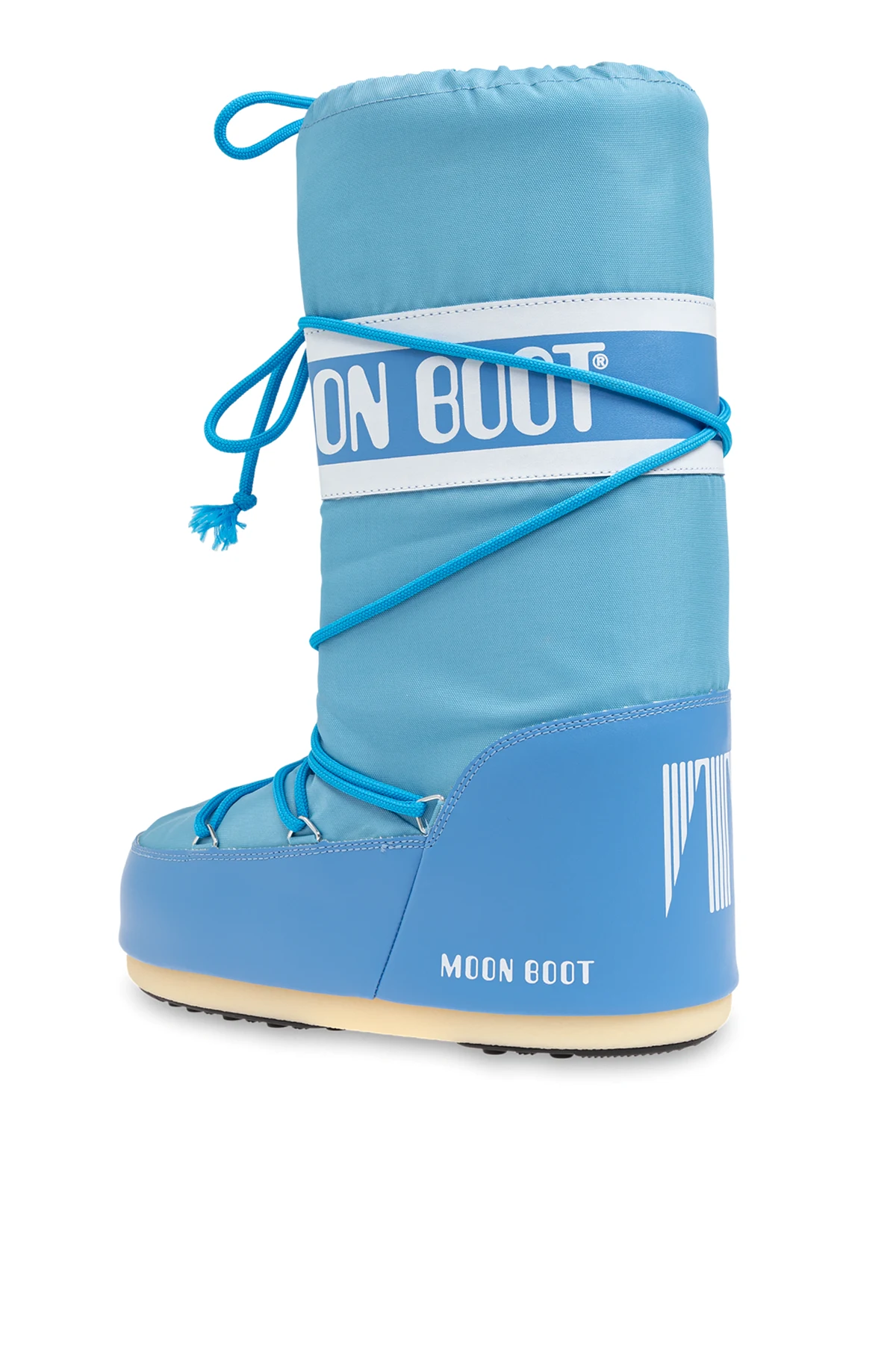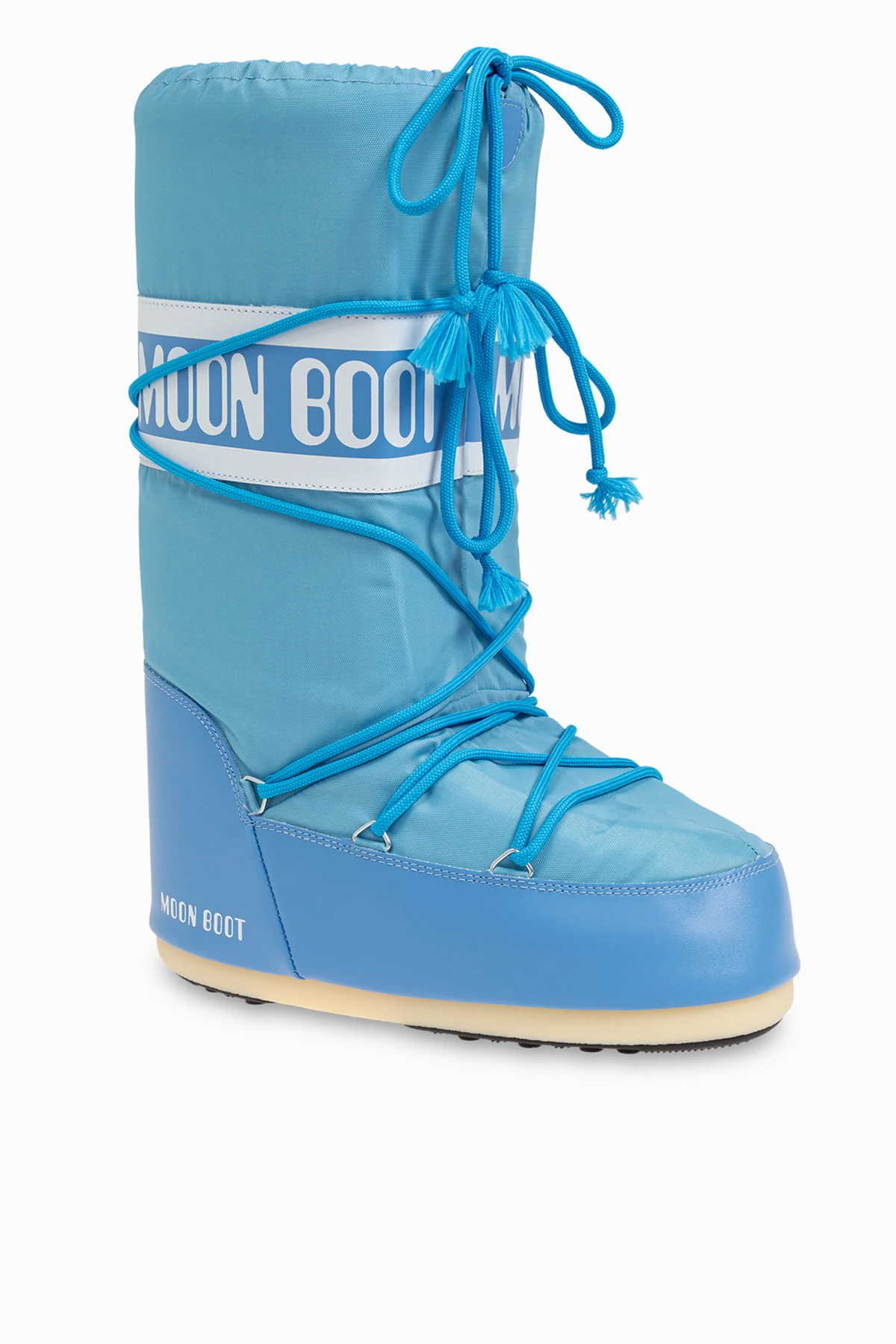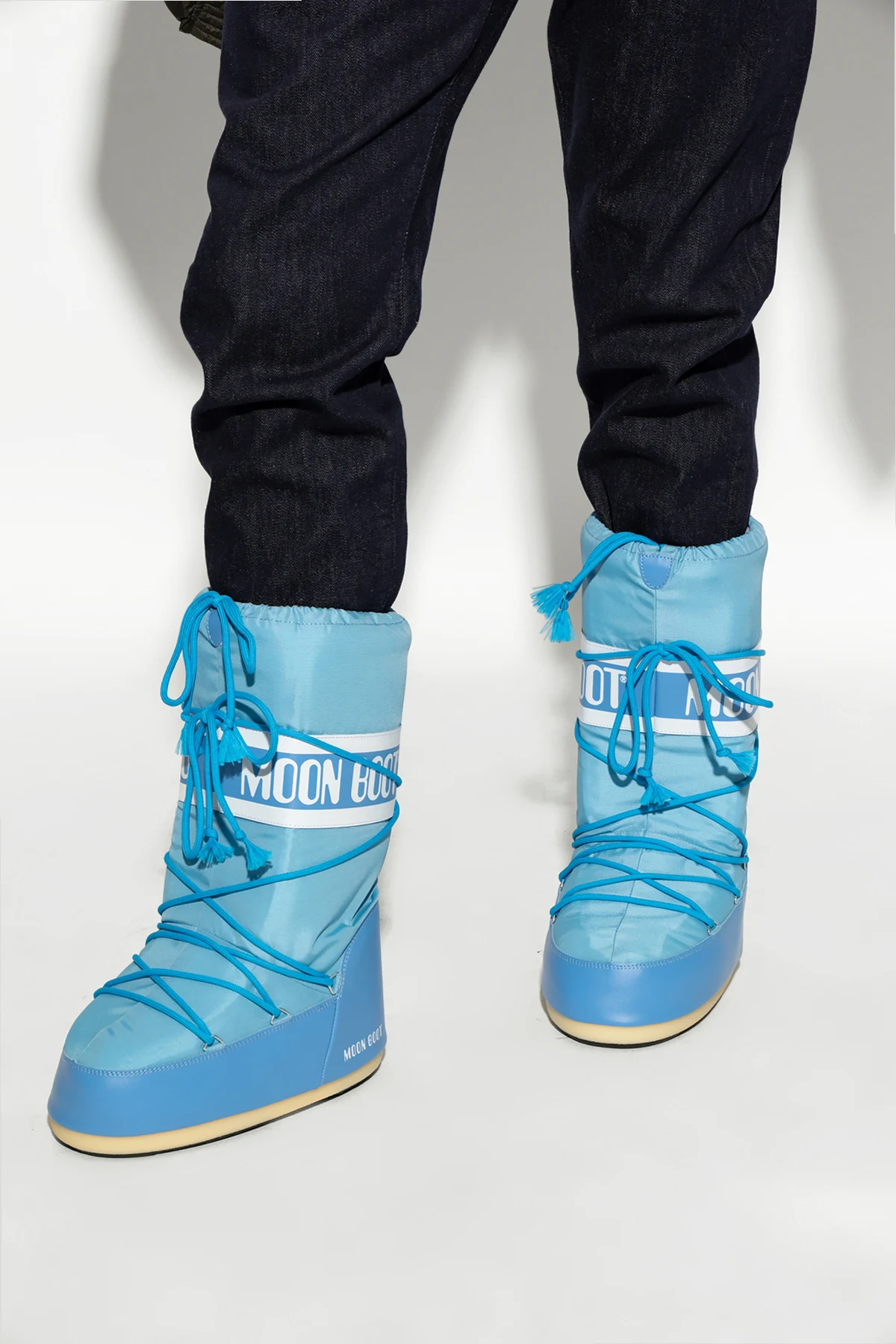 Introducing the Icon Nylon snow boots by Moon Boot, an epitome of winter elegance and functionality from the exclusive men's collection. Bathed in a captivating light blue hue, these boots are designed to make a statement while offering unparalleled comfort and protection against the harshest winter conditions. The boots feature a distinctive, high silhouette reaching almost to the knee, adorned with the iconic white "MOON BOOT" logo on a broad, white strap encircling the top. Nifty blue laces wrap around the entire shaft, creating a decorative pattern and ensuring a snug fit. Crafted from durable, waterproof nylon for the upper part and moisture-resistant synthetic material for the foot area, these boots promise to keep your feet dry and warm. The rubber outsole provides excellent traction on snow and ice, making them ideal for winter escapades. Additional details include a white logo on the lower back, tassels on the lace ends for a touch of sophistication, and a uniform light sole that contrasts beautifully with the blue upper. Why Choose This Product? Exclusive Design: High boots with a distinctive logo and decorative laces. Superior Materials: Waterproof nylon upper and moisture-resistant synthetic foot area. Exceptional Comfort: Designed to provide maximum warmth and comfort in winter conditions. Optimal Traction: Rubber outsole ensures excellent grip on snow and ice. Iconic Style: From the legendary brand Moon Boot, known for its innovative and stylish winter footwear.