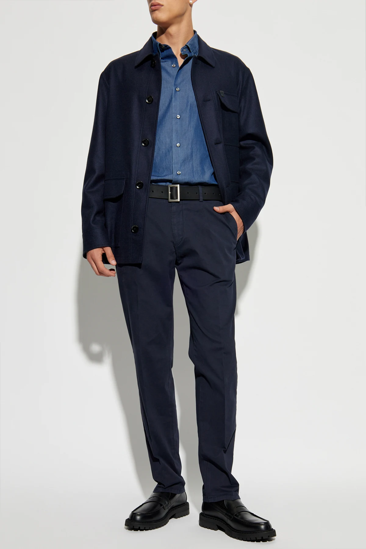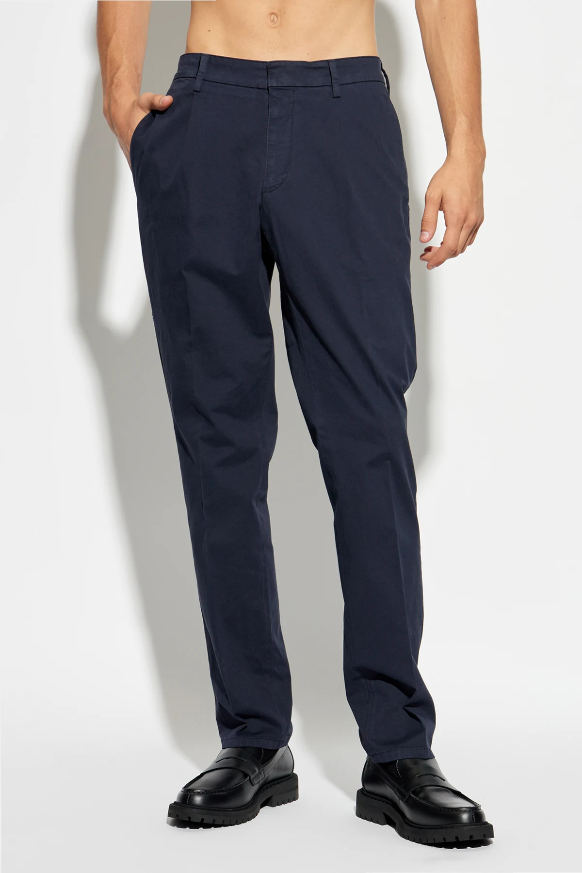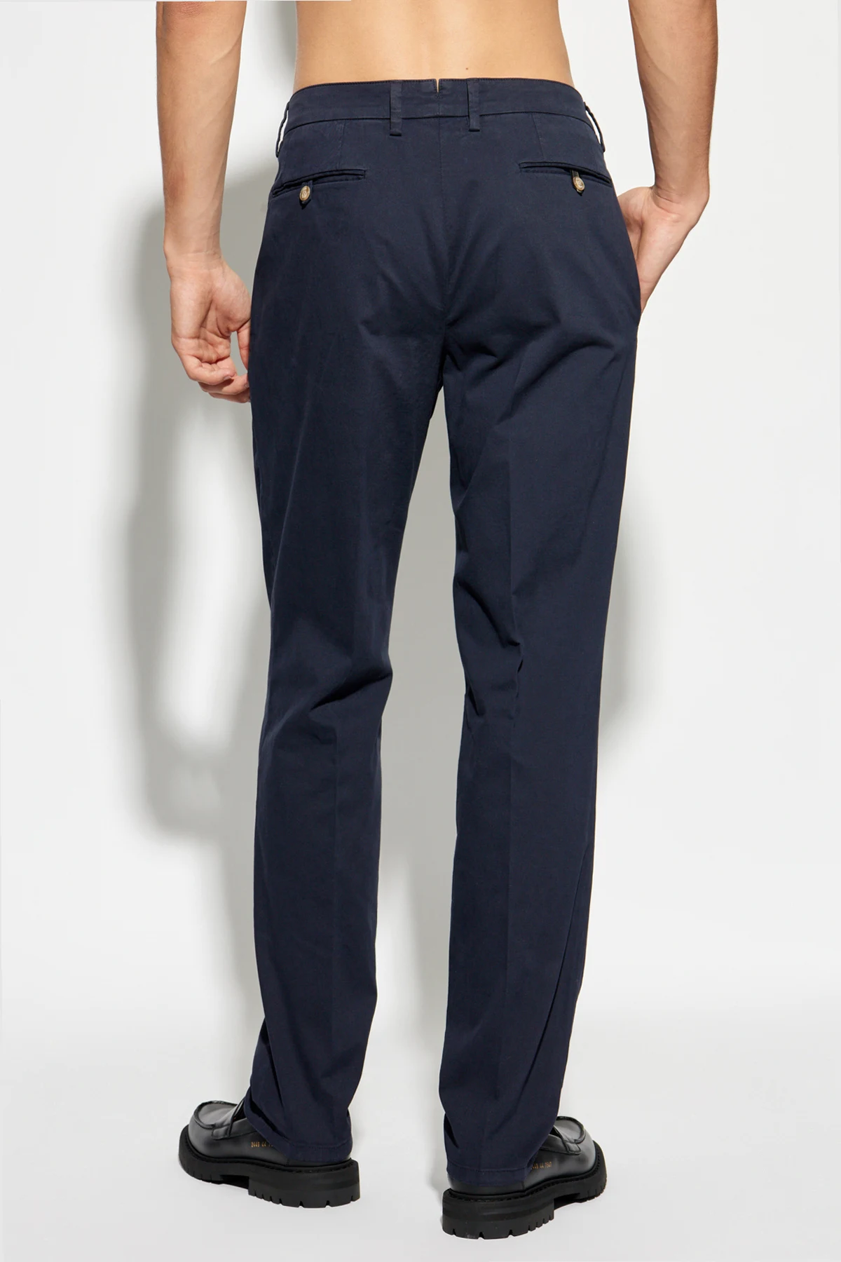 Introducing the Spodnie z kieszeniami, a distinguished piece from the exclusive collection by Brioni. These trousers epitomize elegance and formality with their classic, straight cut and refined navy hue. Crafted from a smooth blend of cotton and elastane, these trousers offer both comfort and a superior fit. The front pleats add a touch of sophistication, while the meticulously finished seams accentuate the structure and shape. Featuring side pockets and button-secured rear pockets, these trousers are as functional as they are stylish. The waistband is equipped with belt loops, and the front closure boasts a zipper, button, and hook for secure fastening. Why Choose This Product? Exquisite craftsmanship from Brioni, renowned for luxury and perfection. Elegant, formal design suitable for various occasions. High-quality fabric blend for comfort and durability. Functional details including multiple pockets and secure closures.