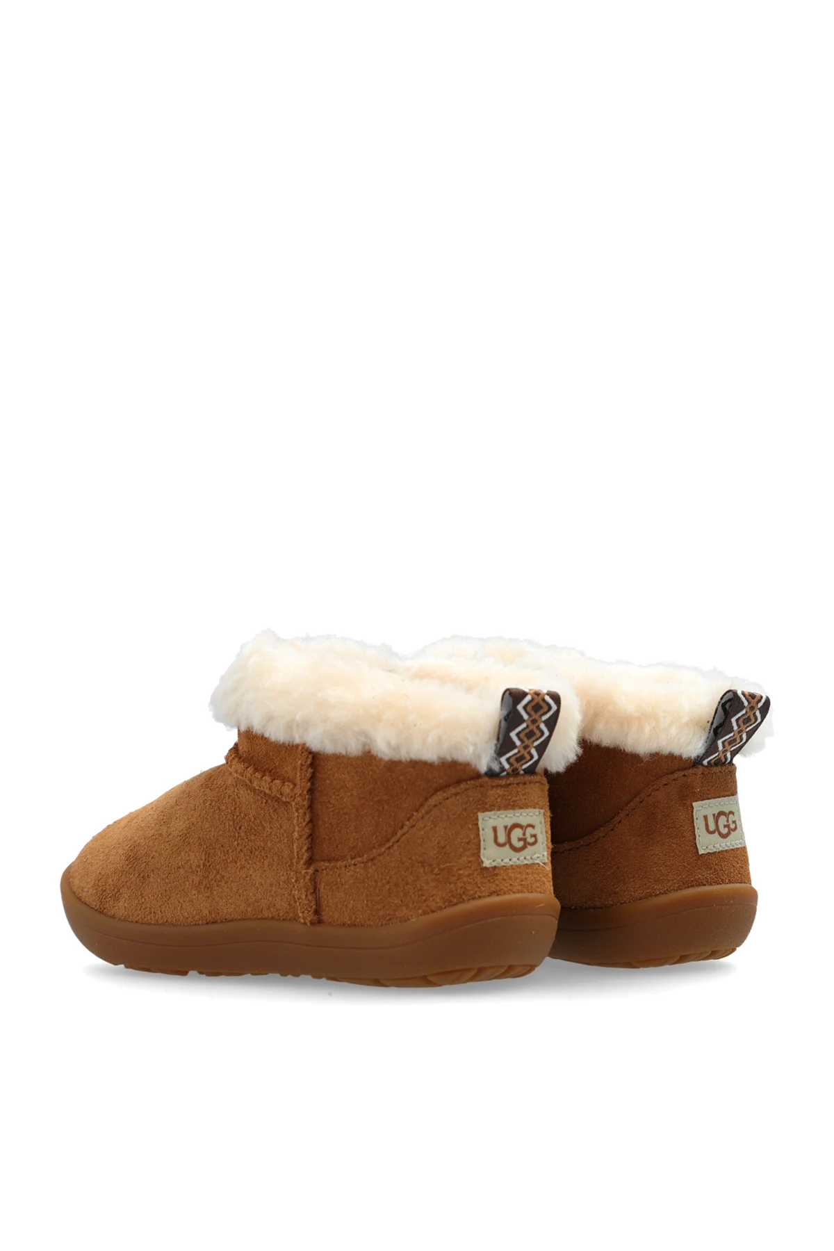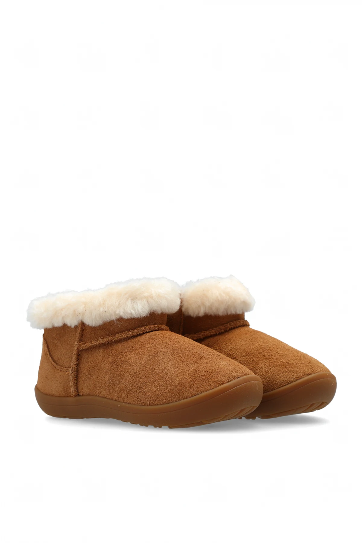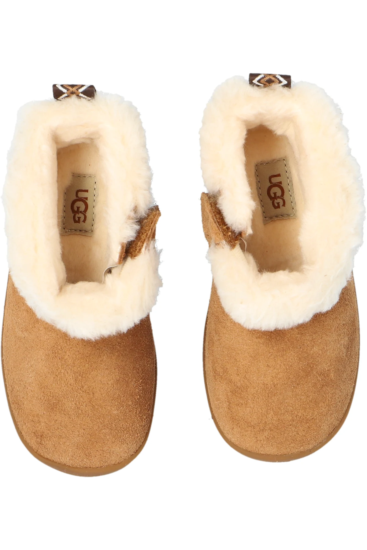 Introducing the Toddler Kinsey snow boots by UGG Kids, an exquisite addition to premium children's footwear. These boots boast a timeless, simplistic design with a rounded toe and short shafts adorned with wide, plush fur trim. Crafted from sumptuous brown suede, the exterior exudes sophistication, while the interior is lined with soft, white fur to ensure warmth and comfort. A brown rubber sole provides exceptional grip and durability, making these boots perfect for chilly days. Details such as the UGG logo patch on the rear and practical rear pull tabs make these boots both stylish and functional. Velcro closures on the inner sides offer an adjustable fit for your child's feet. Why Choose This Product? Elegant Design: Classic shape with a rounded toe and plush fur trim. Premium Materials: Luxurious brown suede and soft interior fur lining. Practicality: Rear pull tabs and Velcro closures for ease of use. Durability: Brown rubber sole for excellent grip and longevity. Comfort: Ultra-cozy interior lining for warmth and moisture control.