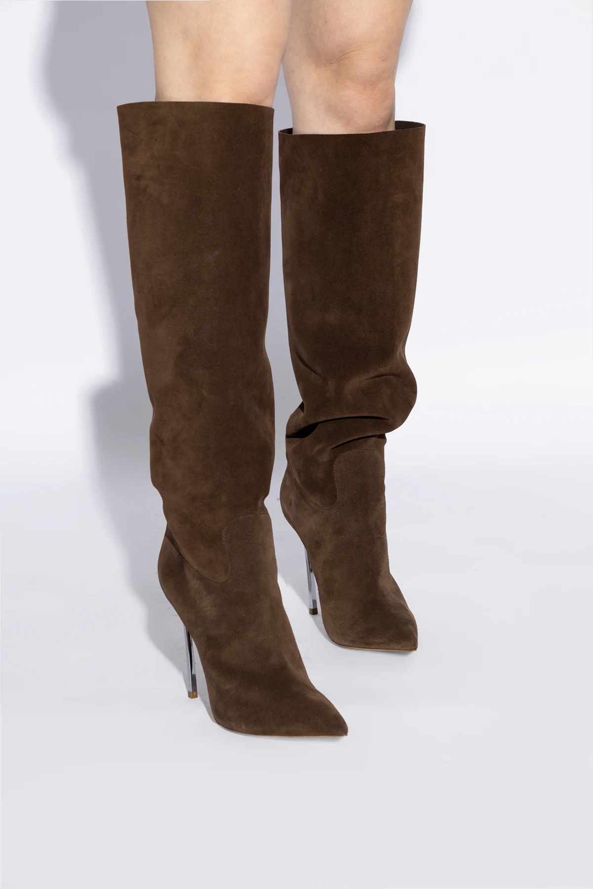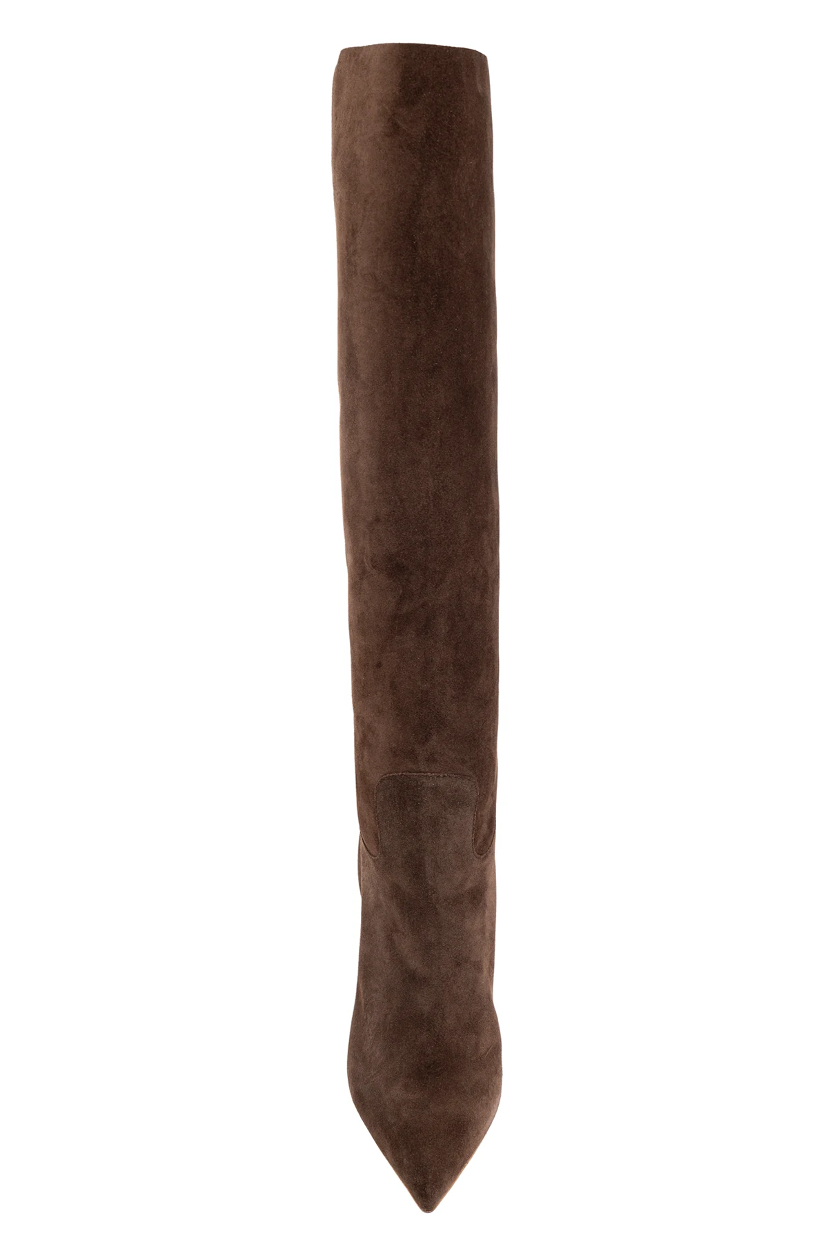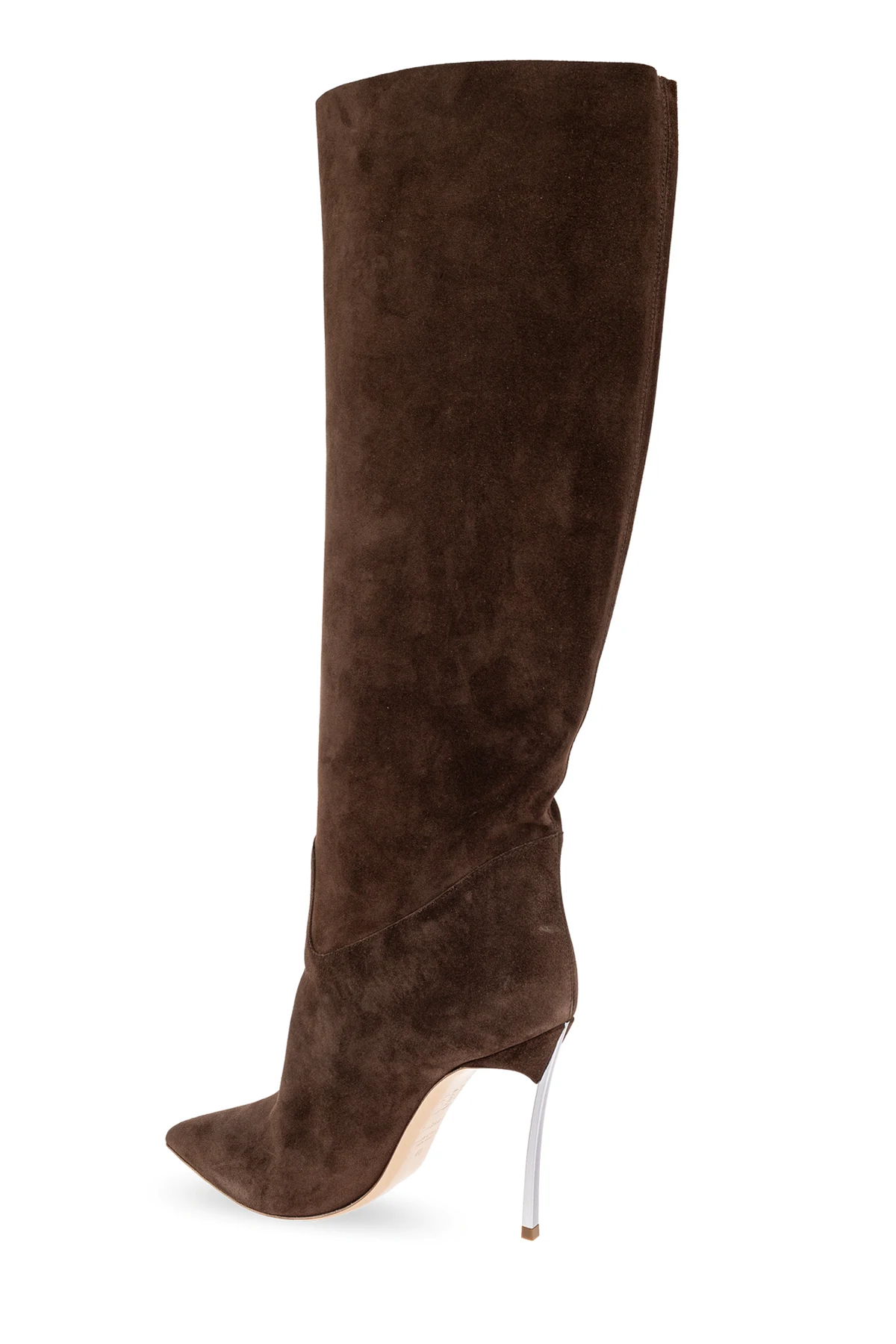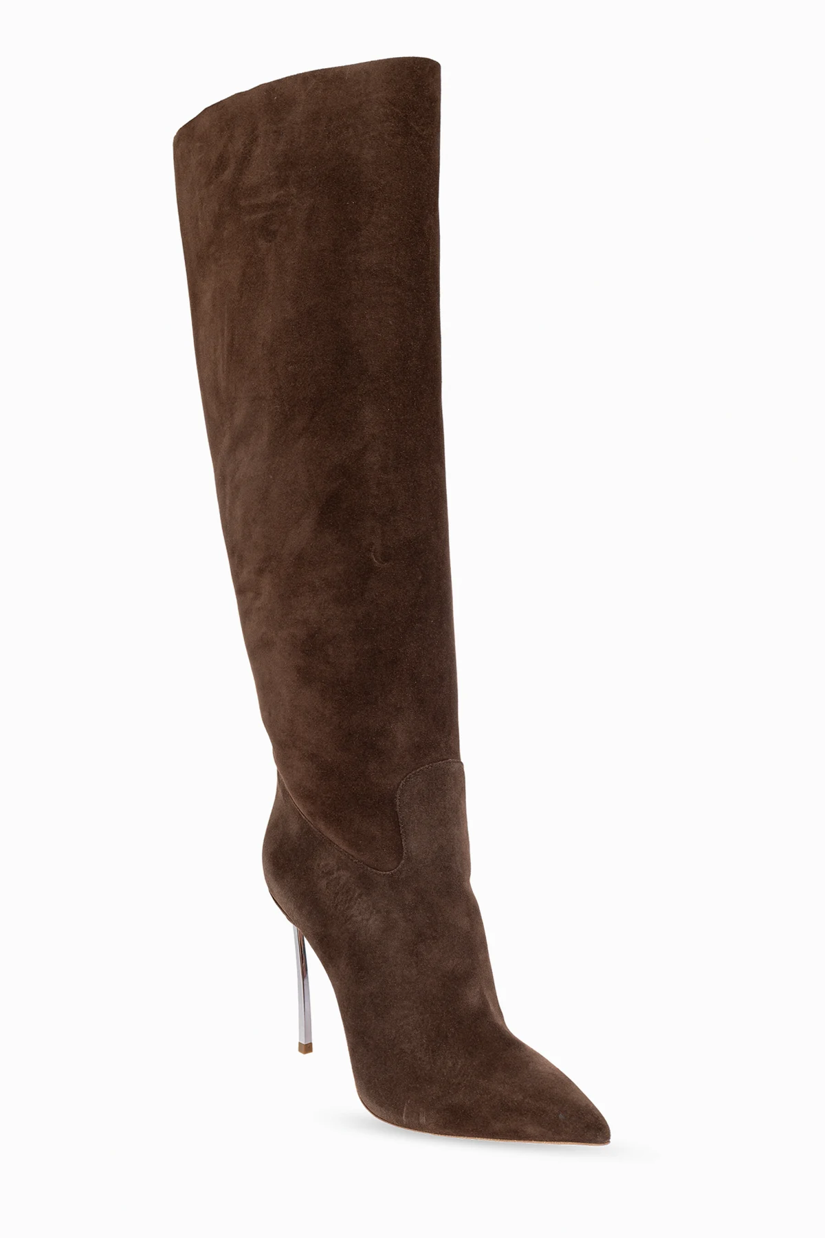 Introducing the Plonge boots by Casadei, a testament to unparalleled sophistication and timeless style. These knee-high boots captivate at first glance with their deep, uniform brown hue, embodying an essence of refined elegance. Crafted from the finest suede-like leather, the Plonge boots exhibit an exquisite matte finish, offering a tactile sensation of softness and flexibility. The silhouette of these boots is effortlessly chic, with a design that gracefully envelops the leg just above the knee, ensuring a blend of comfort and liberating movement. The high, slender heel, polished to a gleaming contrast against the boot's matte surface, elongates the leg with its stiletto shape, adding an air of grace and poise. The pointed toe further accentuates the boot's sophisticated character, making it a quintessential piece for the discerning fashion enthusiast. Why Purchase the Plonge Boots? Unmatched elegance with a deep, rich brown color that complements any ensemble. Superior comfort and flexibility, thanks to the high-quality, suede-like leather construction. An elongated silhouette achieved with a sleek, high heel and pointed toe, designed to enhance your natural grace. Exclusivity from renowned designer Casadei, ensuring your footwear stands out with distinction.