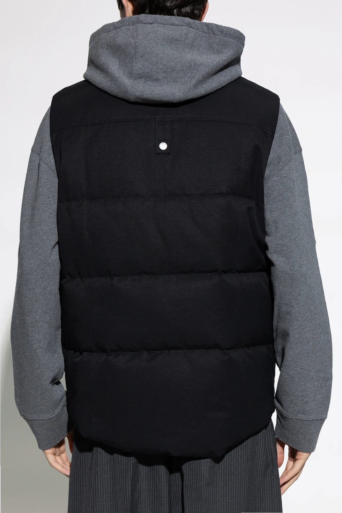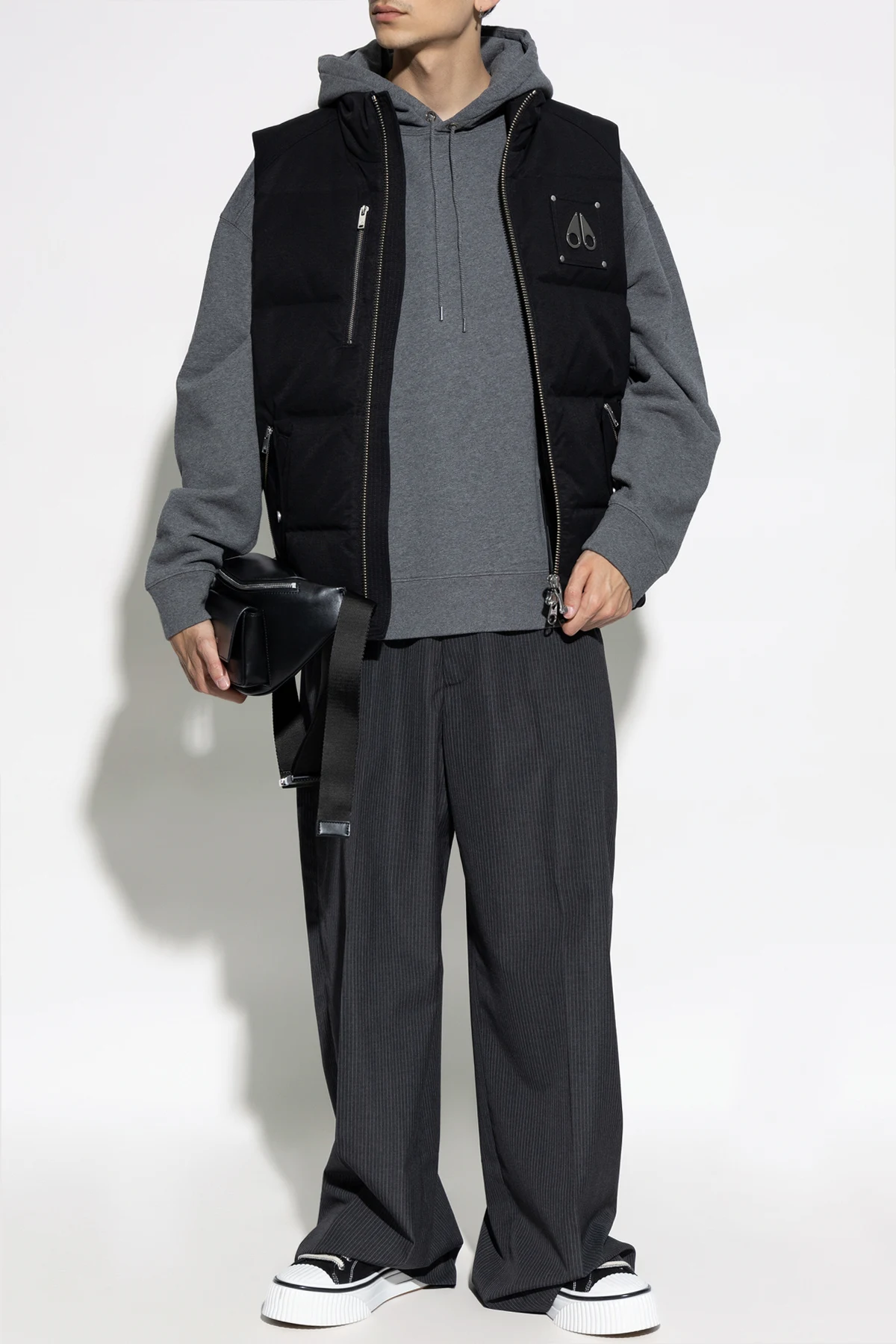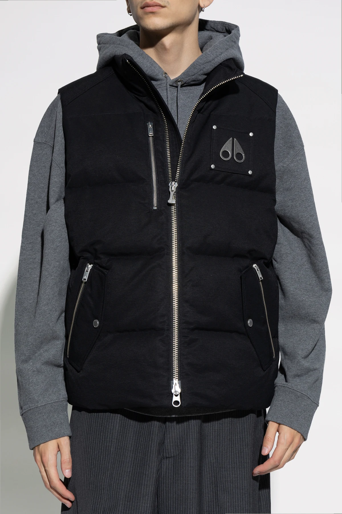 The Westmount vest from the exclusive men's clothing collection by Moose Knuckles epitomizes elegance and functionality. Made from the highest quality materials, it combines chic design with exceptional comfort. This vest, in a classic black color, impresses with its simple cut featuring a high collar that provides extra protection against the cold. The outer layer consists of an excellent blend of cotton and nylon, while the interior is entirely made of nylon, ensuring durability and lightness. The down and feather filling offers unparalleled thermal insulation. The characteristic metal emblem in the shape of two droplets is located on the left chest, attached with four metal rivets, giving the vest a unique character. The practicality of the product is highlighted by three zippered pockets: one vertical chest pocket and two side pockets secured with additional buttons. The zipper running the full length of the front adds elegance and functionality, while the simple back with a single metal decorative element emphasizes the product's minimalist style. The Westmount vest is the perfect choice for cooler days, performing excellently in both casual and more elegant outfits. Why buy this product? High-quality craftsmanship from excellent materials. Elegant, classic design suitable for many outfits. Exceptional thermal insulation, perfect for cooler days. Practical zippered pockets. Distinctive details highlighting the product's uniqueness.
