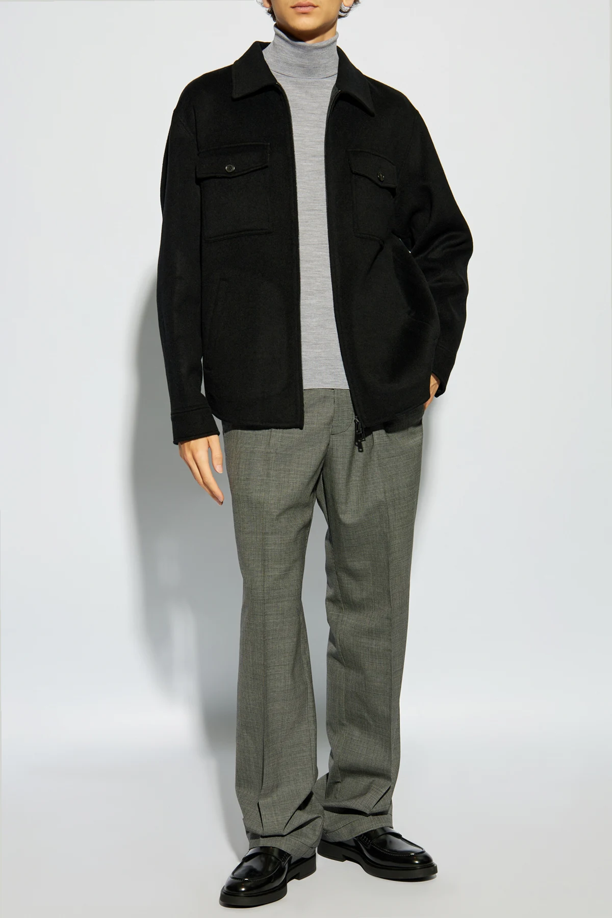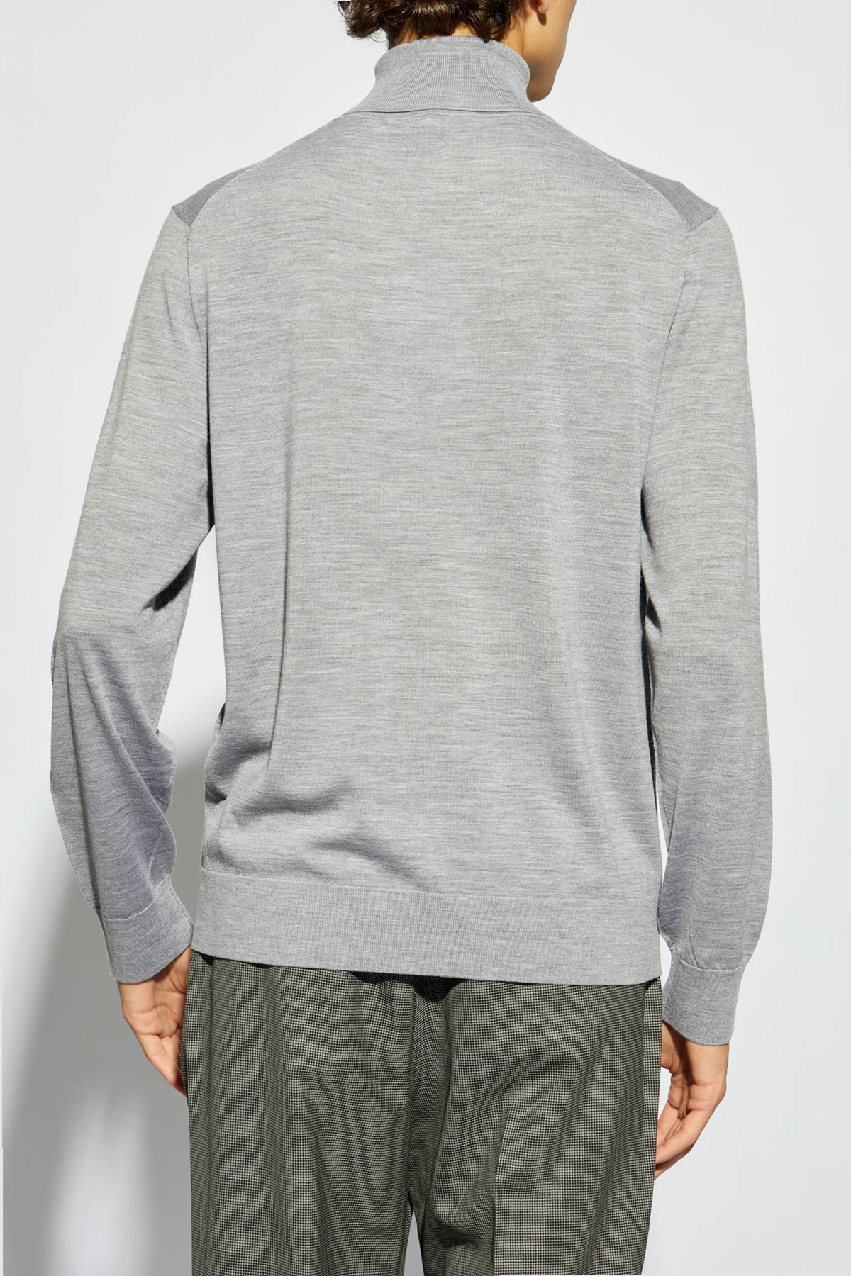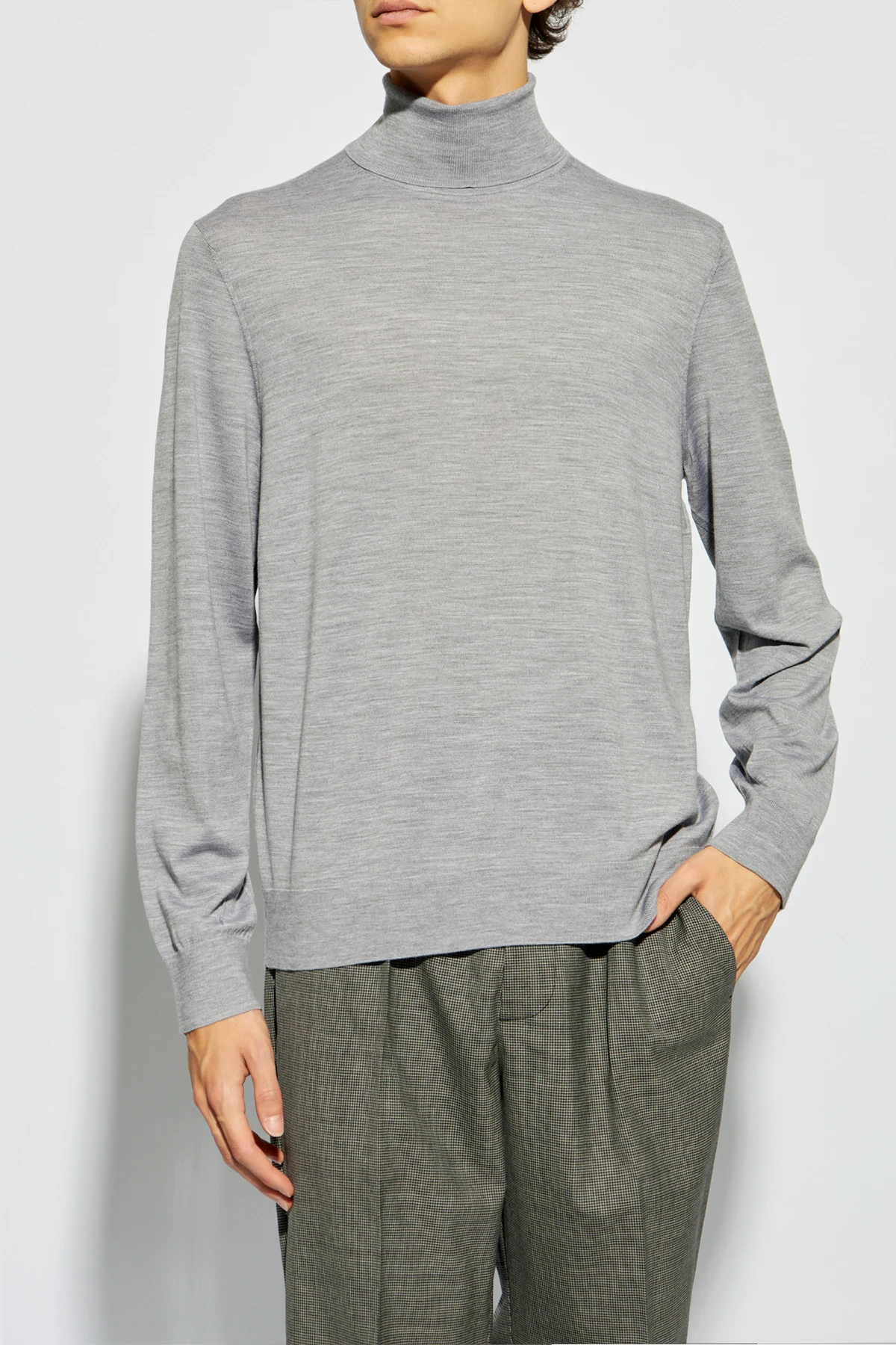 Introducing the epitome of refined elegance, the Theory Woolen Turtleneck in a sophisticated shade of gray. Crafted from a luxurious blend that primarily features wool with a hint of stretch material, this garment redefines comfort without compromising on style. Its classic cut, long sleeves, and high, ribbed turtleneck offer warmth and a sleek silhouette, ensuring a timeless look for any wardrobe. The turtleneck's fabric is thin, elastic, and exhibits a subtle ribbed texture, enhancing its aesthetic appeal with delicate, precise stitching visible at the collar. This attention to detail signifies the garment's exemplary craftsmanship. In keeping with a minimalist design philosophy, the turtleneck is devoid of any conspicuous branding, with designer credentials discreetly located, likely on the inner label, allowing its quality and design to speak volumes. Its neutral gray hue ensures versatility, making it an effortless complement to a variety of outfits, embodying the exclusive apparel's focus on material quality and construction over transient trends. Why Purchase This Product? Exceptional Craftsmanship: Impeccable stitching and a refined ribbed texture showcase the garment's superior quality. Minimalist Design: Free of external logos, this turtleneck champions a sophisticated, understated aesthetic. Versatile Styling: Its neutral color and classic silhouette make it a versatile addition to any fashion-forward wardrobe. Luxurious Composition: Made from a high-quality blend with a predominance of wool, it promises warmth and comfort with a touch of elasticity for the perfect fit.