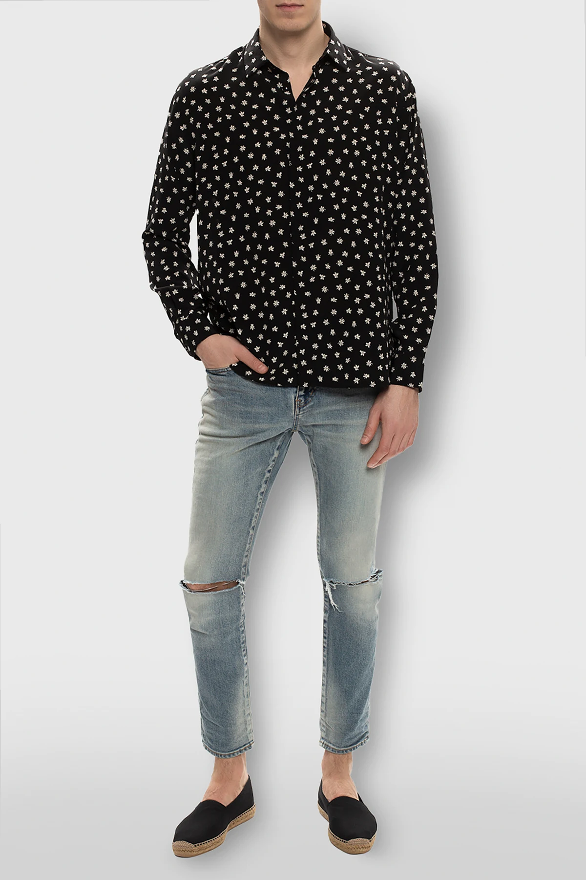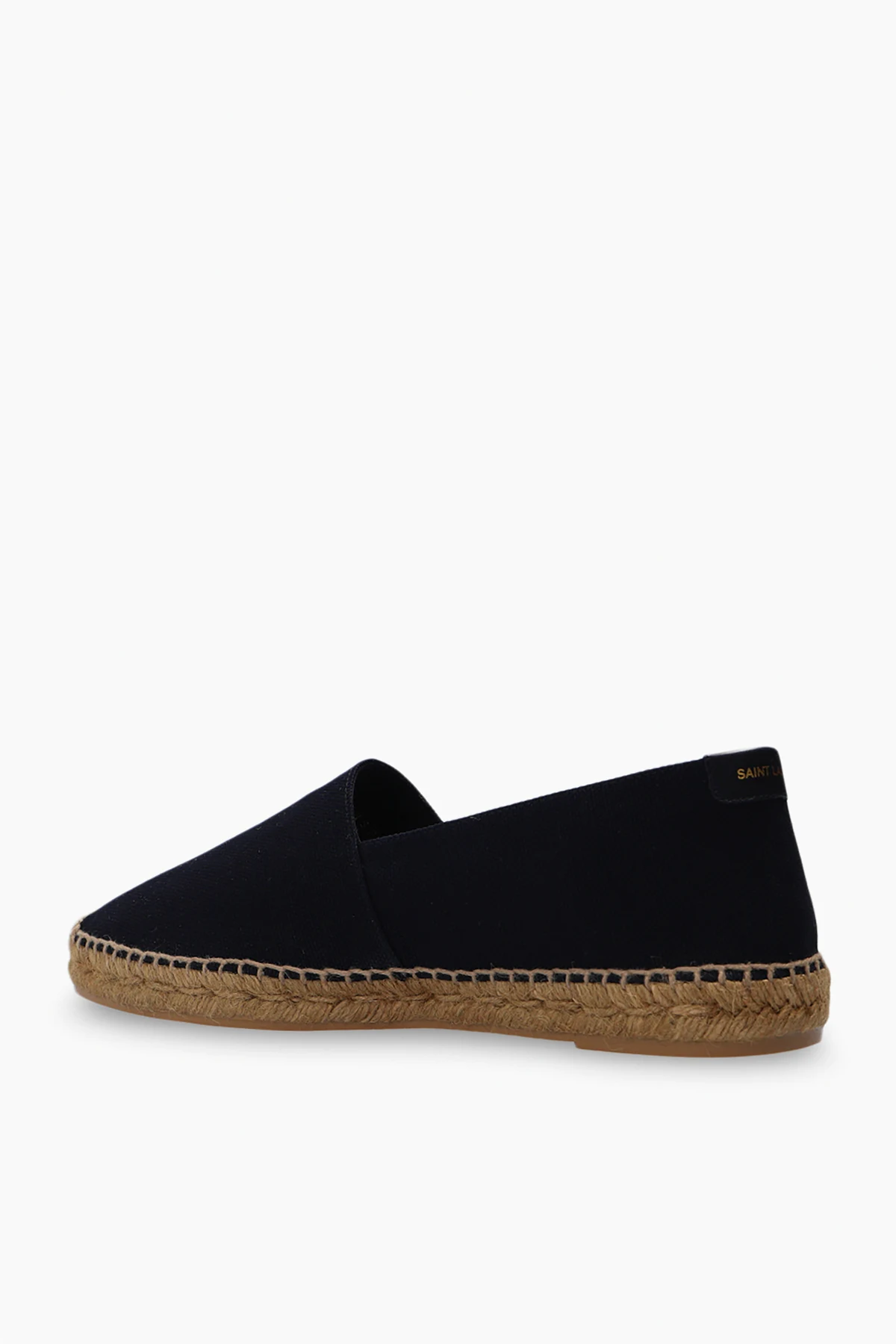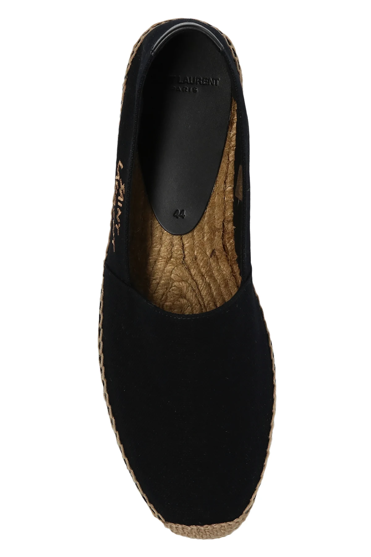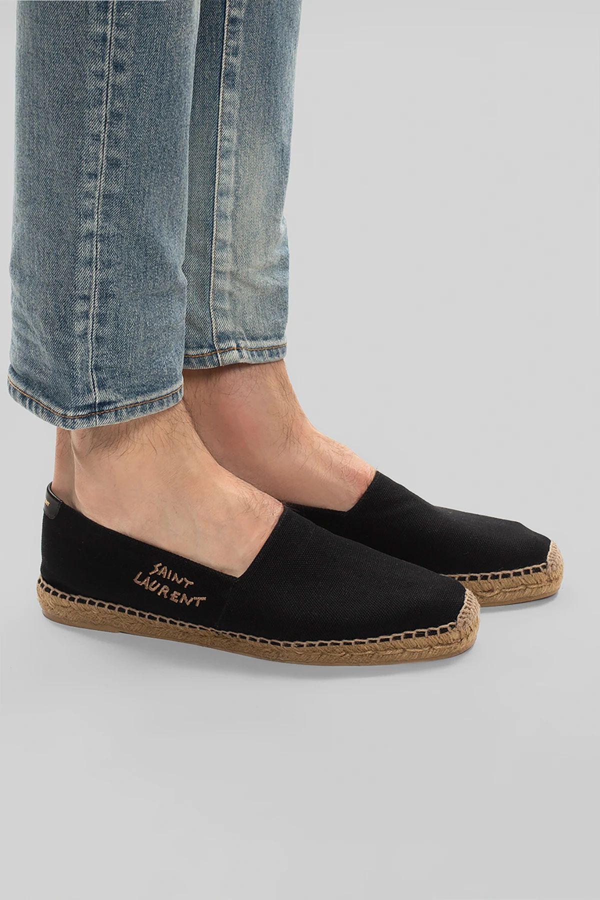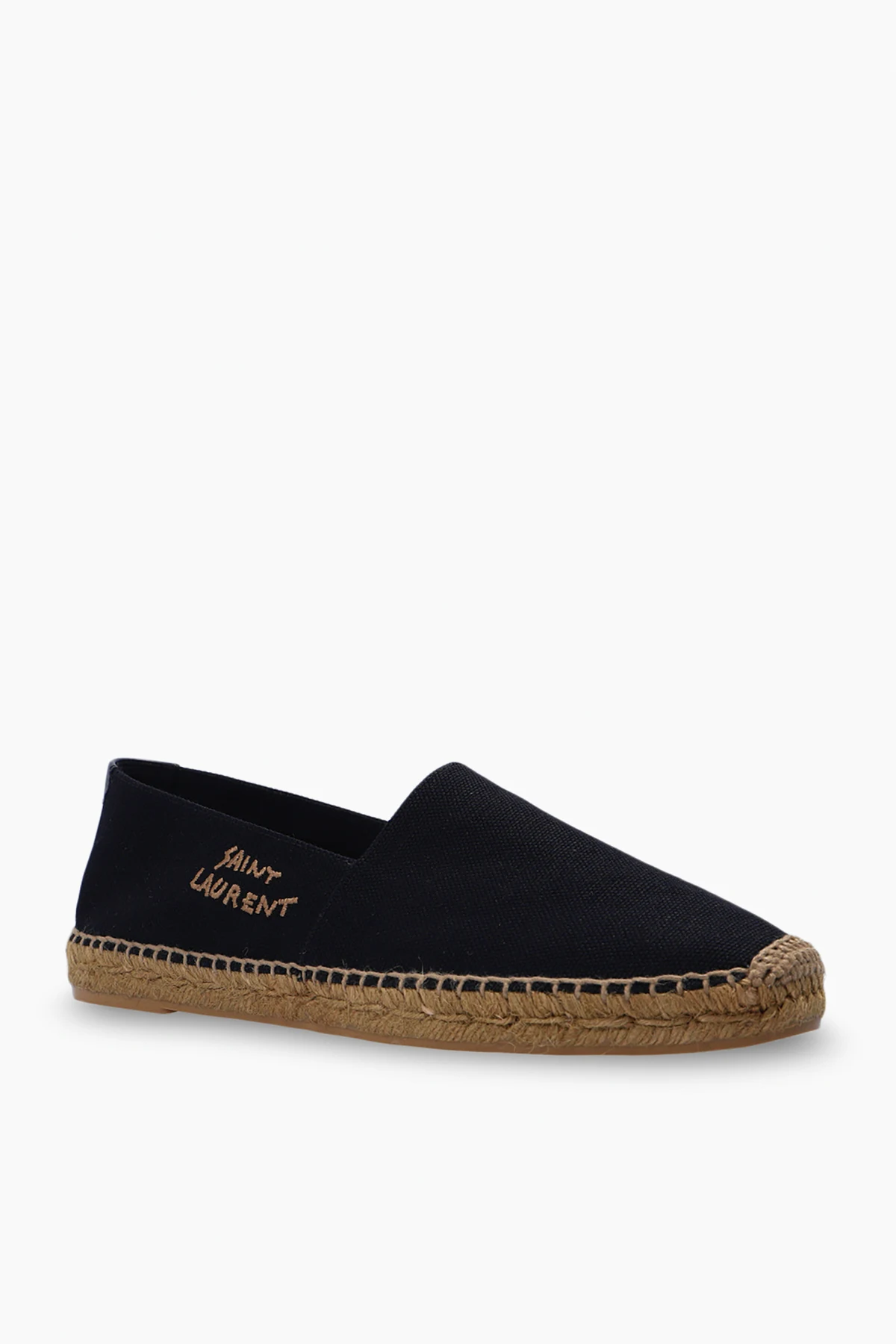 Black espadrilles from Saint Laurent. Set on a beige rubber sole, this design features an embroidered logo pattern in brown.