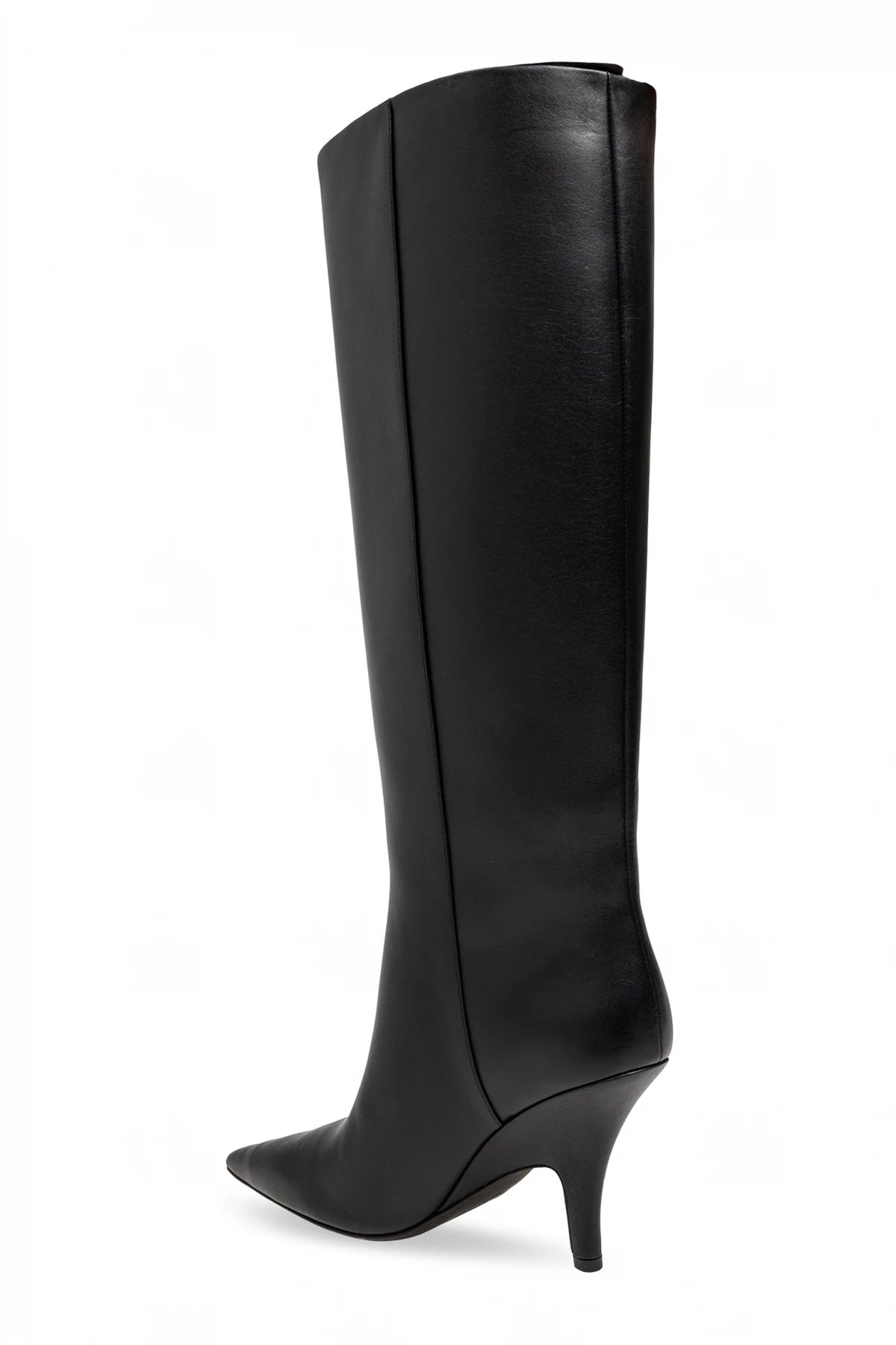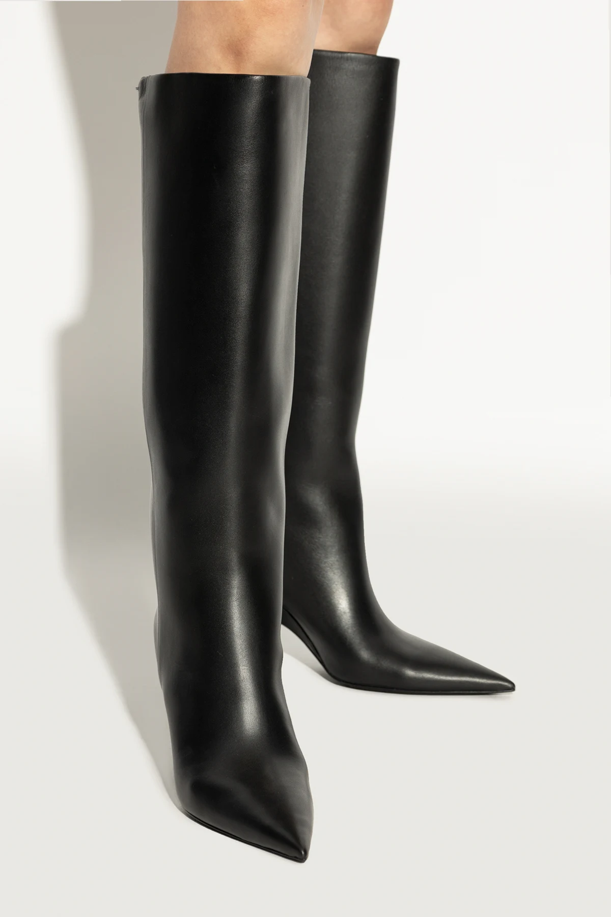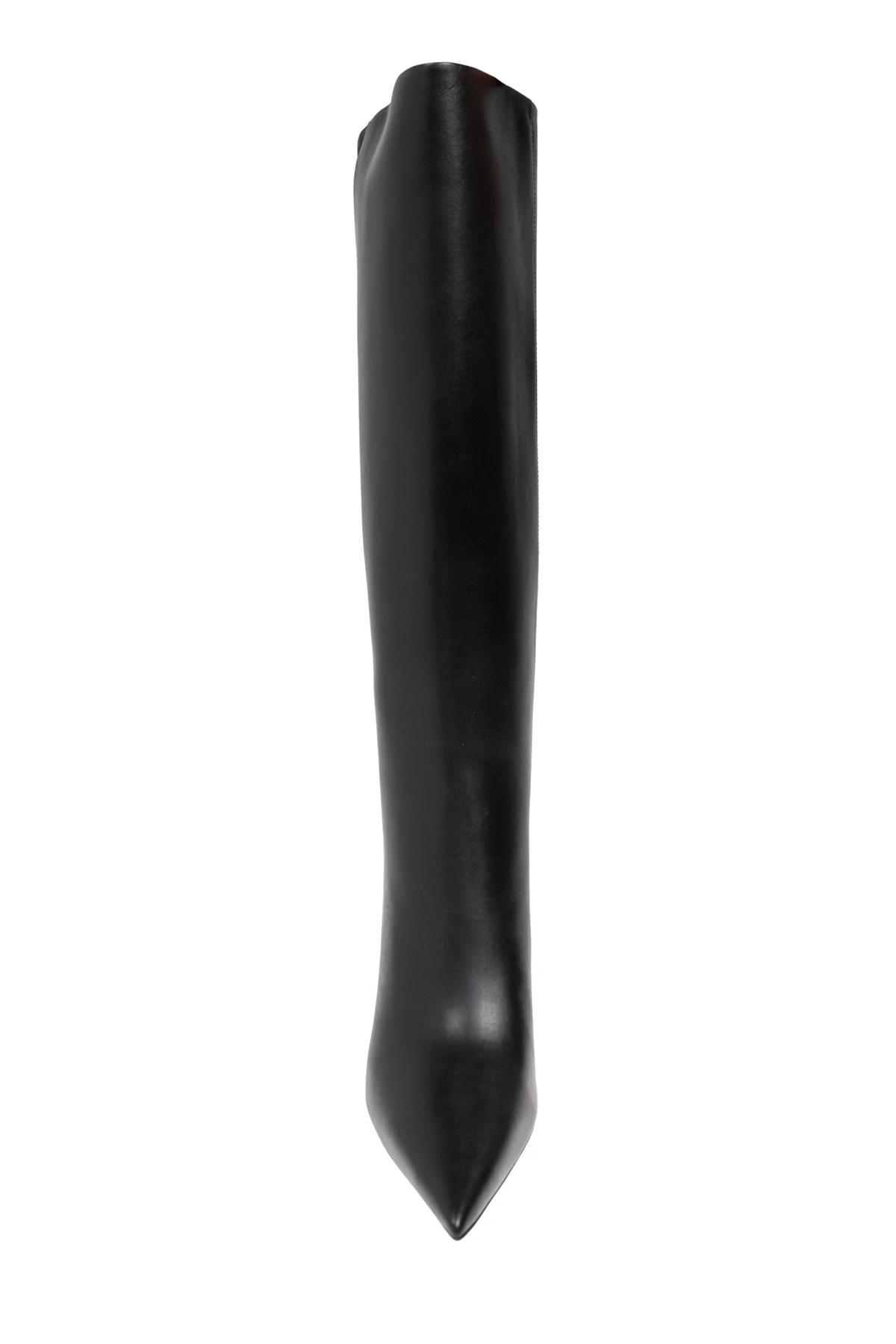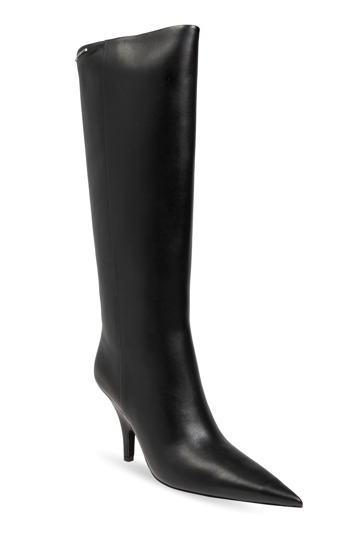 Introducing the Leather Knee-High Boots by the illustrious designer Alexander Wang. These boots epitomize sophistication with their classic, elegant design and minimalist allure. Crafted from premium leather, they promise enduring quality and a polished appearance. The boots feature a sleek, high shaft that reaches the knee, exuding timeless elegance. The smooth, unembellished surface enhances their modern aesthetic. Equipped with a slender, high stiletto heel, these boots effortlessly elongate the silhouette, adding a touch of grace to any ensemble. The pointed toes further accentuate their refined style, making them a versatile addition to any wardrobe. The dominant black color ensures these boots are a versatile staple, seamlessly complementing various outfits. The knee-length design is both practical and fashionable, perfect for any occasion, from sophisticated gatherings to everyday wear. Why Choose These Boots? Timeless Elegance: Classic design with a high shaft and pointed toes. Premium Quality: Made from high-grade leather for durability and style. Versatile Color: Dominant black hue, easy to pair with any outfit. Elevated Style: Slim stiletto heel for an elongated, graceful look. Renowned Designer: Created by the esteemed Alexander Wang.