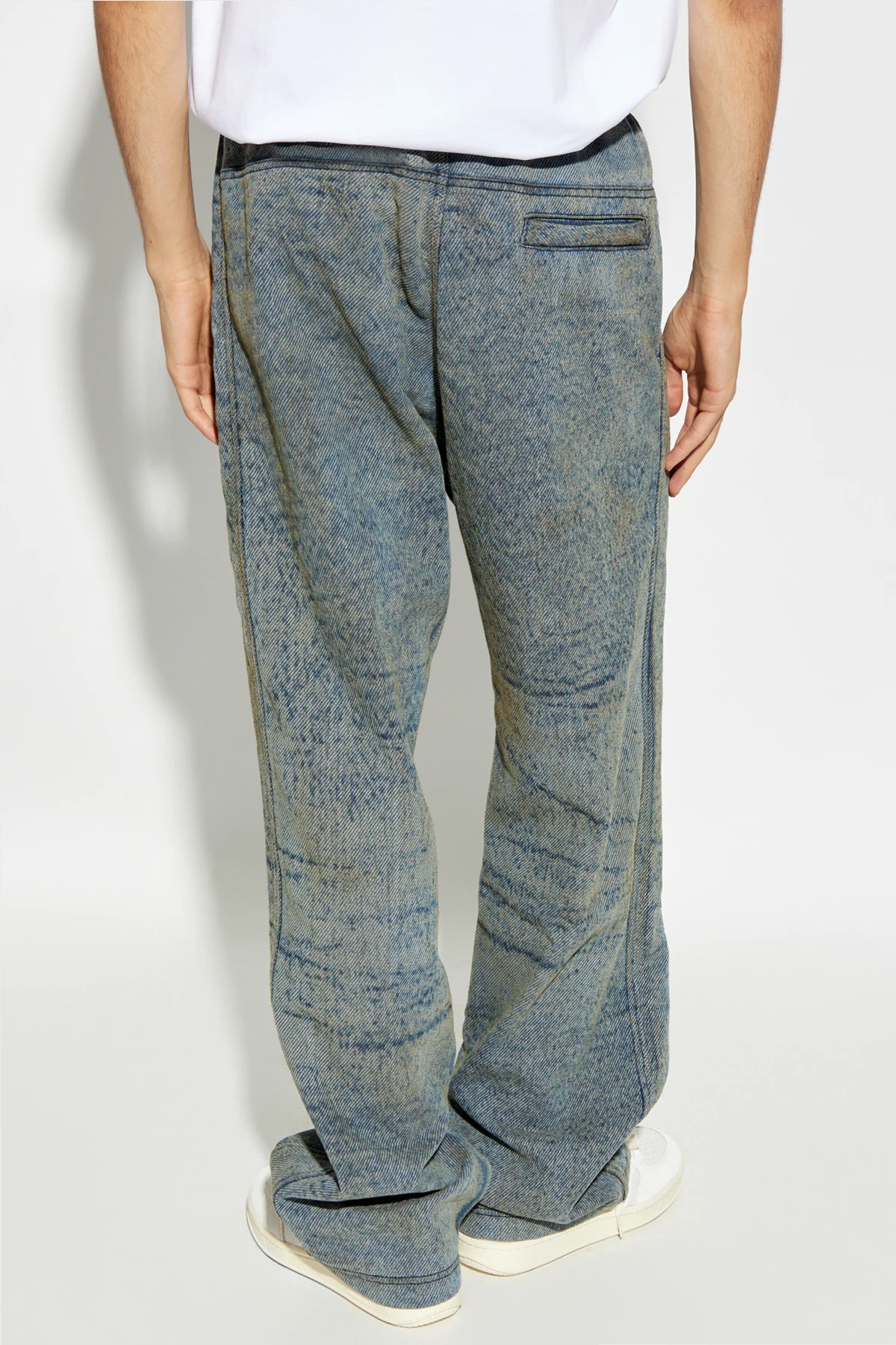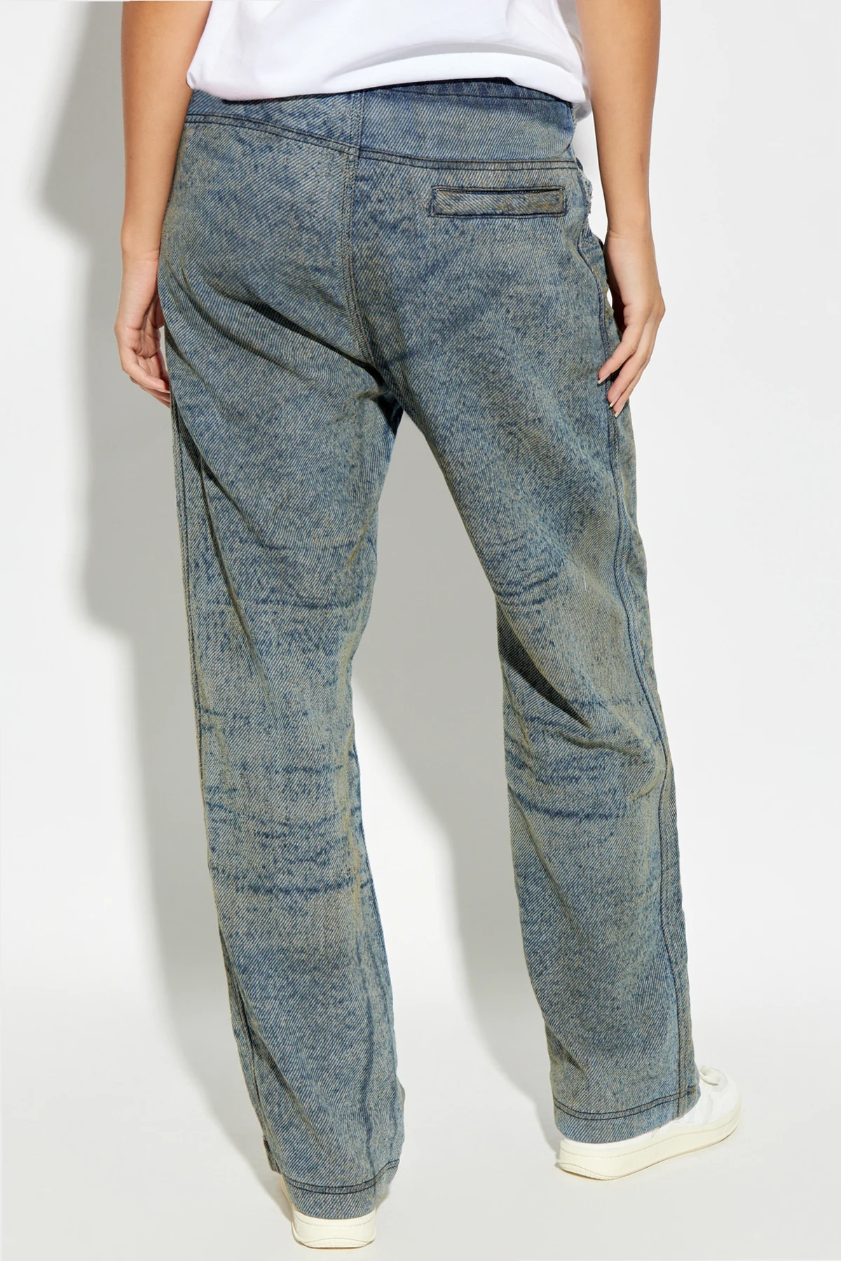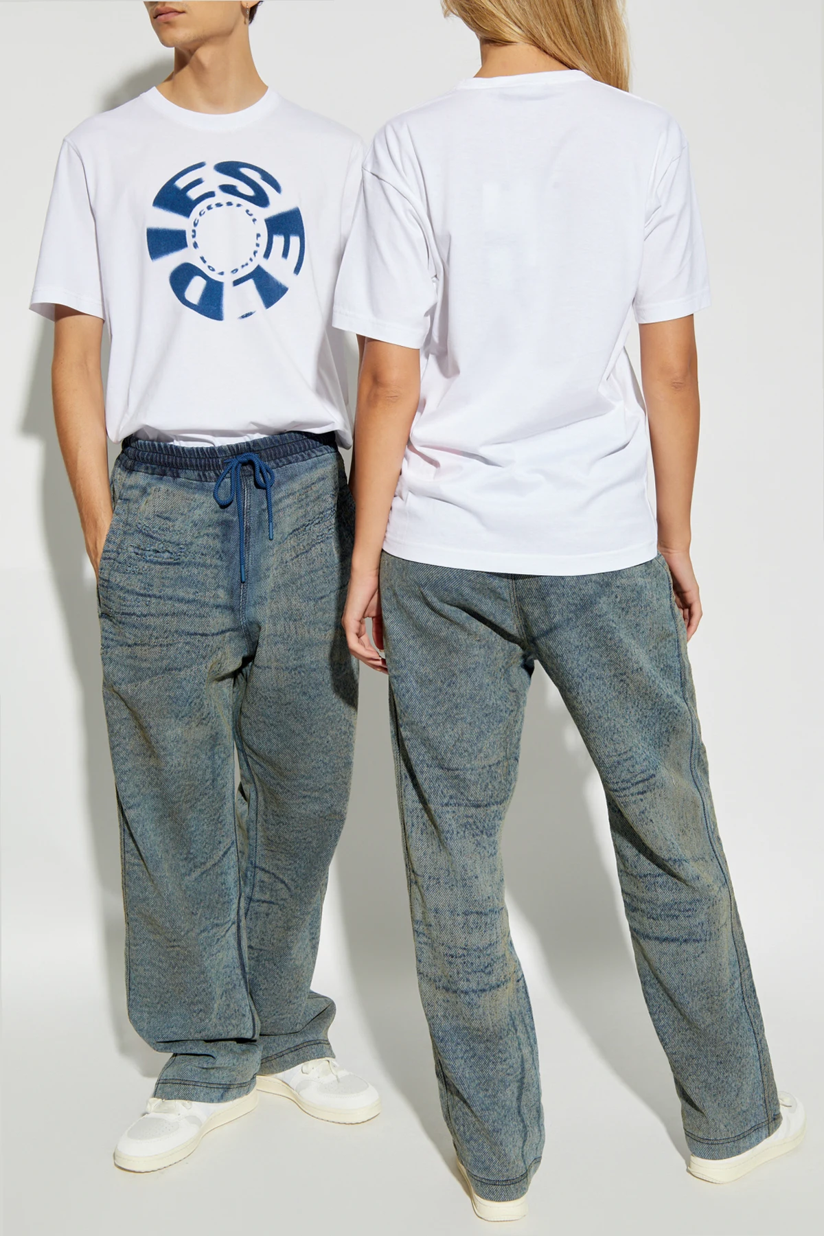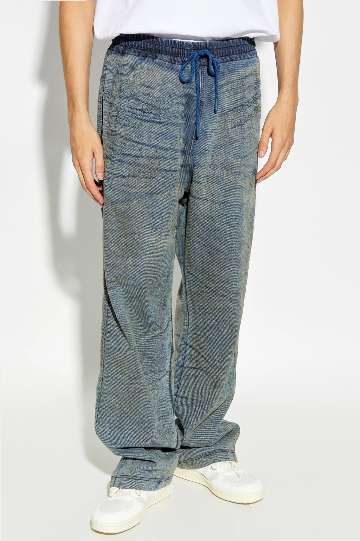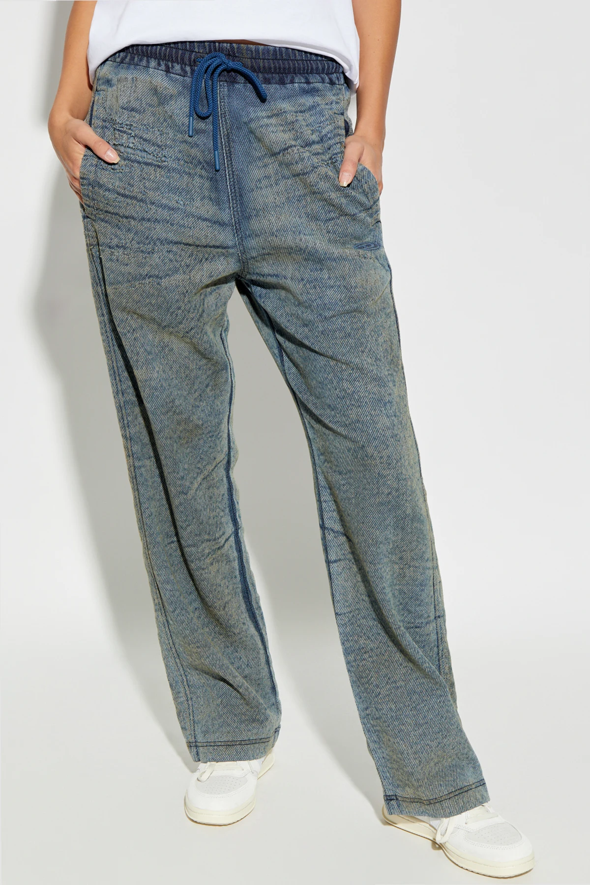 Presenting the D-MARTI-FSF pants from the exclusive collection by the renowned designer, Diesel. These pants epitomize effortless elegance and versatile style, suitable for both women and men, offering a truly unisex appeal. Crafted from a luxurious blend of cotton, polyester, and elastane, these pants boast a texture reminiscent of denim with a distinctive striped pattern. The dominant blue hue is subtly accentuated by beige tones, creating a sophisticated color palette. The loose, casual fit ensures comfort and style, while the elastic waistband with an adjustable drawstring provides a perfect fit every time. Practicality meets elegance with two front slip pockets and a rear pocket adorned with a discreet closure. Adding to their exclusivity, a subtle embroidered designer logo graces the front of the pants. The legs are finished with a simple hem, maintaining a clean and polished look. Why Choose This Product? Luxurious material blend offering comfort and durability. Versatile unisex design suitable for various occasions. Practical pockets for everyday convenience. Exclusive designer detailing for a touch of sophistication. Adjustable waistband for a customized fit.
