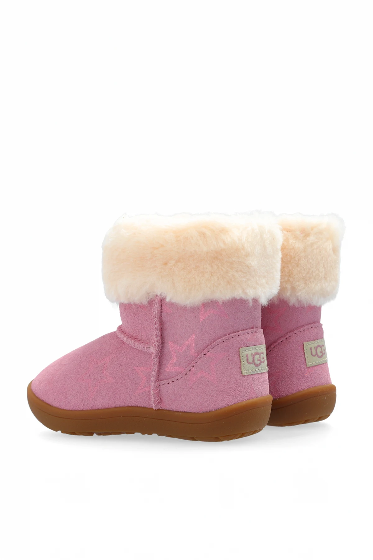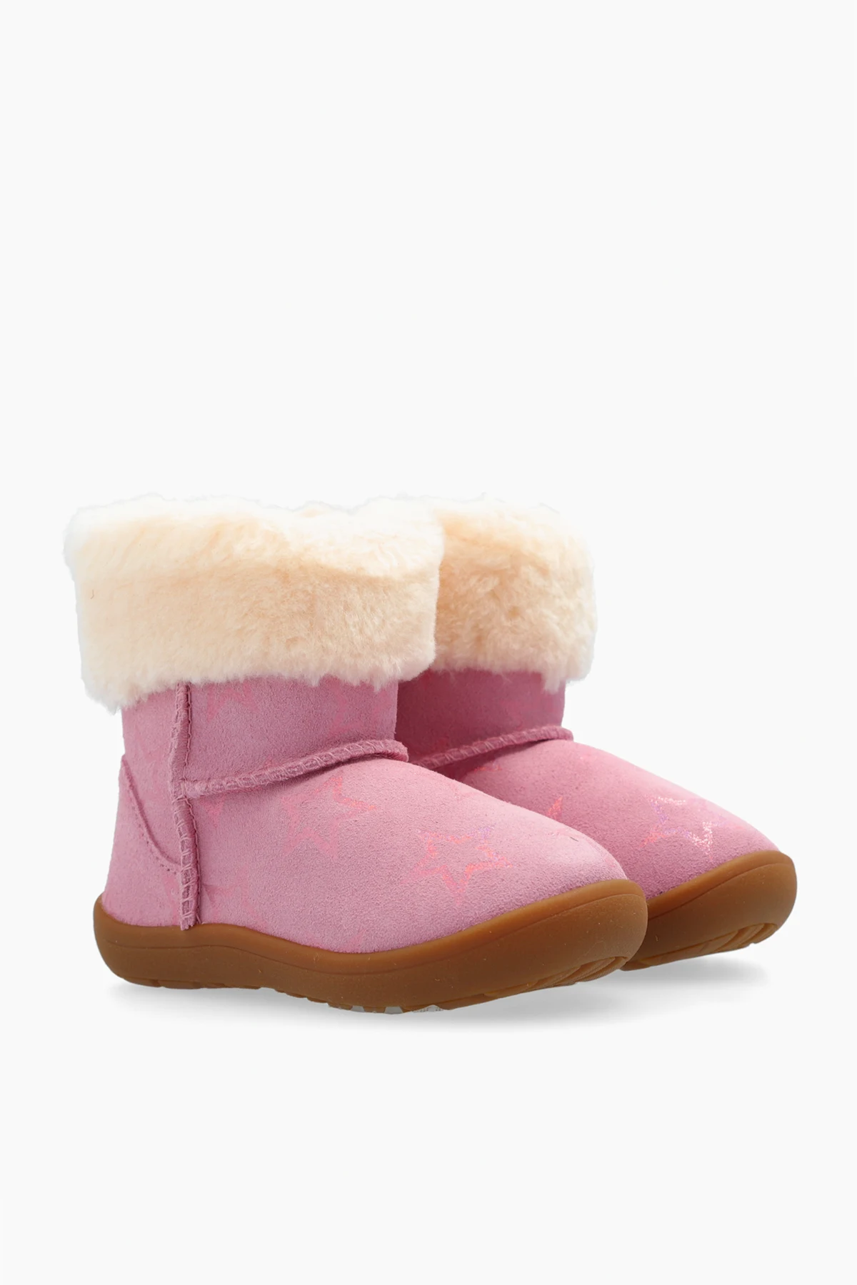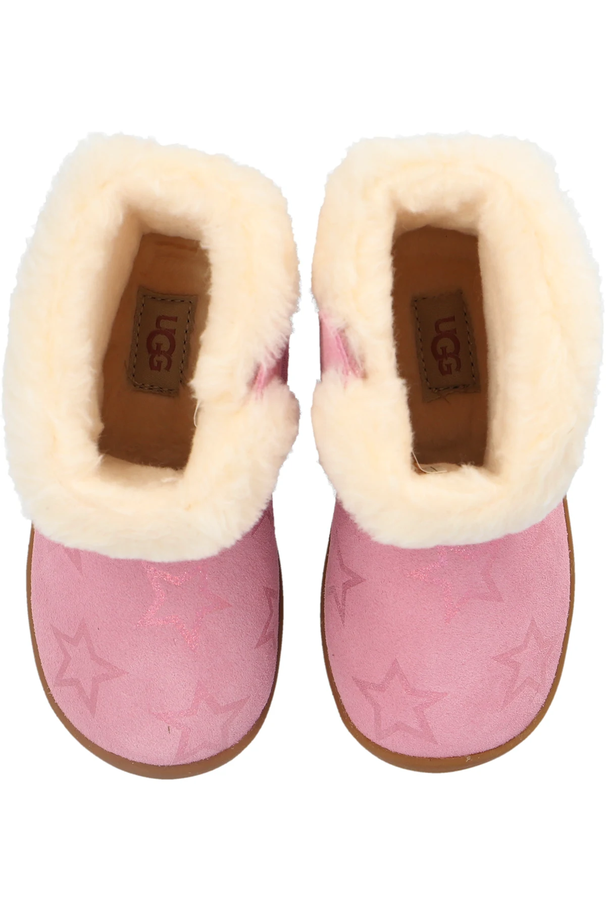 Introducing the exquisite Sammee Iridescent Stars snow boots, a hallmark of UGG Kids' exclusive collection. These meticulously crafted children's boots boast a classic design with a broad, rounded toe and a high shaft, epitomizing both style and functionality. Adorned with a delicate star pattern, these snow boots exude an unparalleled charm. The exterior is fashioned from a pink material reminiscent of luxurious suede, while the interior is lined with soft, plush fur in a light hue, ensuring warmth and comfort during the coldest days. The prominent UGG logo on the back signifies the prestigious nature of this brand. Equipped with a robust rubber sole in a sophisticated brown shade, these boots offer superior traction on slippery surfaces. The dominant pink color imbues these boots with a girlish and fashionable appeal, further accentuated by the elegant fluffy fur trim at the top of the shaft. Why Choose This Product? High-Quality Materials: Crafted from premium suede, wool, lyocell, and rubber. Unique Design: Delicate star patterns and luxurious fur lining. Comfort and Warmth: Plush interior ensuring optimal warmth and comfort. Durability: Sturdy rubber sole for excellent grip and longevity. Brand Prestige: Iconic UGG logo symbolizing exclusivity and quality.