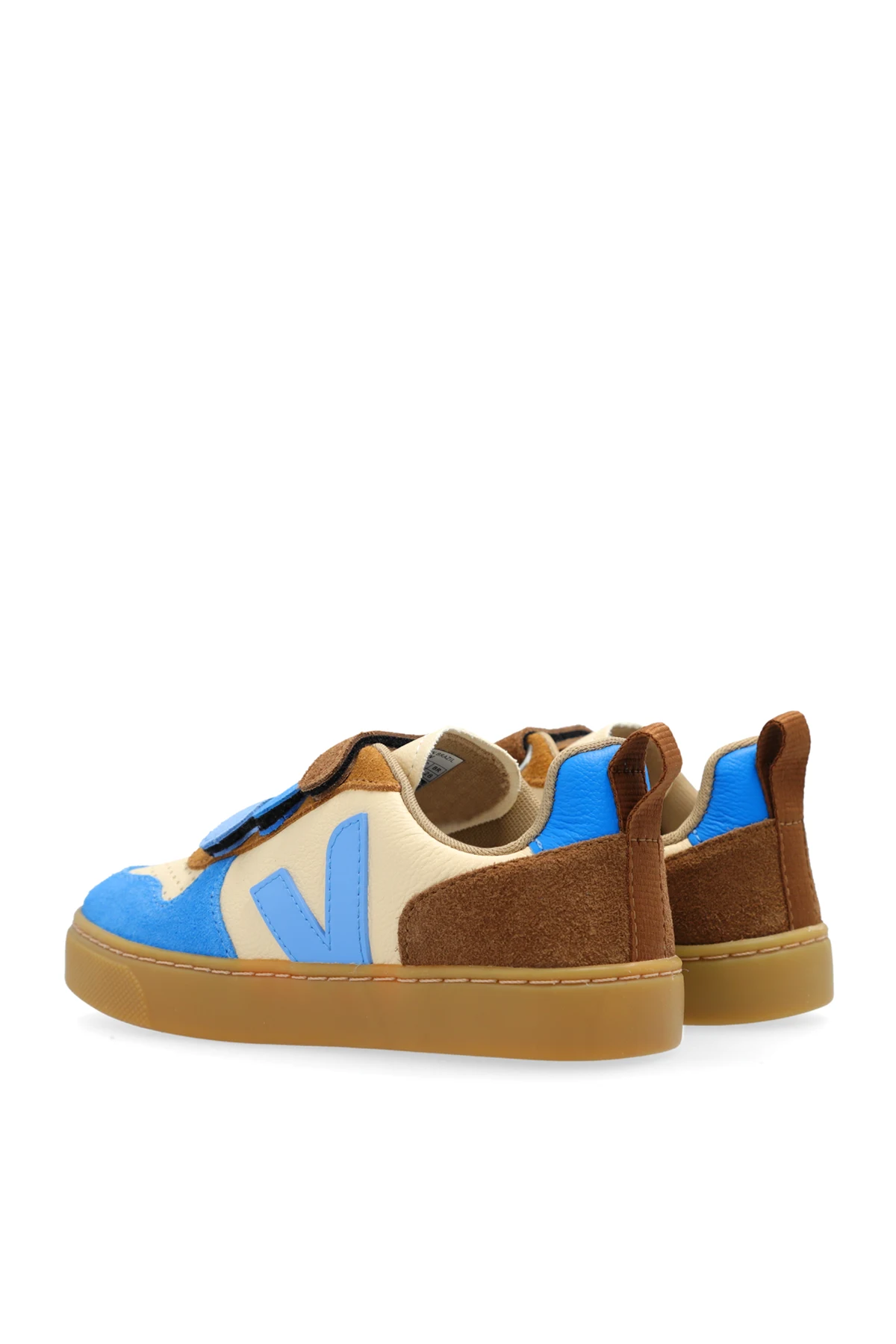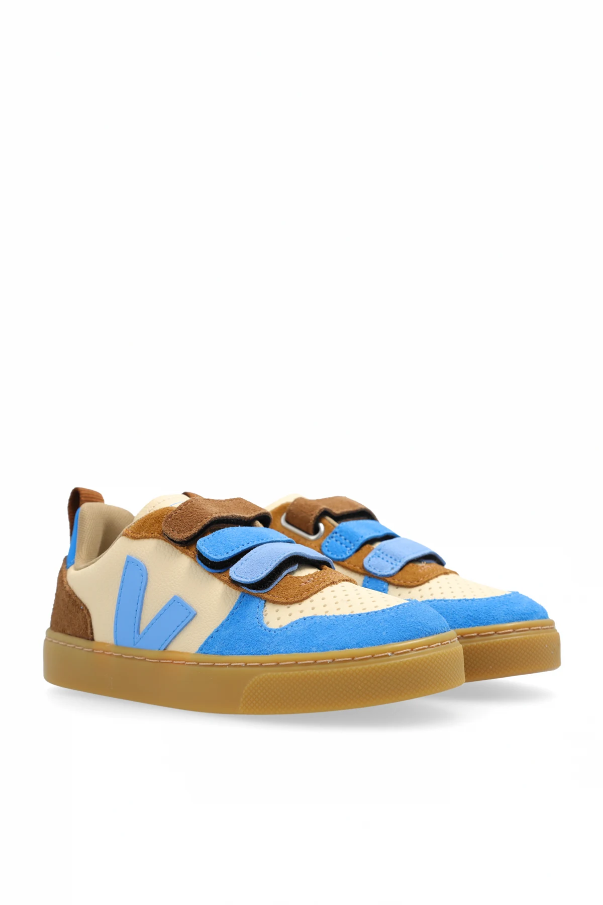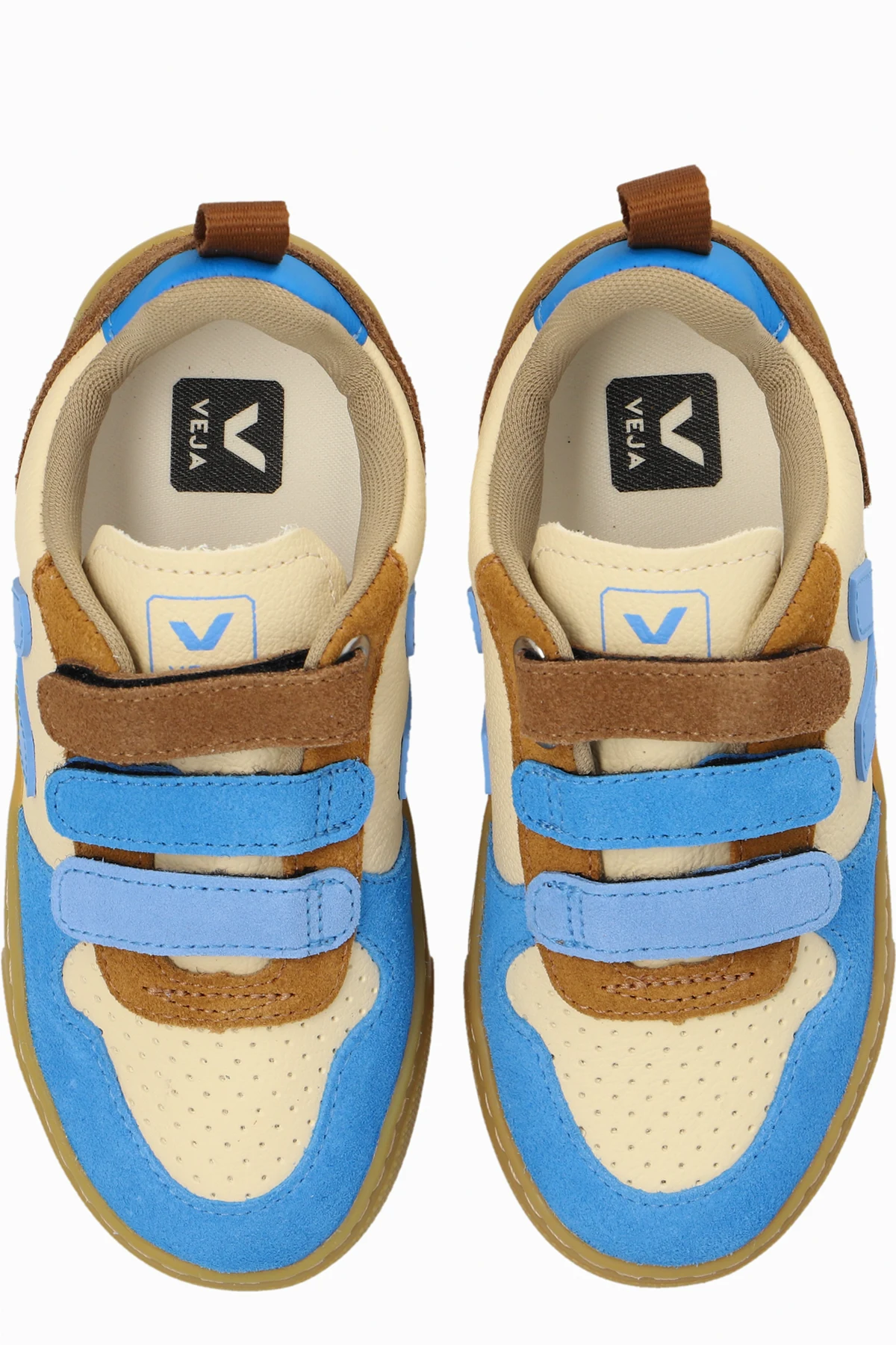 Introducing children's sports shoes from the Veja brand, model V-10. These exceptional sneakers feature a classic shape with a low-cut silhouette, and their dominant color is multicolor, with predominant shades of blue, brown, and beige. The upper part of the shoes is made from a combination of suede leather and perforated leather, giving them a unique appearance and ensuring durability. Two Velcro straps in blue and brown colors make them easy to put on and take off, while the distinctive blue "V" logo on the side panels highlights their uniqueness. A light brown rubber sole guarantees excellent grip and durability. Additionally, there is a Veja logo patch on the tongue and a practical loop on the heel. Why is it worth buying this product? Made from eco-friendly materials Renowned Veja brand Stylish and modern look Comfortable and easy to put on Perfect for everyday wear and physical activities
