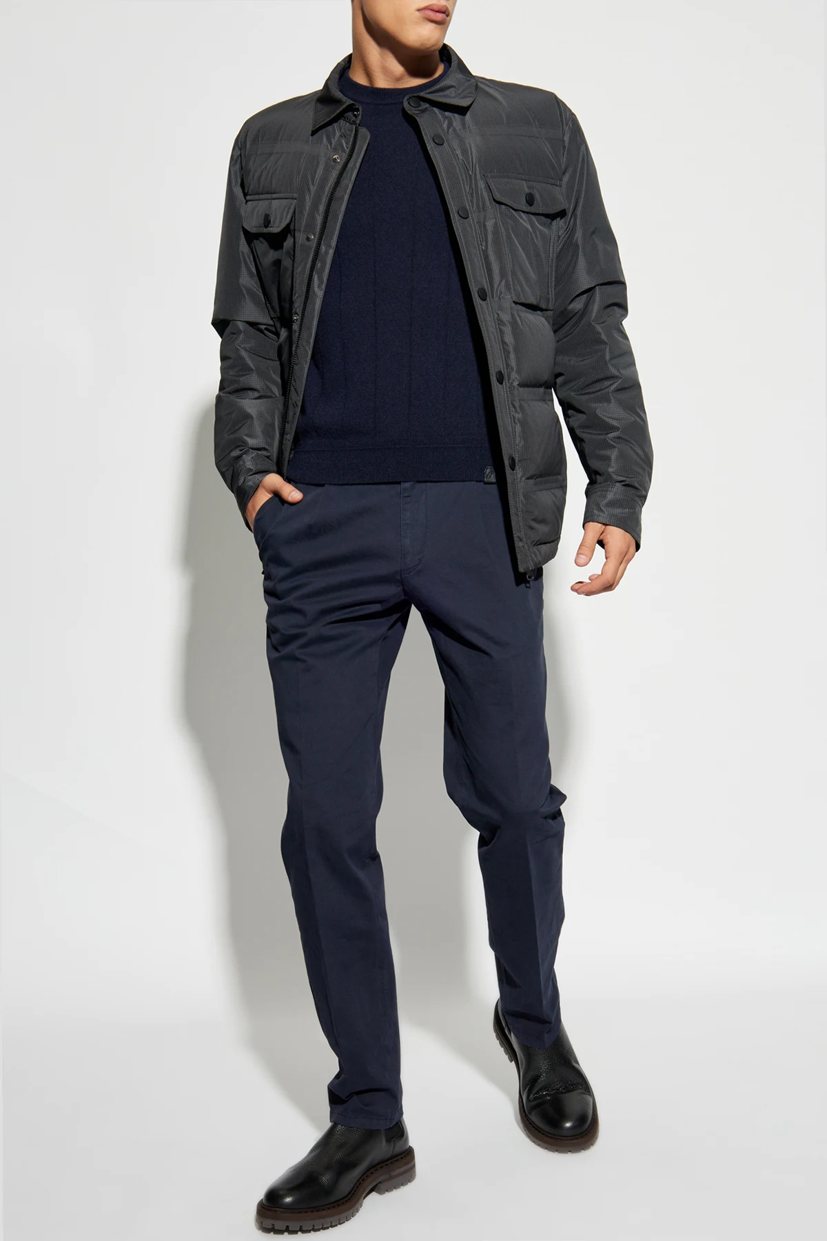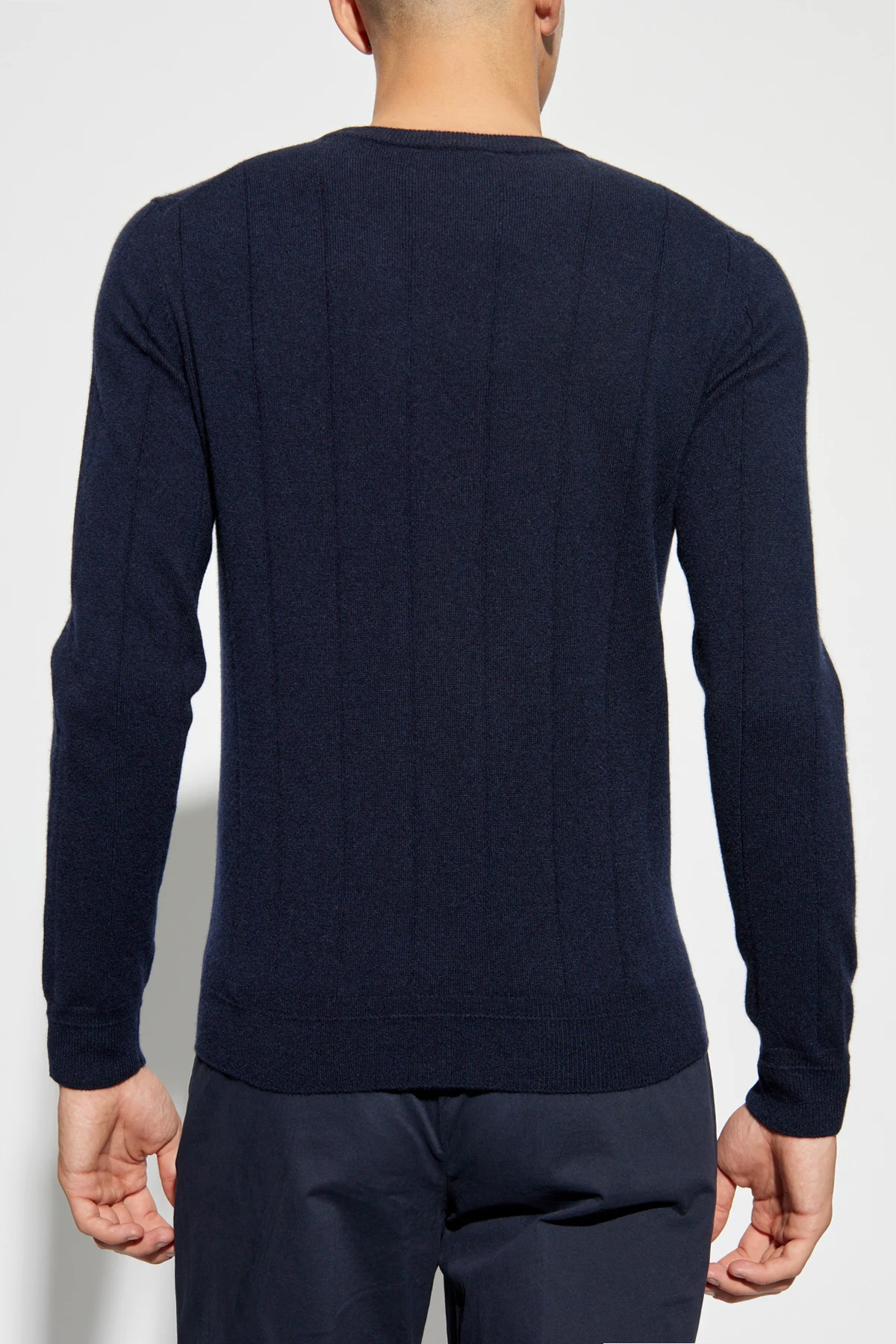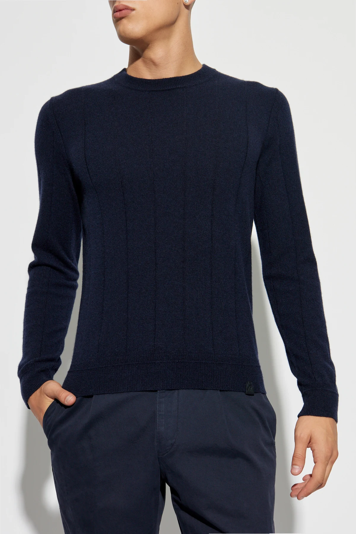 Presenting the Cashmere Sweater by the illustrious house of Brioni, a name synonymous with luxury and sartorial excellence since 1945. This exquisite navy sweater epitomizes timeless elegance and meticulous craftsmanship, crafted from the finest quality cashmere. The sweater features a classic silhouette with a round neckline, accented by subtle vertical stitching on both the front and back, adding an understated elegance to its design. The long sleeves and hem are finished with ribbed cuffs, ensuring a refined fit and a polished look. This navy masterpiece is adorned with a small leather-like label bearing the designer's logo, discreetly placed near the hem on the left side, exemplifying attention to detail and brand heritage. Why Choose This Product? Crafted from luxurious, soft, and comfortable cashmere. Elegant vertical stitching for a refined aesthetic. Ribbed cuffs and hem for a tailored fit. Exclusive designer label signifying premium quality. Versatile navy color, perfect for formal and casual occasions.